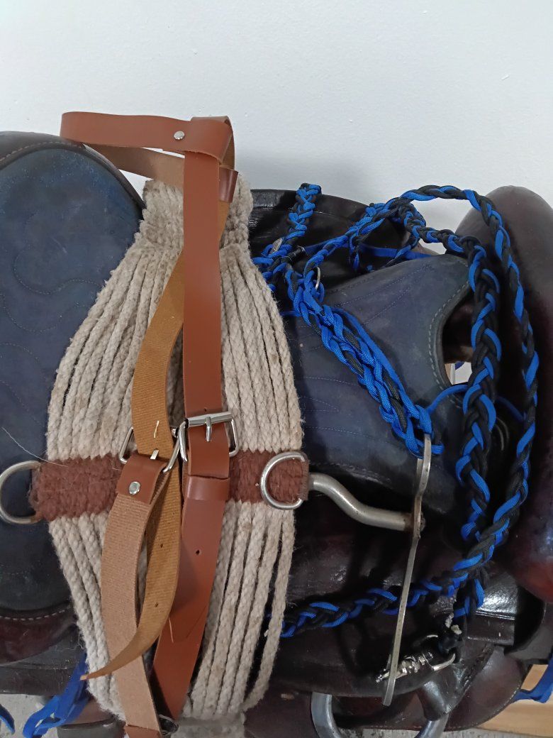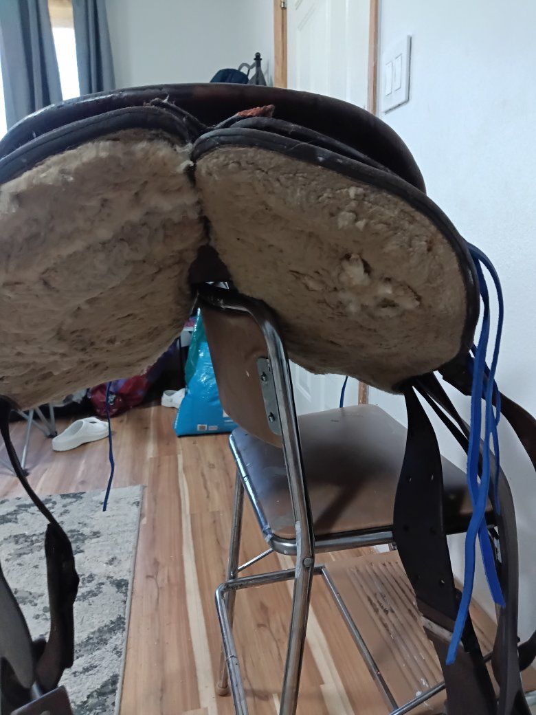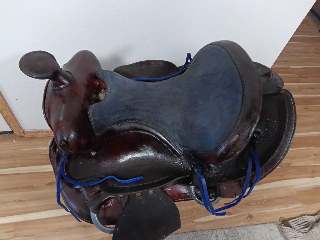 15 in simco saddle. comes with girth, paracord headstall curb bit, paracord reins and a thing headstall don't know much about the set up. I got it in a bundle.
