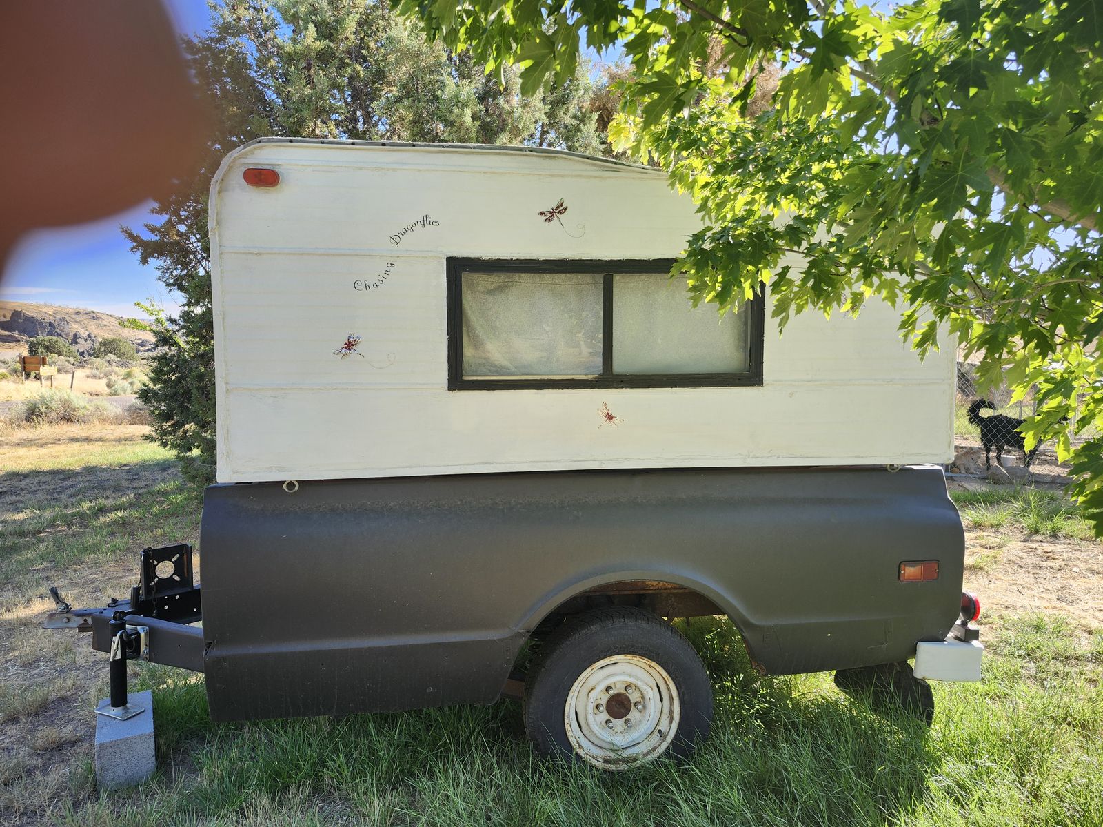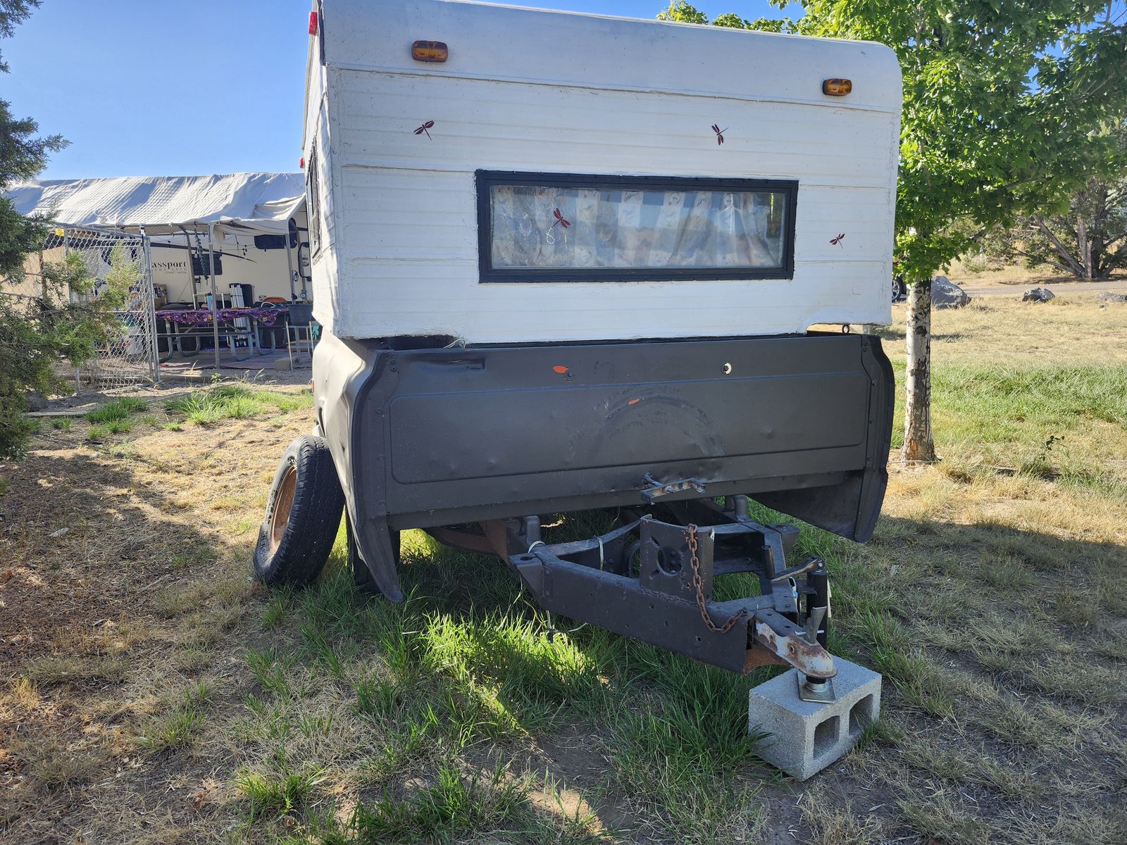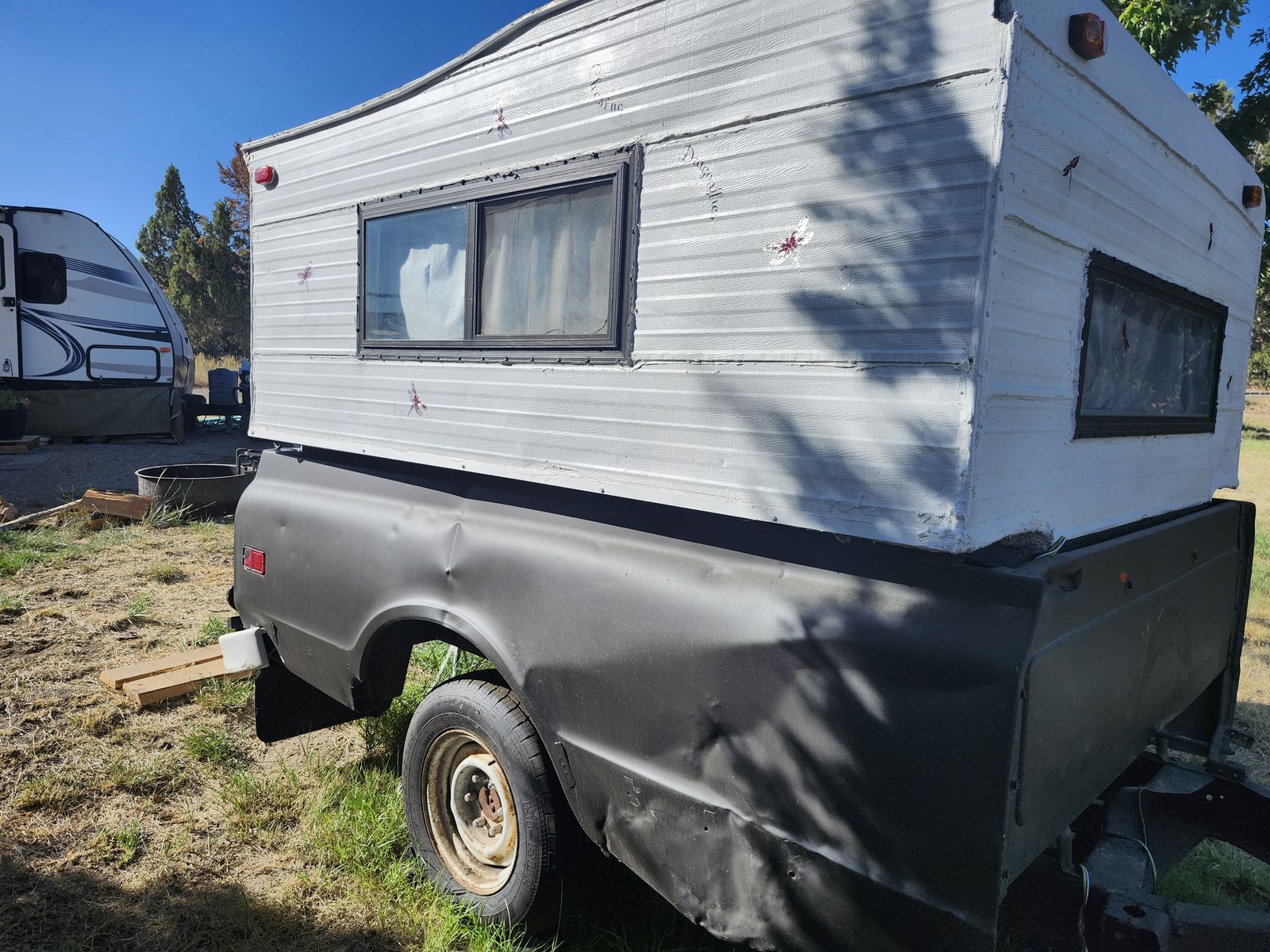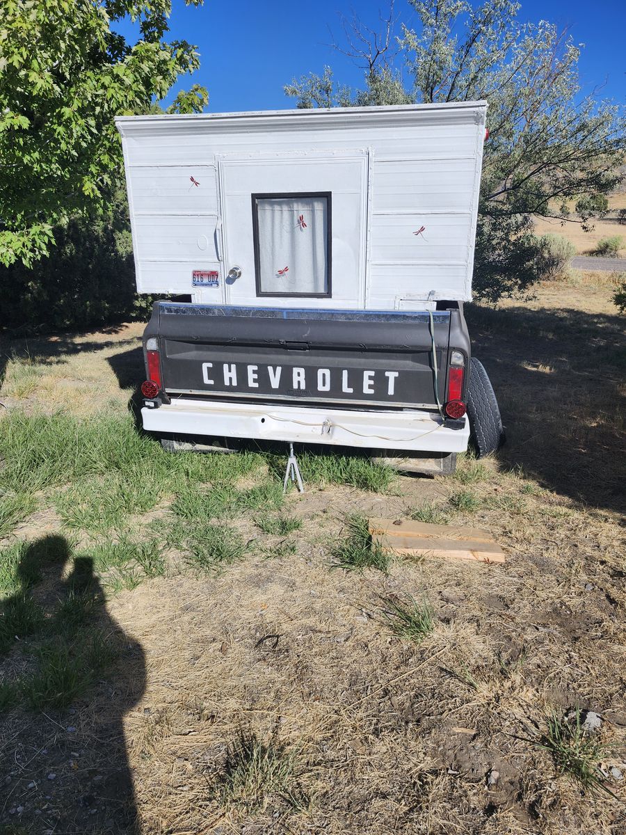Venmo'68 truck bed trailer with a fishing camper. Has new tires and leaf springs. Was working to have a small camper to visit kids. Life showed up and I need the money. Would like to recover for tire cost but will take best offer.