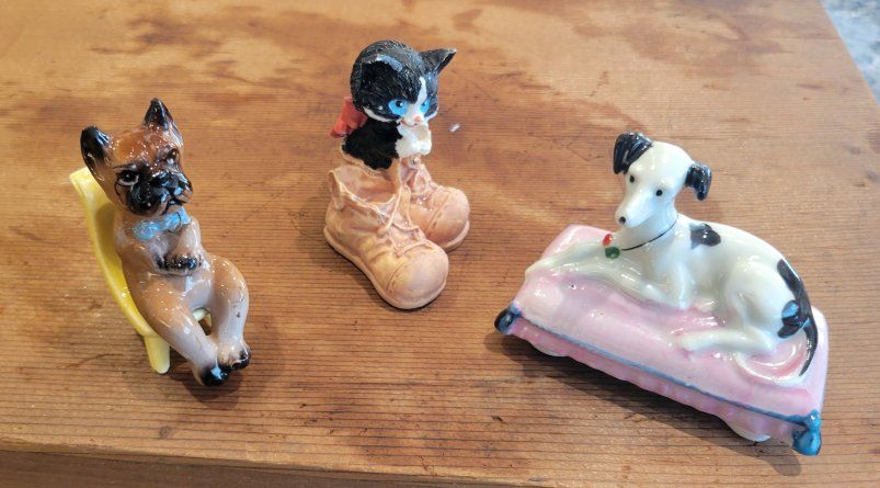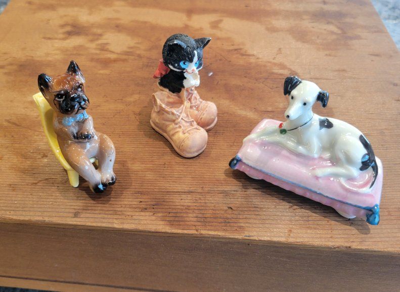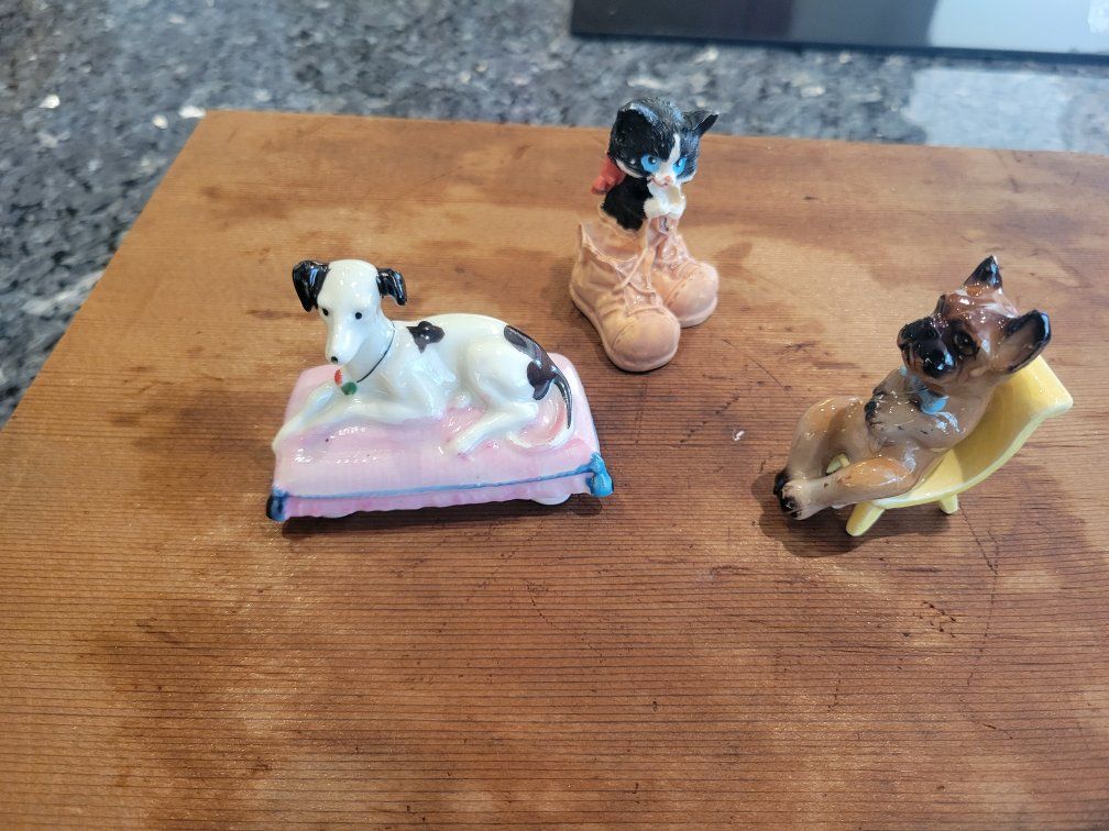 3 different vintage pet figurines. All 3 are included in the price. The yellow chair is missing 1 leg.