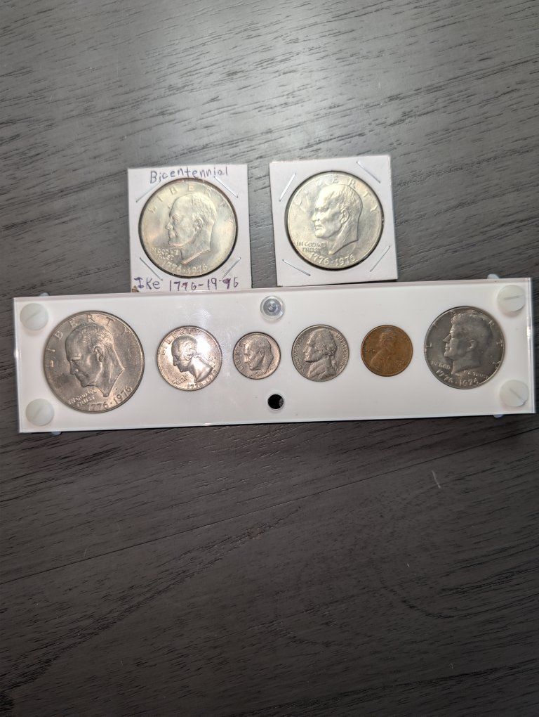 -Bicentennial and 1976 coin set...Dollar coin, half dollar coin, quarter, dime, nickle and penny.($15)