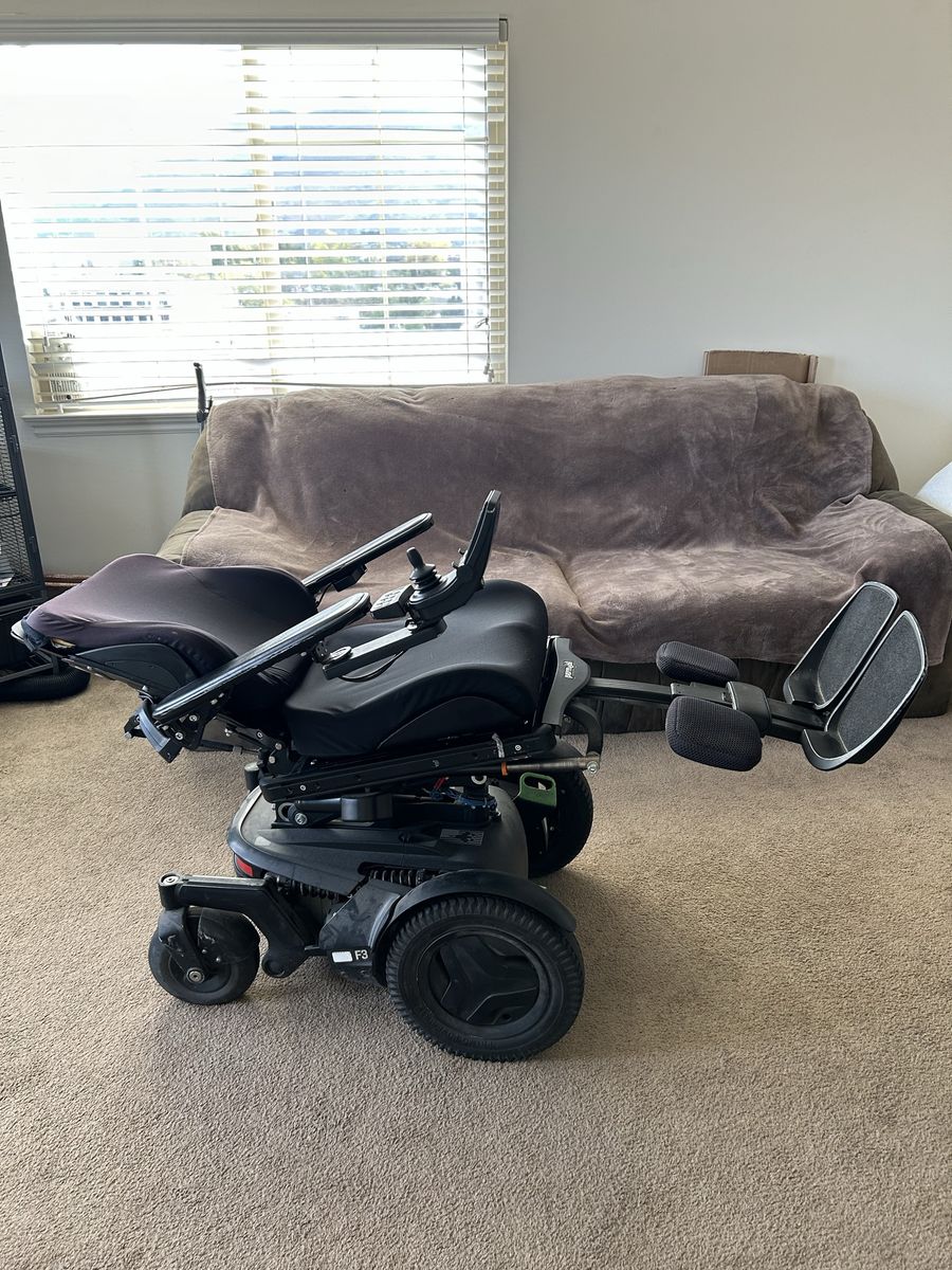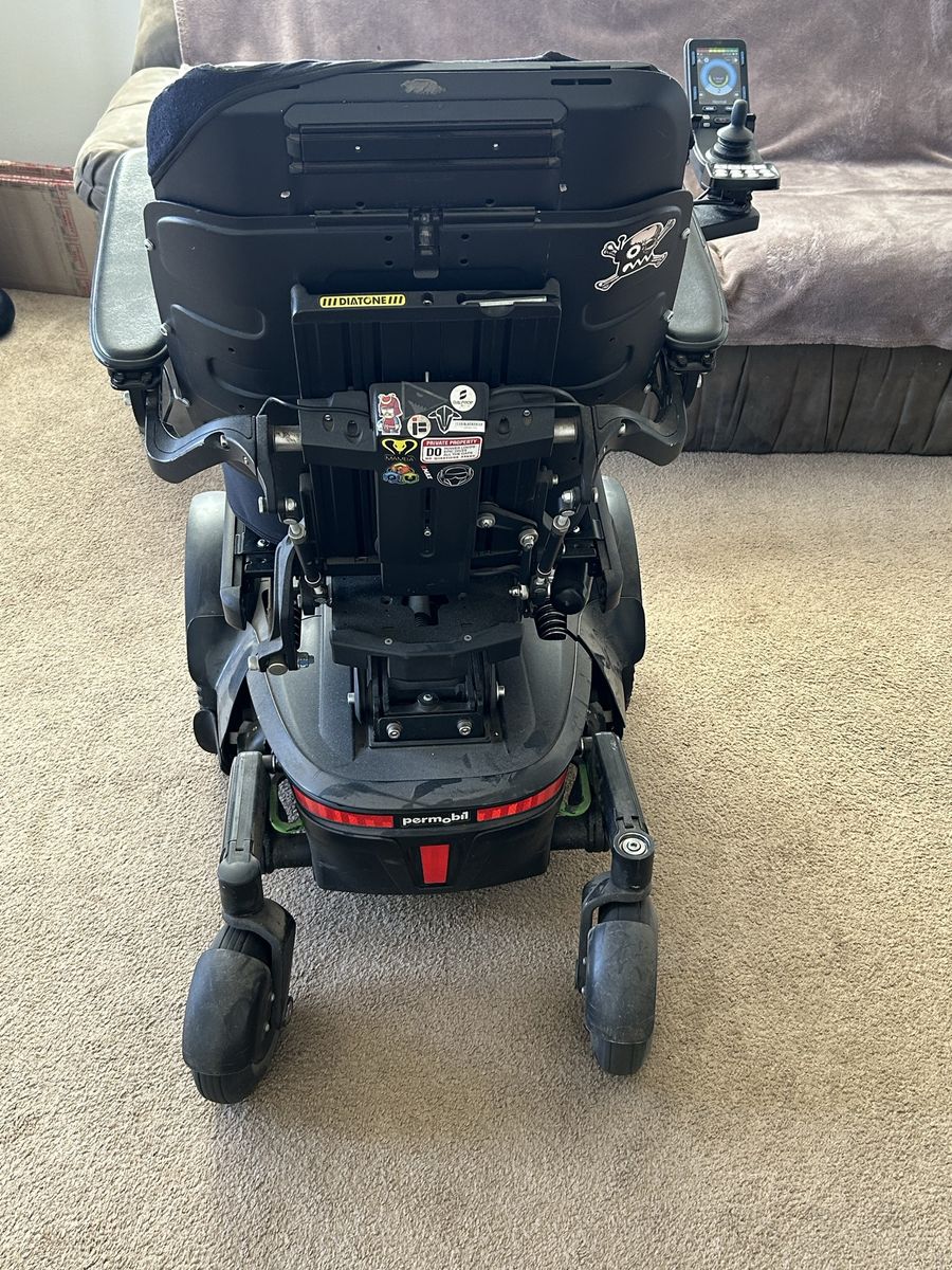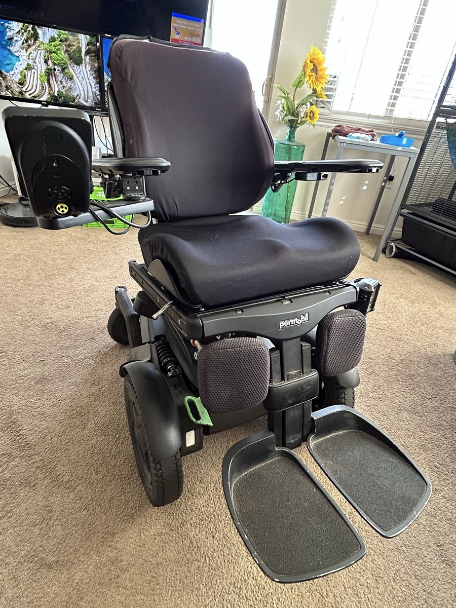 Top-of-the-line Permobil F3, super dependable. Power tilt & recline, two brand-new batteries, charger included. Built-in app connects to your phone for usage tracking, seating adjustments, and battery management. Built-in GPS and cellular let you locate and track it from another device. Great for personal use or fleet management.