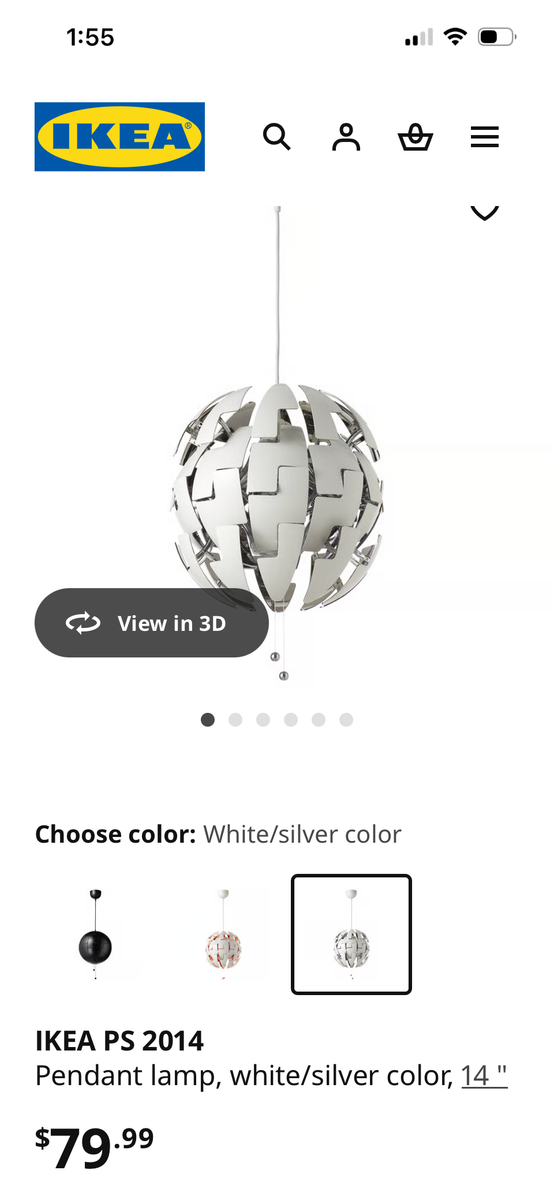 VenmoA very unique light fixture! This is the IKEA PS 2014 pendant lamp. White outside, silver inside. Opens up and looks a lot like the Death Star! Most places I've seen these offered, they are saying 14" in diameter, but this one is 18". It was $80 new, and I'm only asking $25. Happy to deliver in the Heber/Midway area, or I can meet up in Orem or Park City if that's helpful.