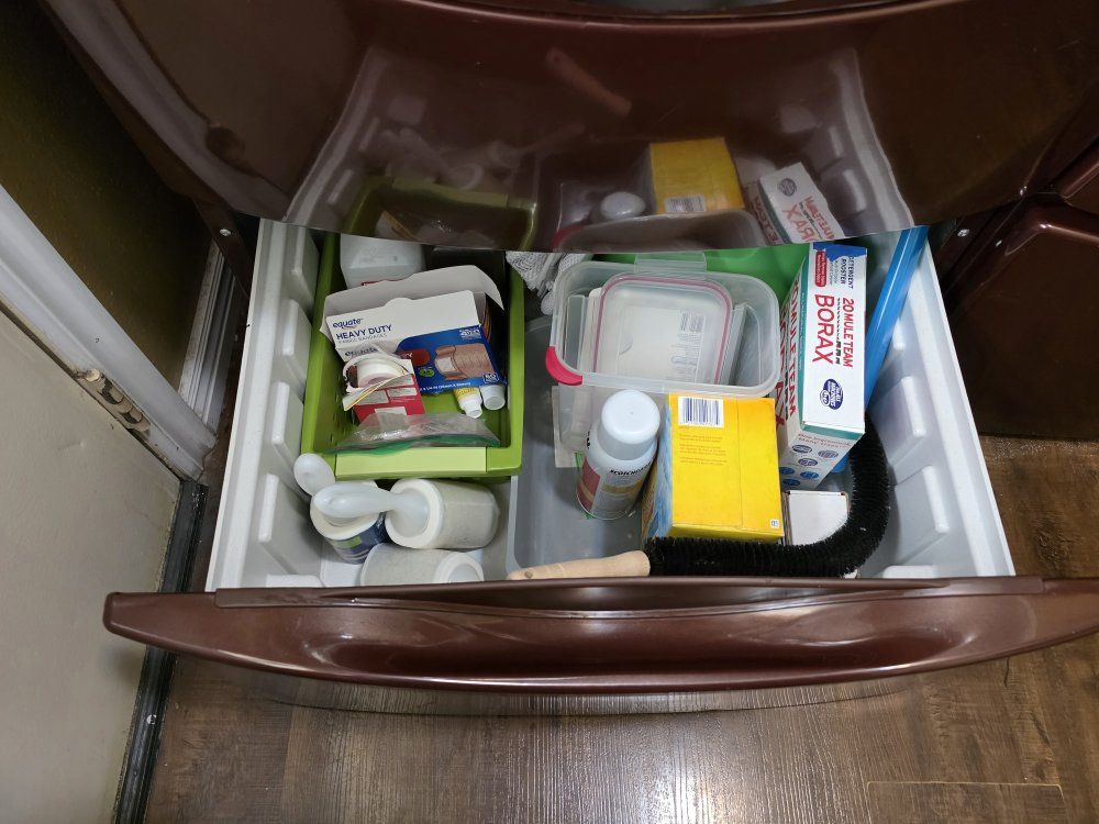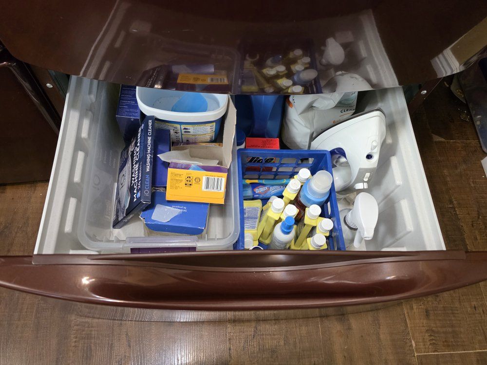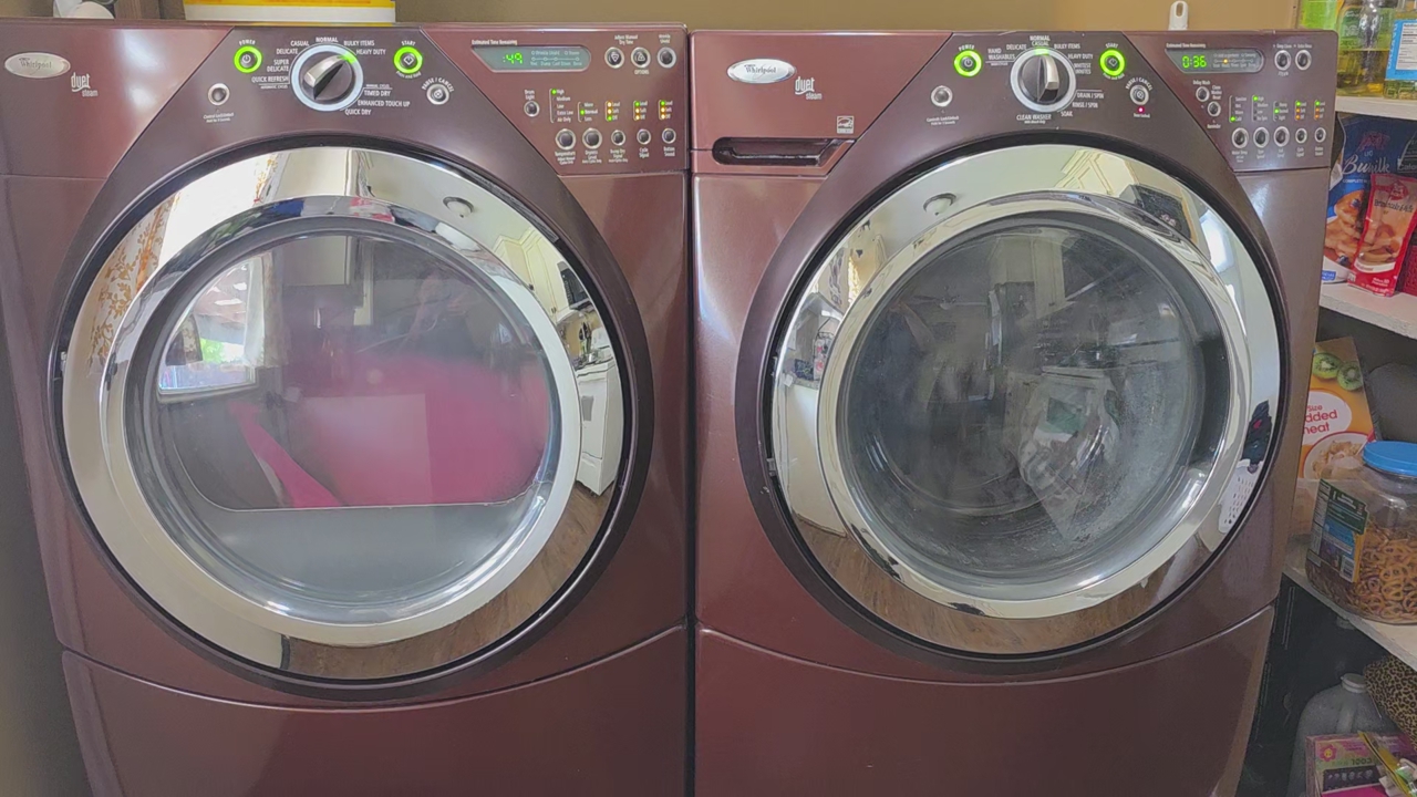 Maroon Whirlpool Dual Steam washer/dryer. Good condition and works well. Some scrapes and scratches, but nothing too bad. Washer is sanitized frequently and the dryer vent has been cleaned out within the last year. Comes with pedestal drawers which are great for storing your basic laundry and cleaning supplies.