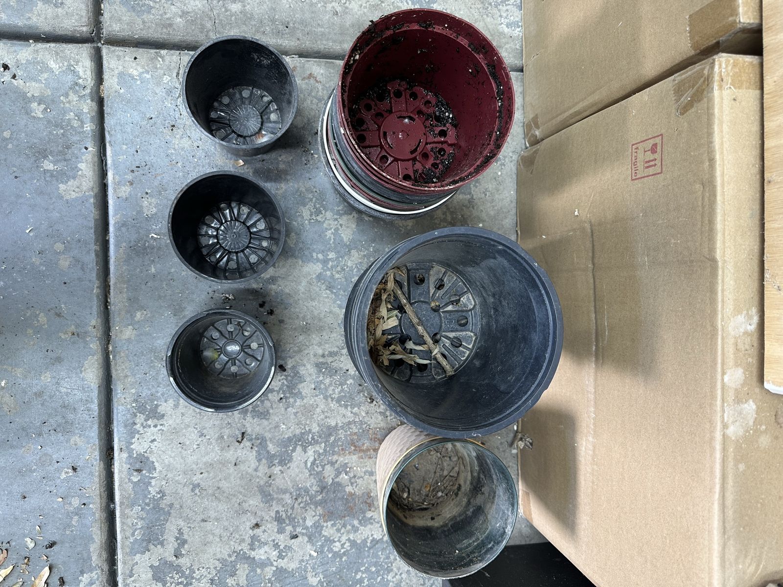 Venmo24 pots for plant starts. Bigger ones 5-6” tall and 6” wide. Little ones are 4” x 4”