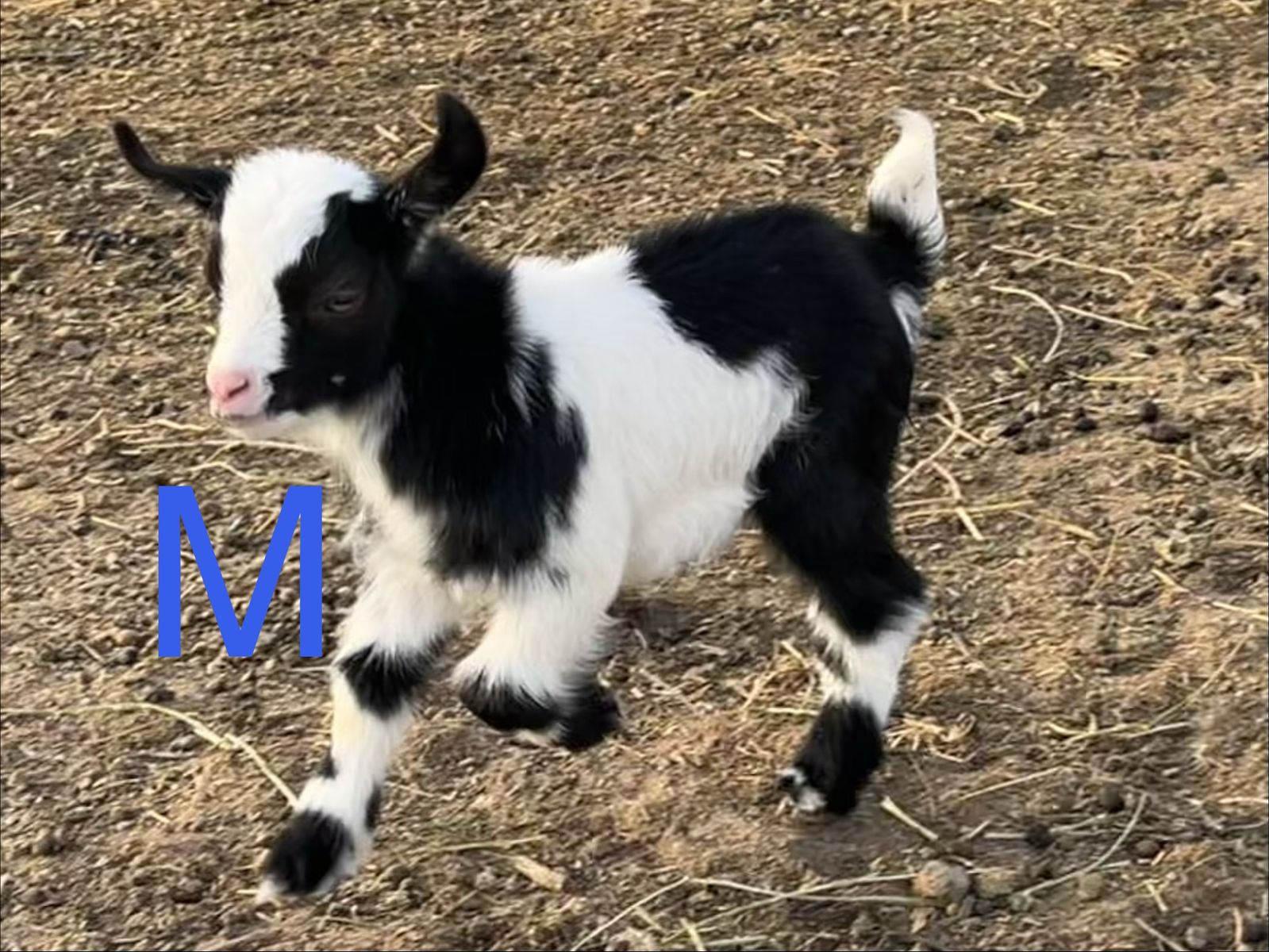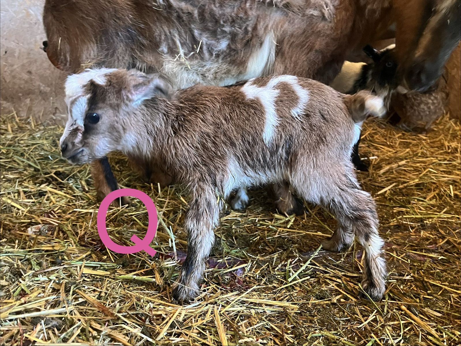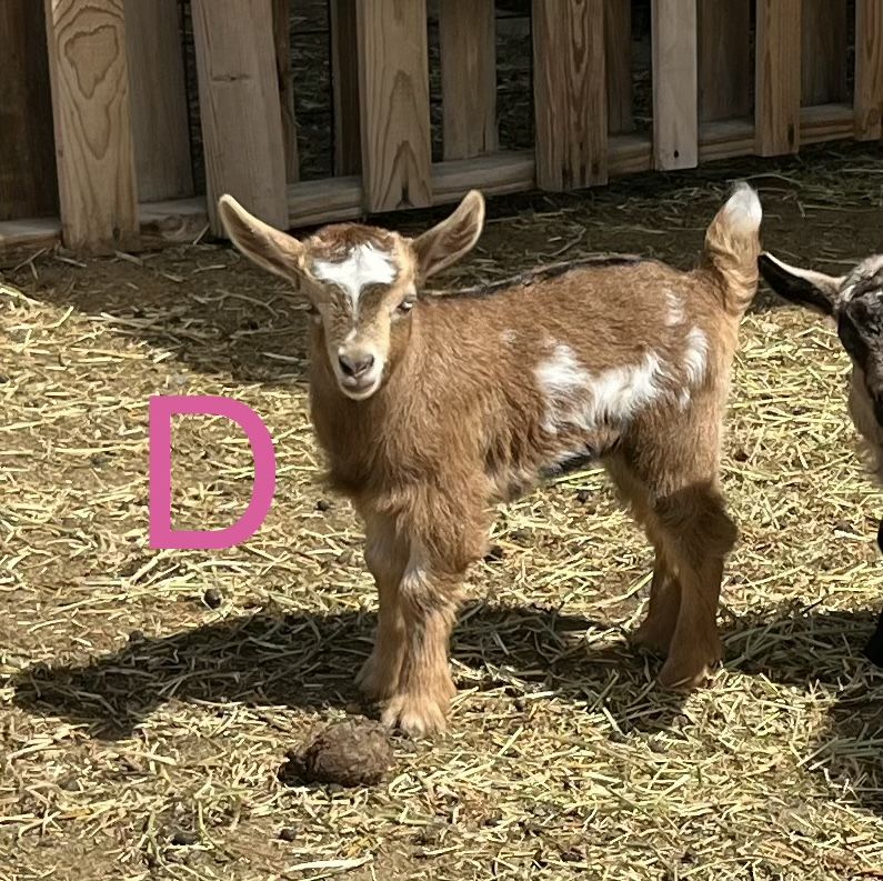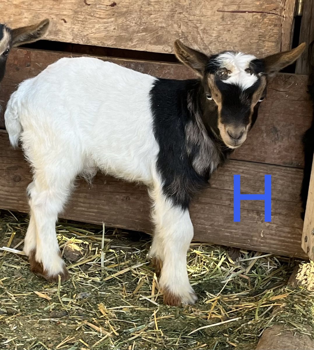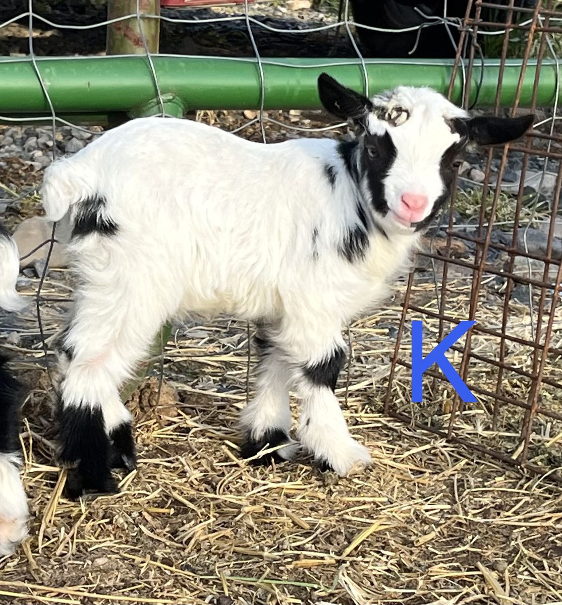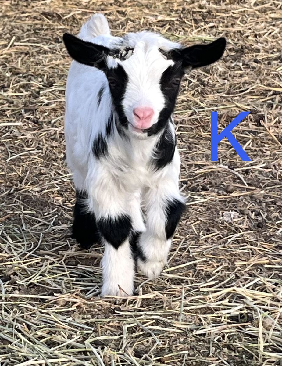 We have 17 kids: 8 females, 9 males. Polled and disbudded. (More pics coming soon!) Pink letters - females. Blue letters -Males.