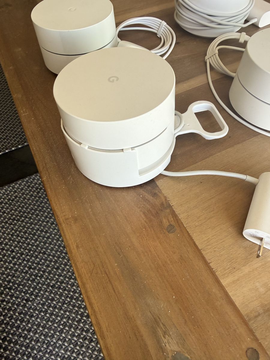 ZelleQty 4 Google WiFi points, all work great. One has a plastic holder designed to suspend the device at the plug. $60 takes all 4