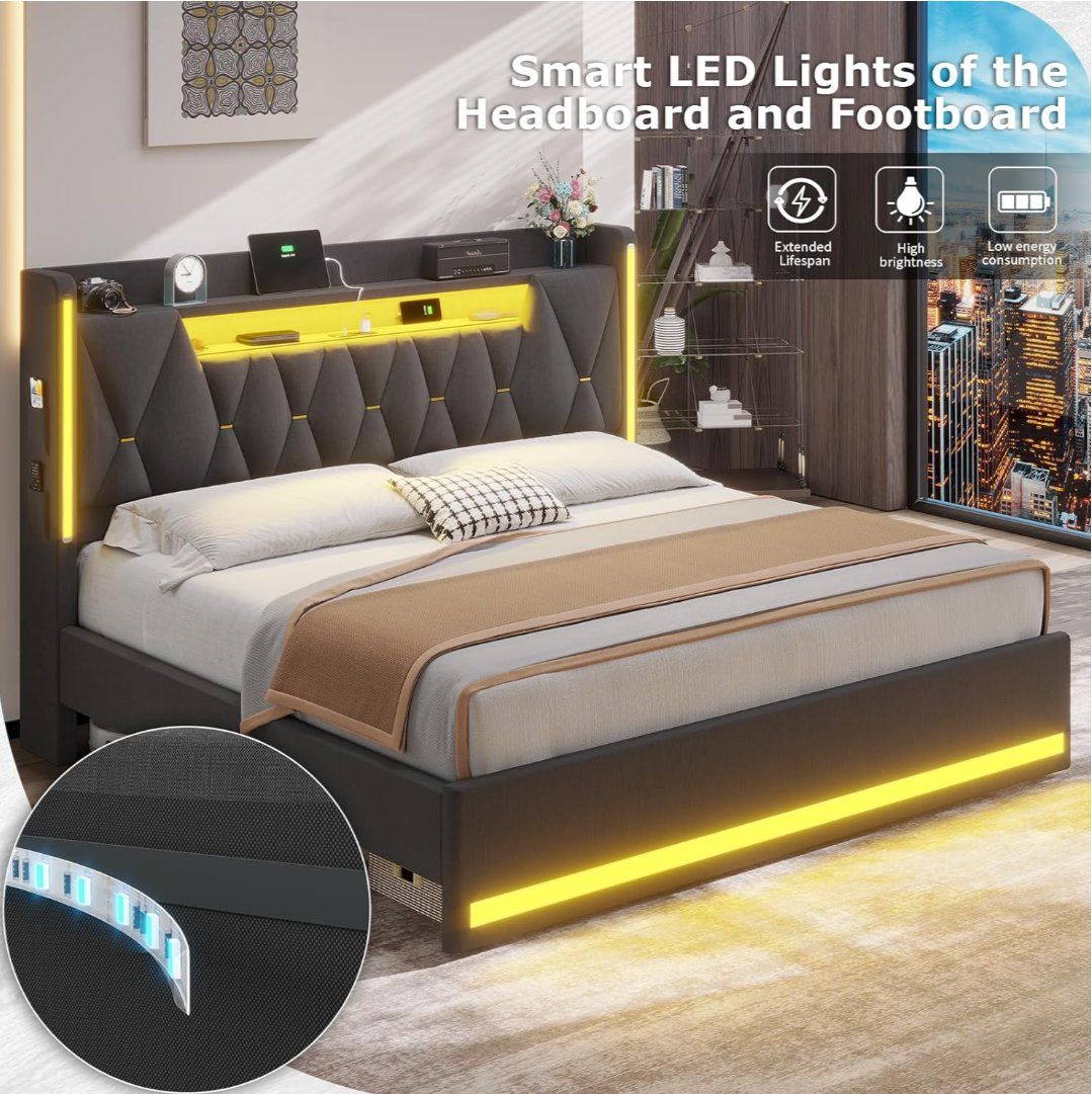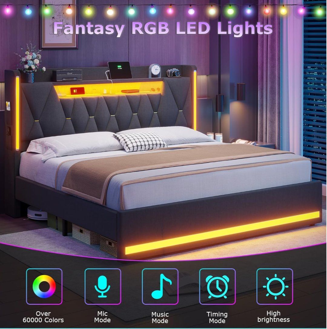 CashAppKing Size Bed Frame with LED Lights & Charging Station, LED King Bed with Hidden Space and 2-Tier Shelves, Upholstered Metal Bed Frame with Headboard, No Box Spring Needed, Dark Gray, Linen This bed was purchased exactly 6 months ago. *Lightly used, like new condition. Comes mostly assembled for transport. Comes with everything including the manual but no mattress. Nice sturdy bed but a king size is too large for my space. Currently this bed is selling on Amazon for $250 with shipping and tax. $150 obo Cash, Cash App or Venmo preferred. Questions, let's chat through KSL.