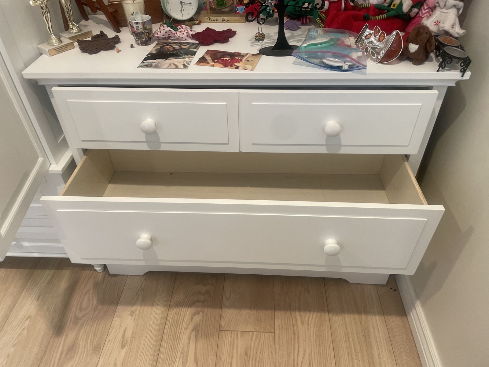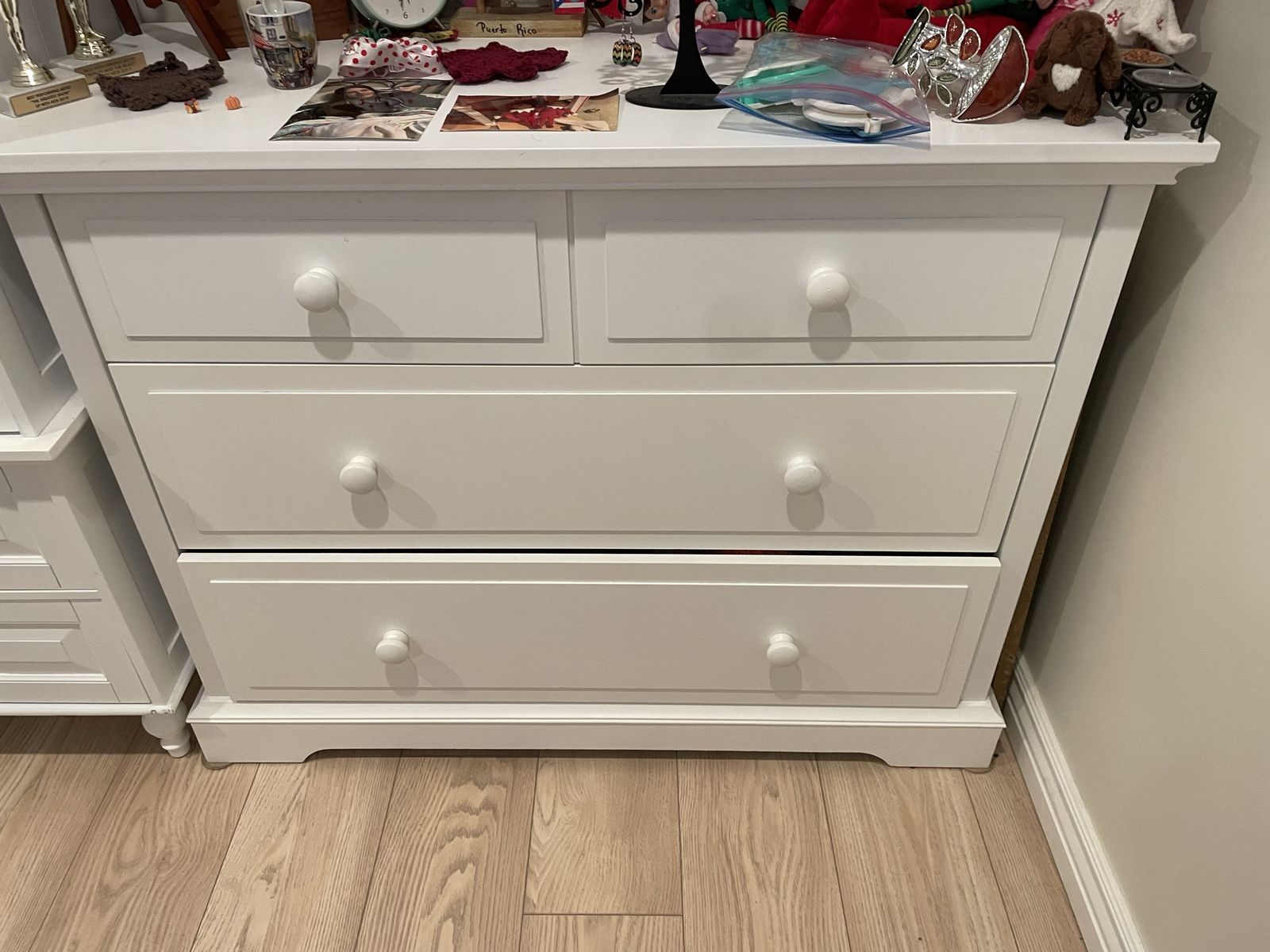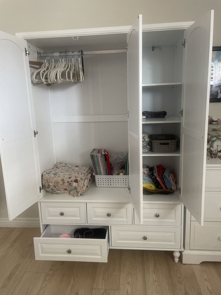 VenmoTwo year old white dresser and armoir purchased from Wayfair. Very good condition. On armoir, one foot needs to be reattached. On dresser, one drawer sticks a little. We paid $250 per piece. Can be bought as separate pieces.