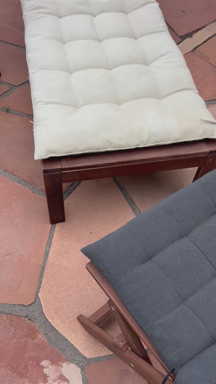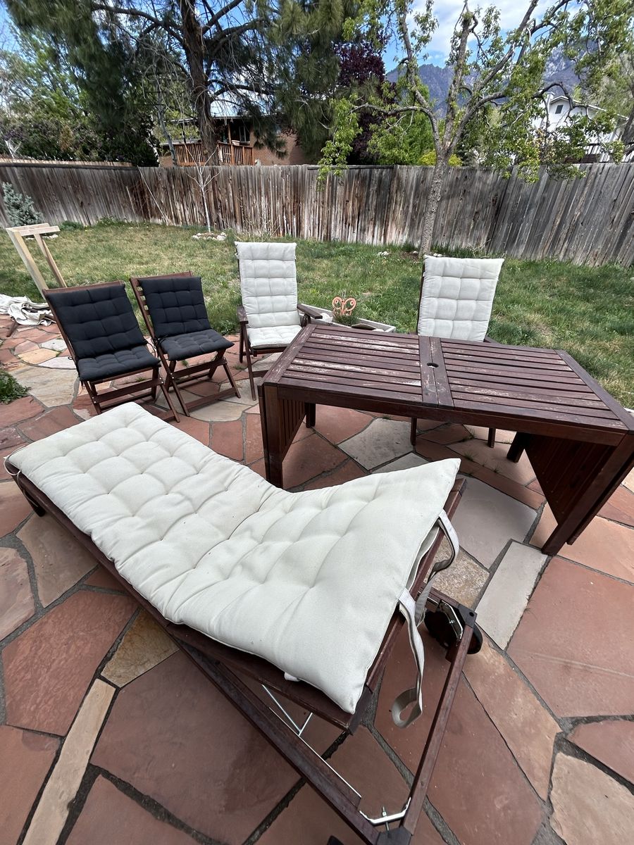 Venmo2 regular chairs, 2 adjustable chairs. Table is approximately 3 x 5 with extensions on each side. Chaise lounge. With cushions. Has been in storage. In good shape.