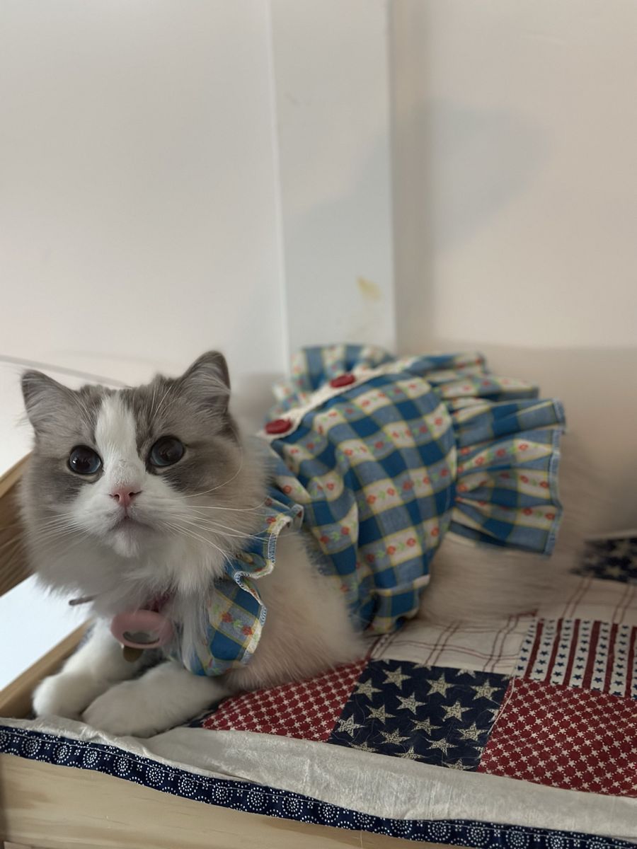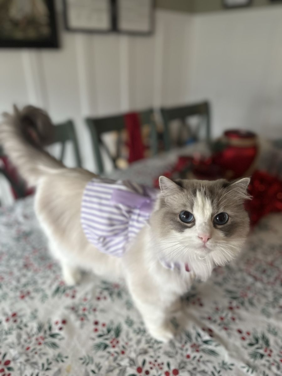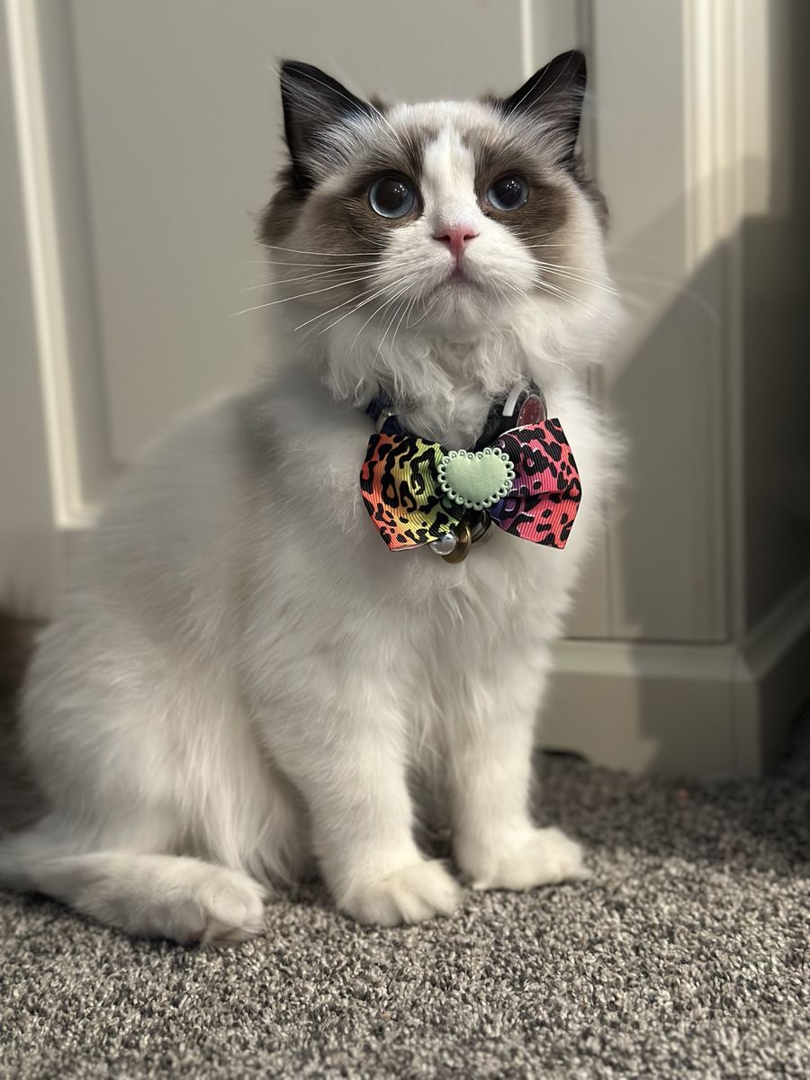 VenmoName: Duchess Flufferton Breed: Ragdoll Cat Sex: Female Color: White, blue bicolor DOB: April 28, 2023 Adopted: December 14, 2024 Shots: Current Spayed/Neutered: Yes Diet: 50/50 Royal Canin Indoor Cat & Royal Canin Ragdoll Cat dry kibble. Toppers include: Costco brand kibble chunks in gravy, dehydrated egg yolk, salmon oil, bone broth, green lipped mussel powder, dehydrated anchovies, dehydrated rabbit pieces. Prefers water in a stainless steel bowl (not a pet fountain!) was on PurinaOne Live Clear because of my allergies, but it didn’t seem to help me Personality: Duchess is in every sense of the word, a Queen. She attaches to one person, and is utterly devoted to them. She follows you from room to room, however she does like her space; she would rather be next to you than be held by you. She loves getting pets and scratches, and likes her booty to be spanked. She doesn’t really play with toys, but occasionally she will chase a bird on a string. She loves going for walks, and will come with her two harnesses and leashes. I often put her in bows or little dresses, it’s too cute. She is very chill, low maintenance and loving, she also has the tiniest little meow; it’s very feminine! As far as her size, she is on the smaller end for ragdolls and will stay that way. She can be picky about food, so keep it consistent; she is a grazer, so her kibble is left out all day, this helps her to feel comfortable— she will avoid food if she is stressed. She knows how to sit, sit pretty (sit back in haunches) and come, but she can be stubborn. She hasn’t been super exposed to other cats/dogs, but the neighbor dog and cat she is fine with, so slow exposure would be best. She is an indoor cat only. Asking price: $1,100