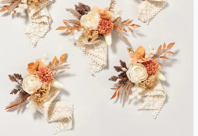 Venmo1 stand alone alter 3 wrist corsages that also compete regular 5 in total boutonnieres all pins included 2 piece archway flowers 10 chair hangers also has matching ribbon for bookcaser whatever you need. comes with the original boxes they just need to be flipped they are beautiful