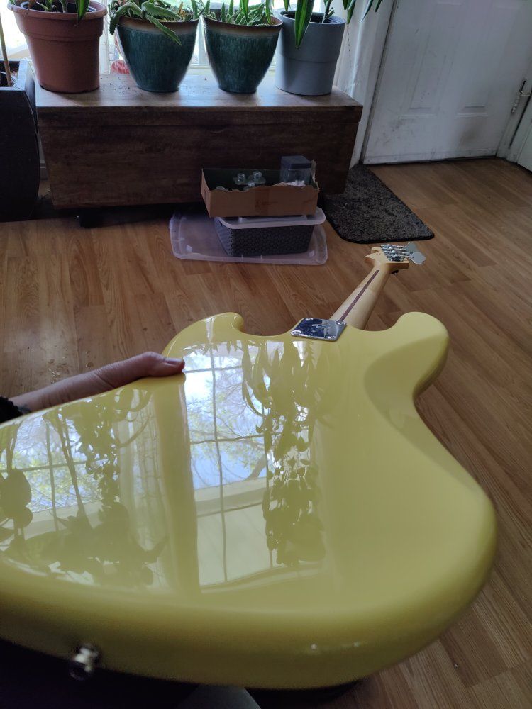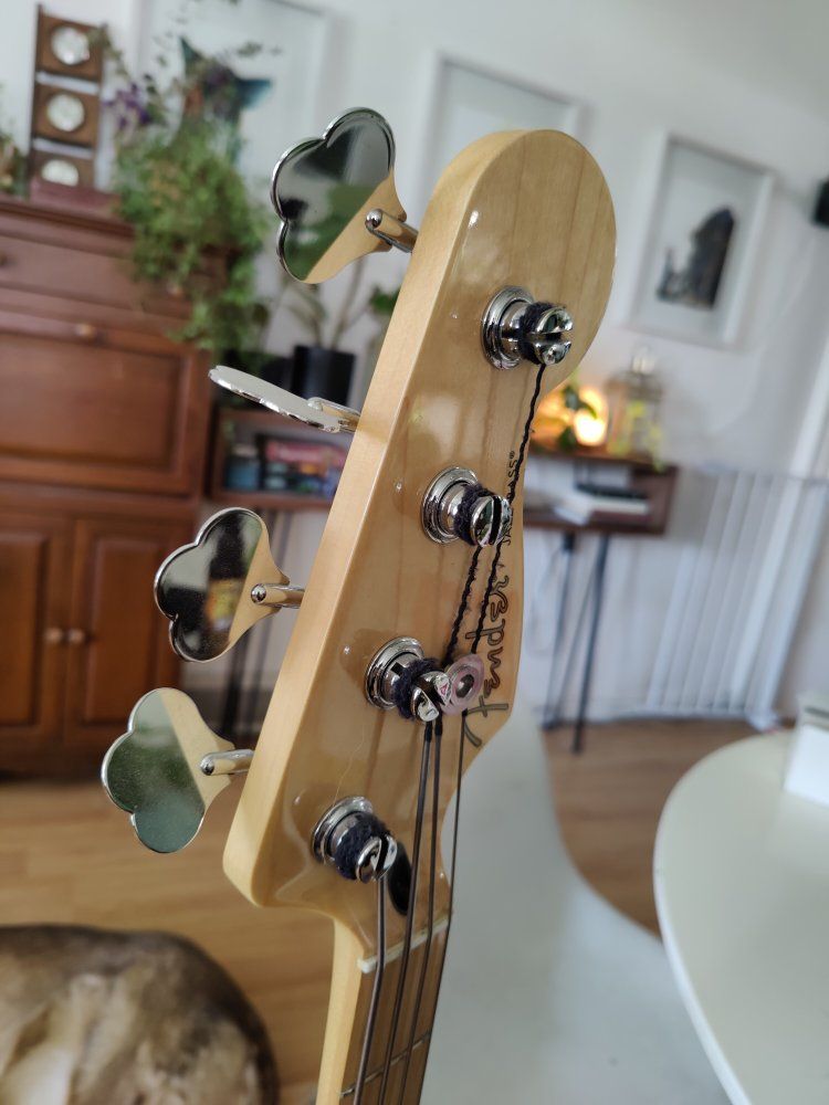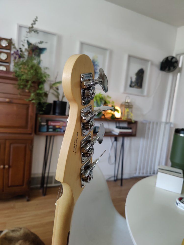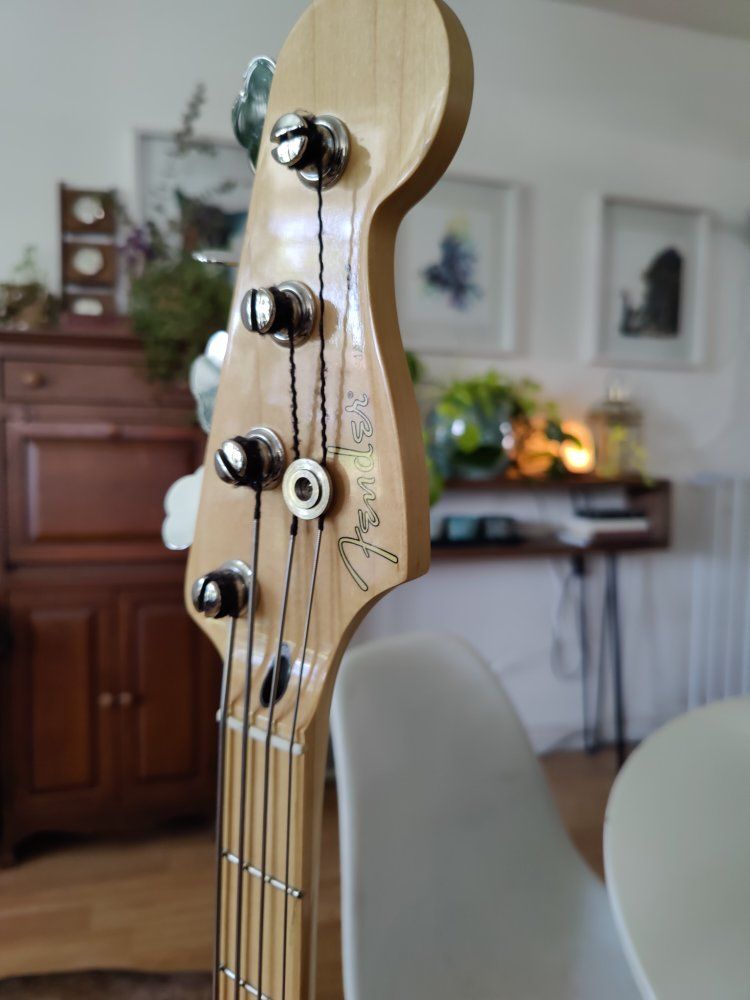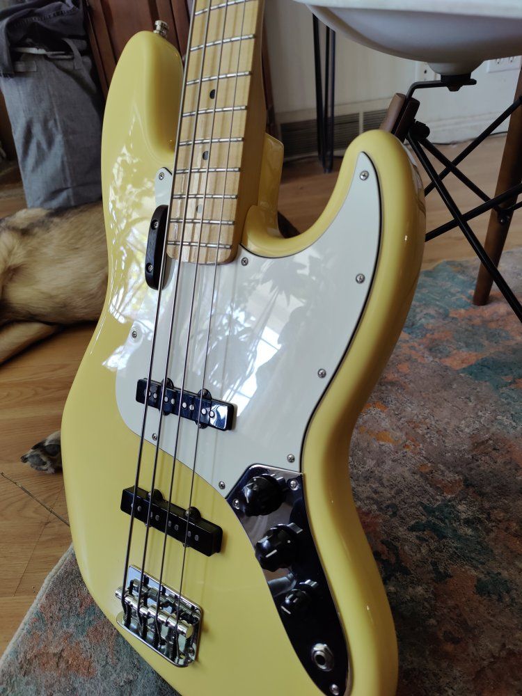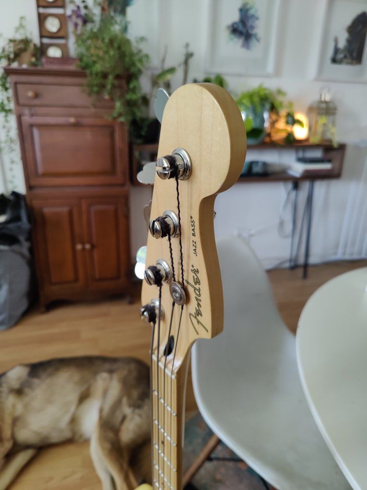 VenmoFender standard player ii jazz bass with la bella flats. Pretty minimal ding at the curvature on the head stock and belt buckle scratching on the neck plate - I didn't see any noticeable scratching on the body. Has the typical auto lock setup for straps.
