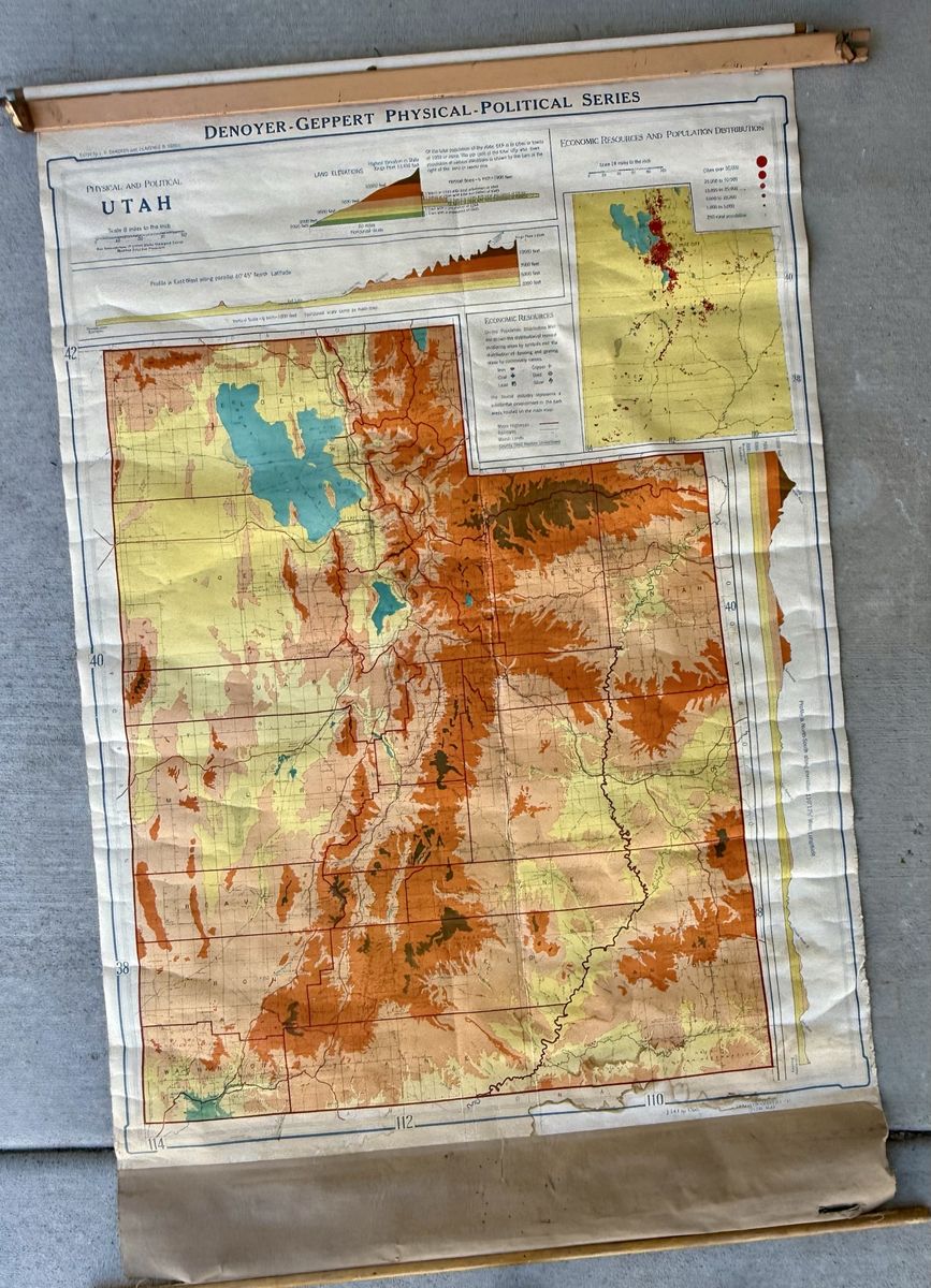 Vintage physical and political school wall map of Utah. Dated 1951. In good condition. Some wear see photos. It is approximately 44x62.