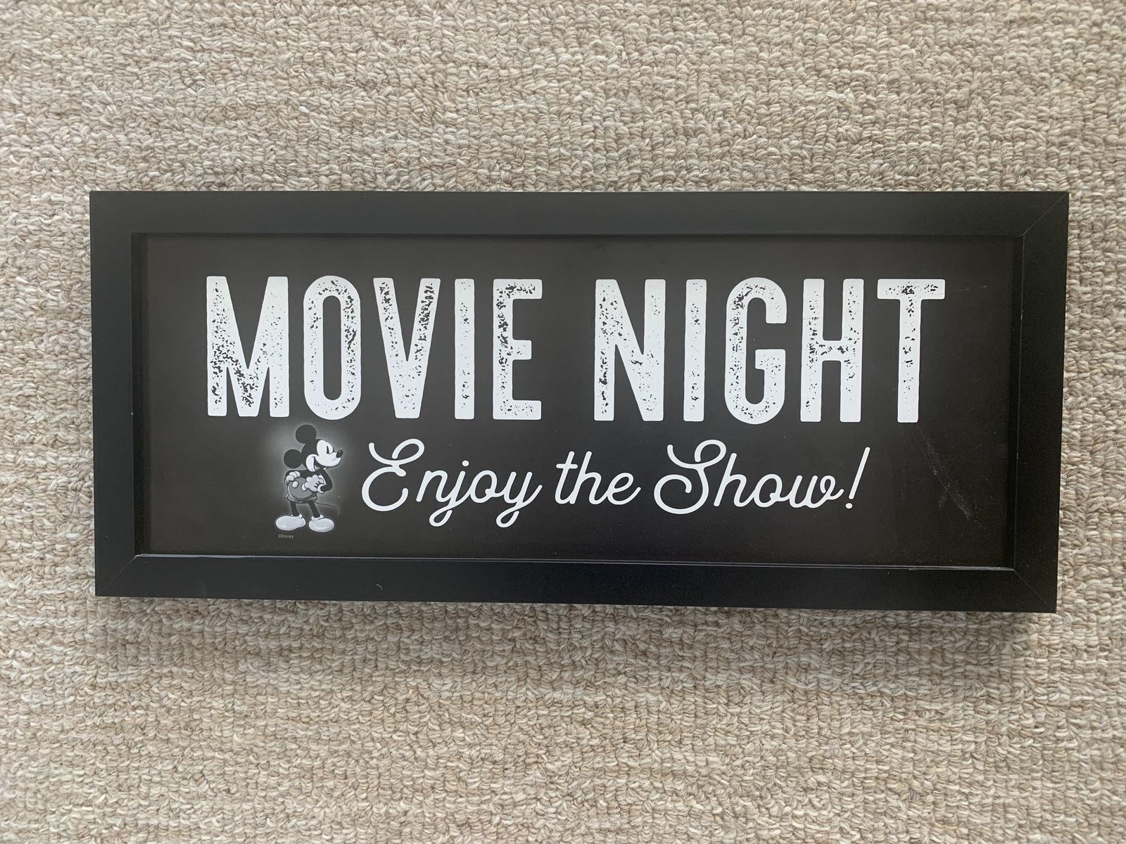 Movie Night Sign Featuring Mickey Mouse . Wood. 7 ½” x 17 ½”. Originally priced at Hobby Lobby for $17.99.