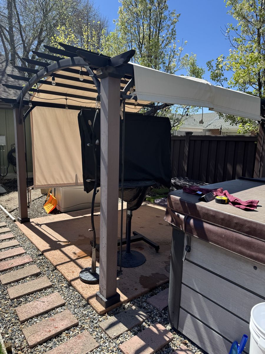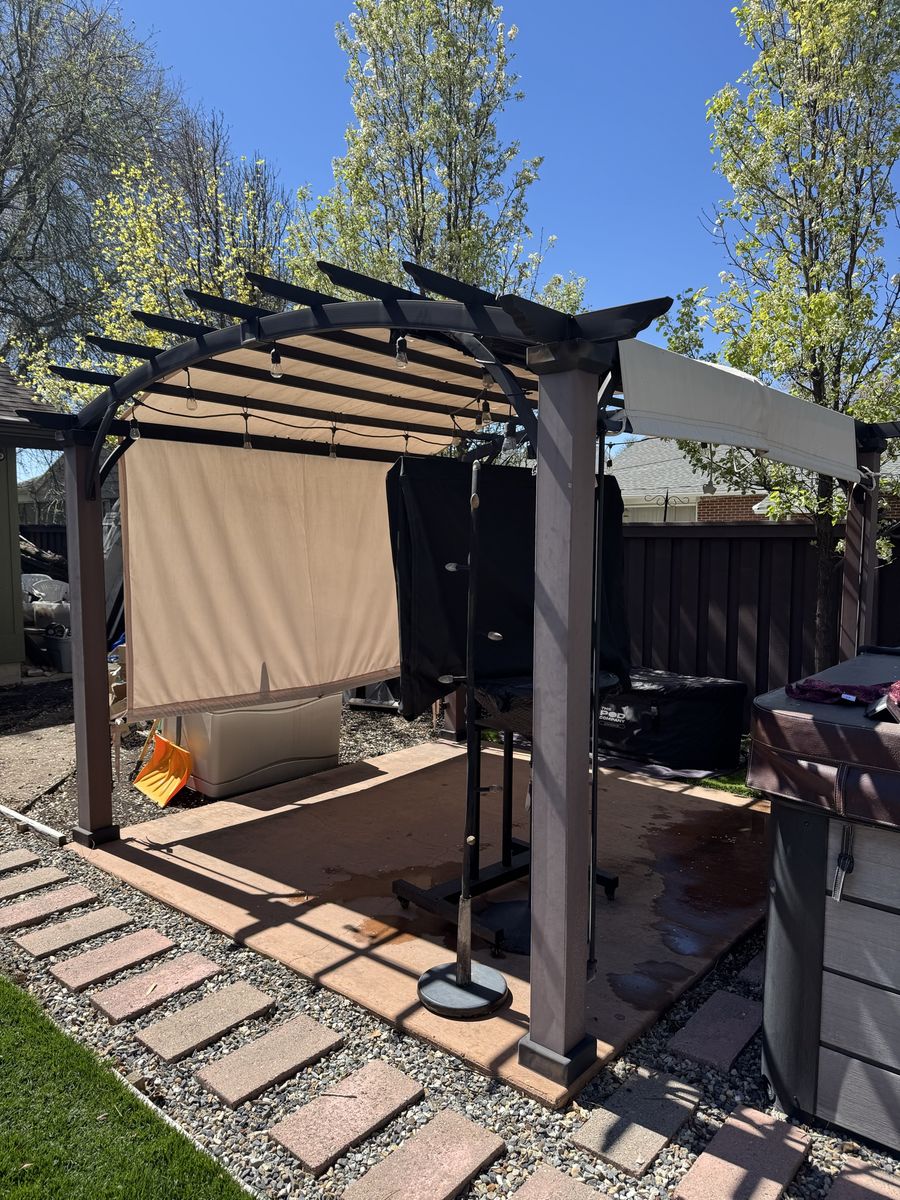 ApplePayBeautiful metal gazebo with adjustable shade covering. 10 x 10. It's about five years old. We are selling it just because we are wanting to get a larger one to cover more space. The shake can adjusted so that it can be pulled down to one side if needed for shade as the sun moves.