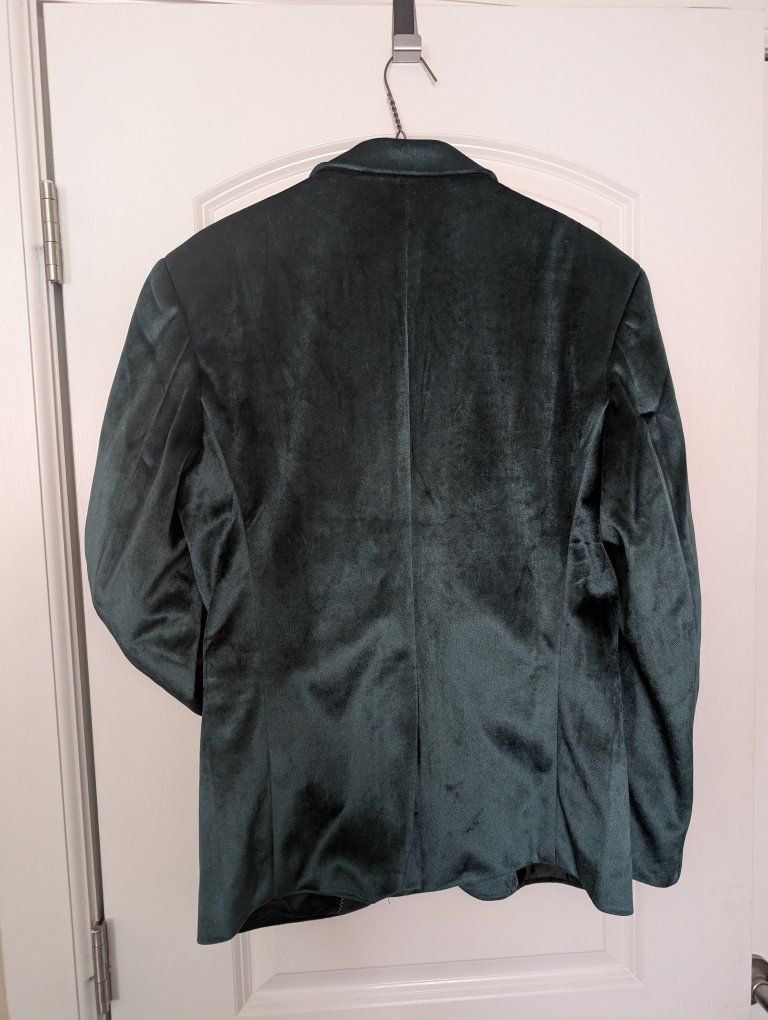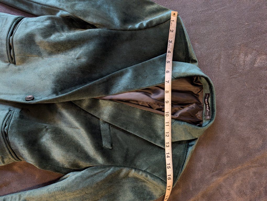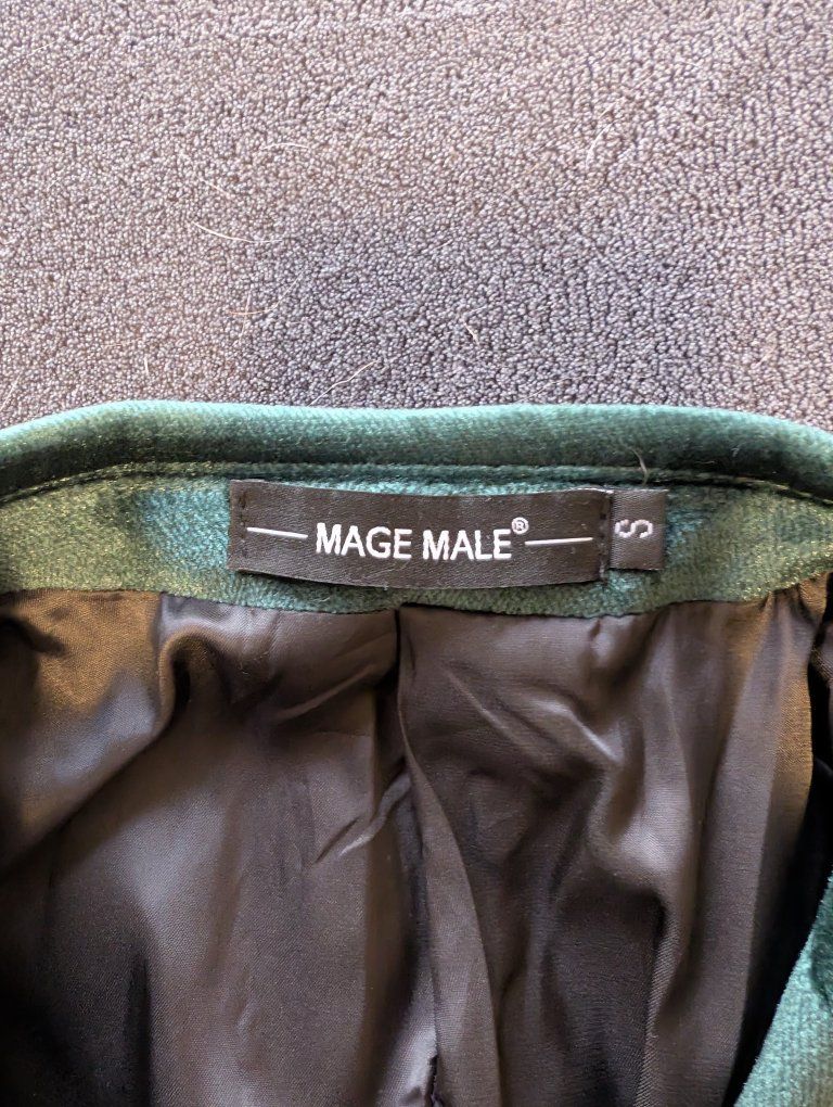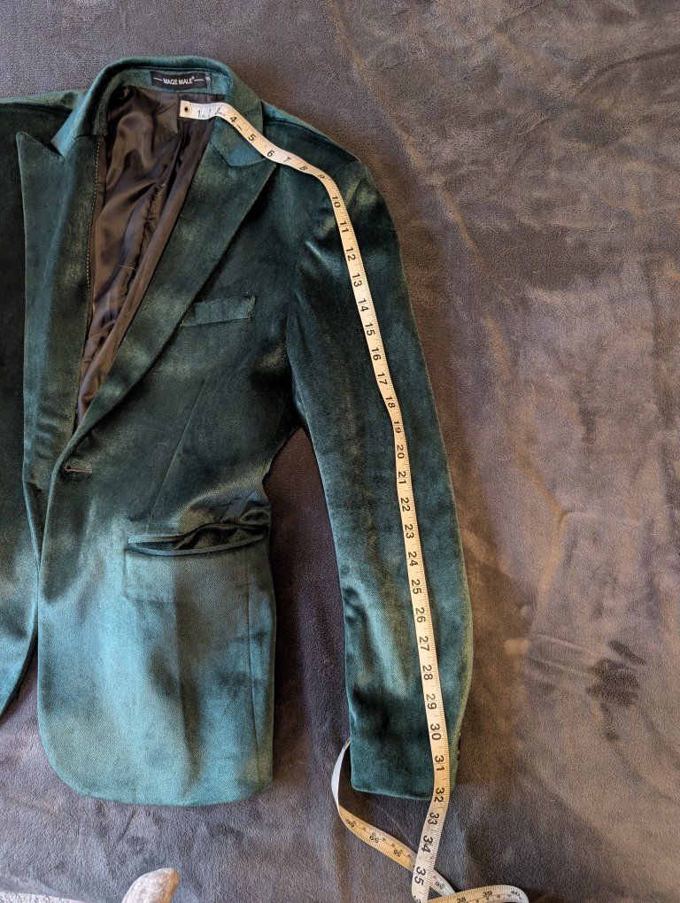 VenmoThis is a dark green suit jacket from the brand Mage Male in size S. The material in high quality dark green velvet that shines in direct light. measurements in pictures. It's in near perfect condition. The lining needs to be ironed.