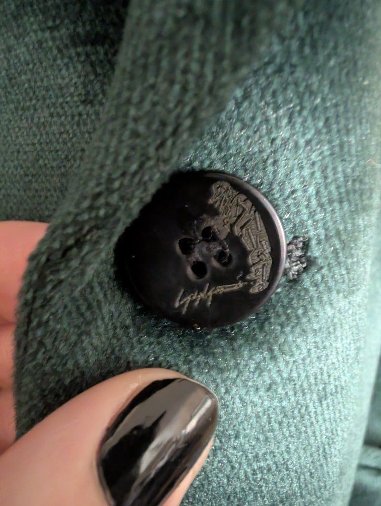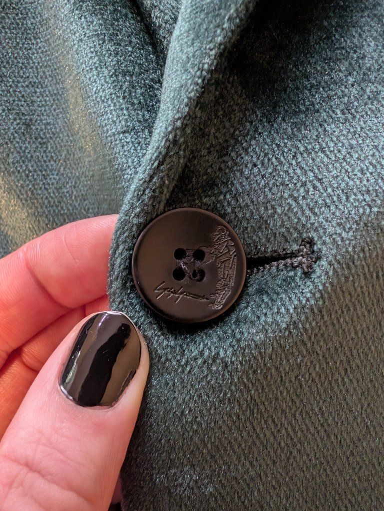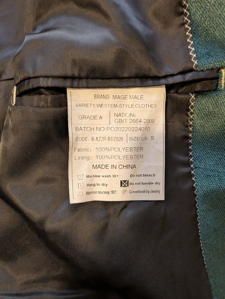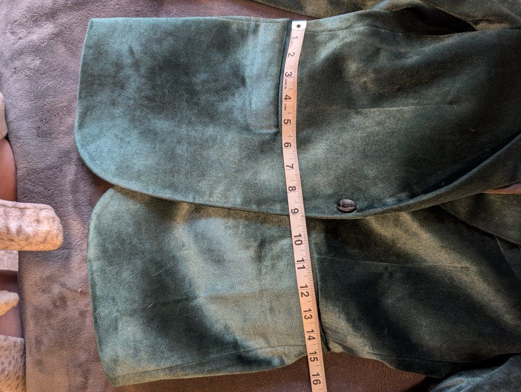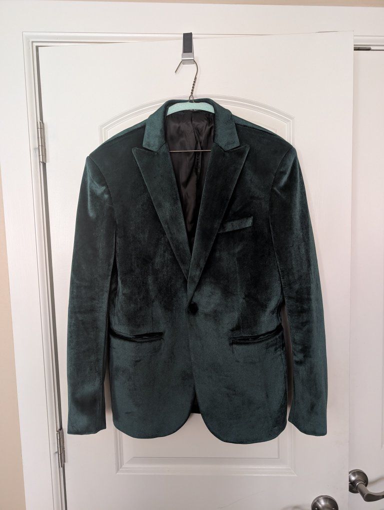 VenmoThis is a dark green suit jacket from the brand Mage Male in size S. The material in high quality dark green velvet that shines in direct light. measurements in pictures. It's in near perfect condition. The lining needs to be ironed.
