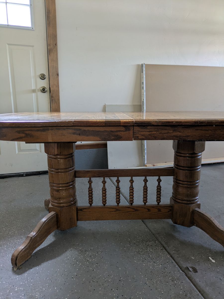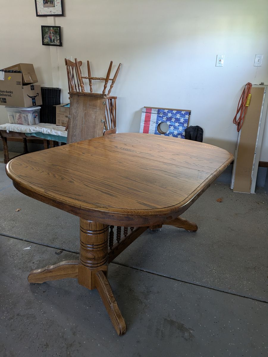 Solid, sturdy oak dining room table. Finish could use a little TLC. Includes extension leaf.