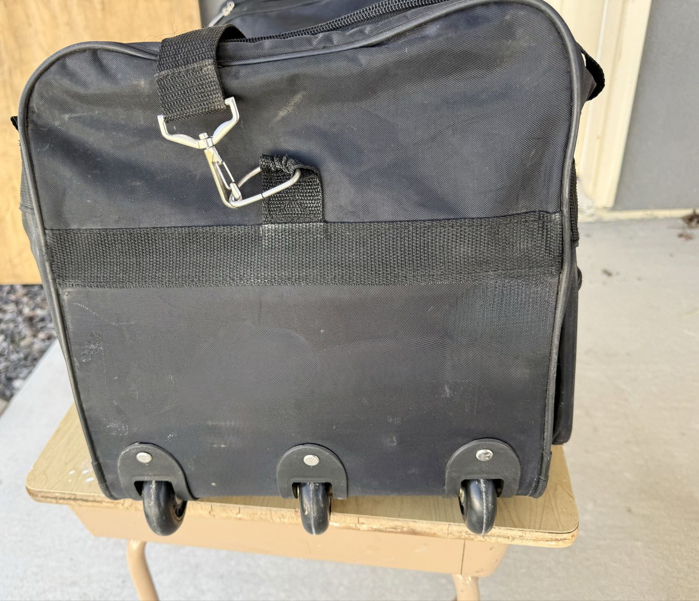 ApplePay'Marianna' black rolling bag. 3 used mannequin heads, and one new head. 3 cosmetology books