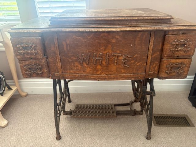VenmoAntique White Rotary Treadle Sewing Machine in original wood cabinet with 4 drawers