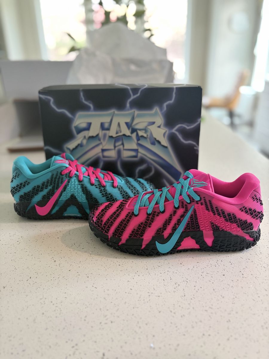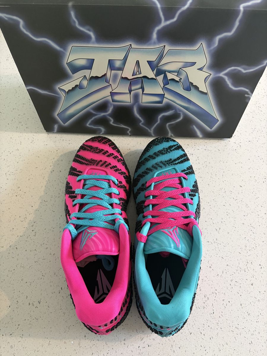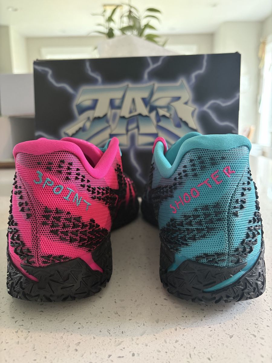 Super unique mismatched colorway with bright teal and pink, black detailing, and custom“3 POINT” / “SHOOTER” text on the heels. These definitely stand out on the court and you won’t see anyone else with this pair.