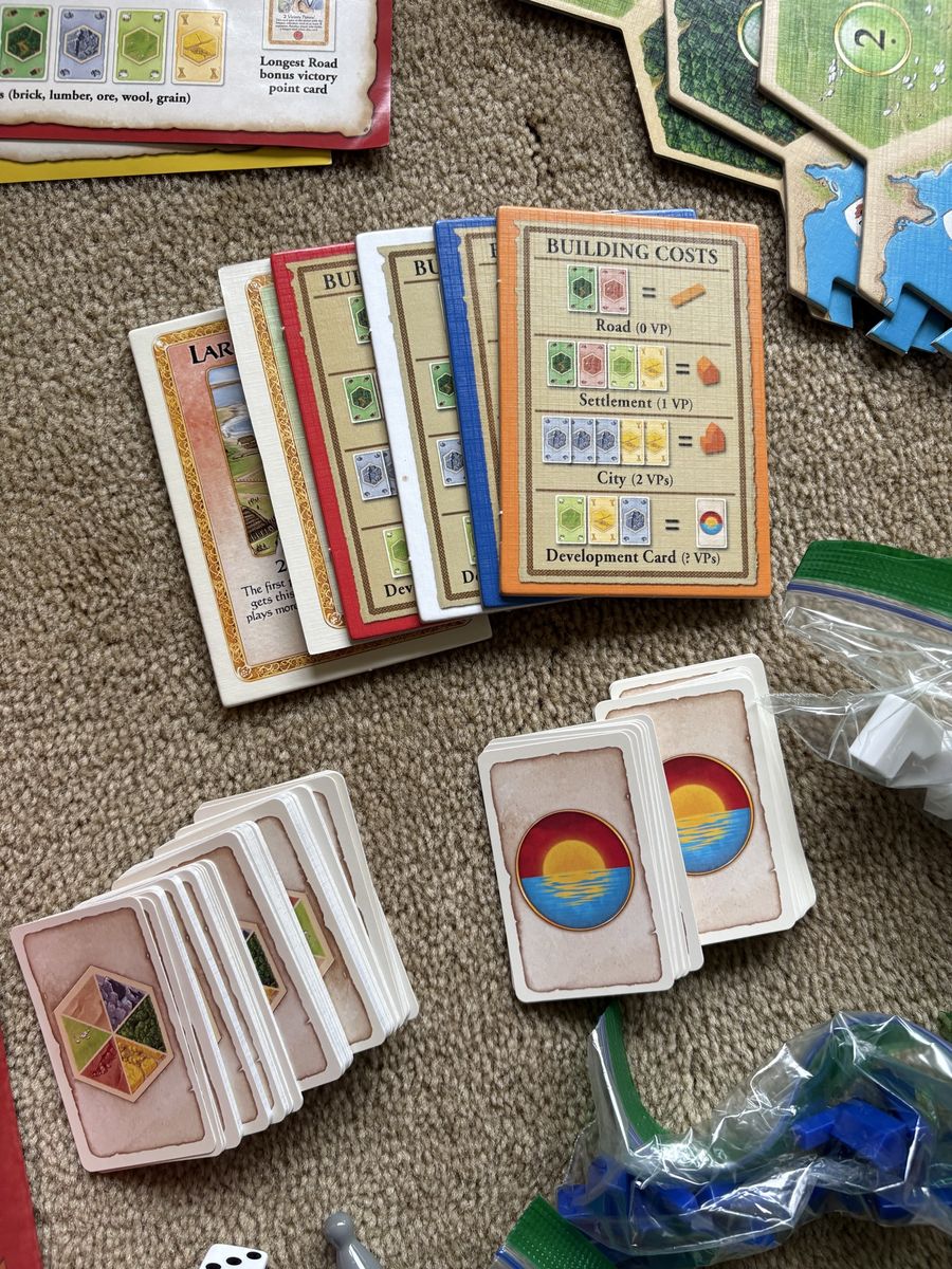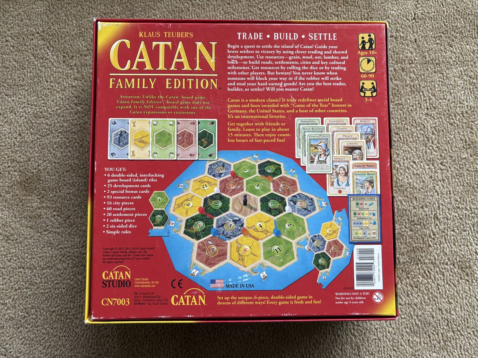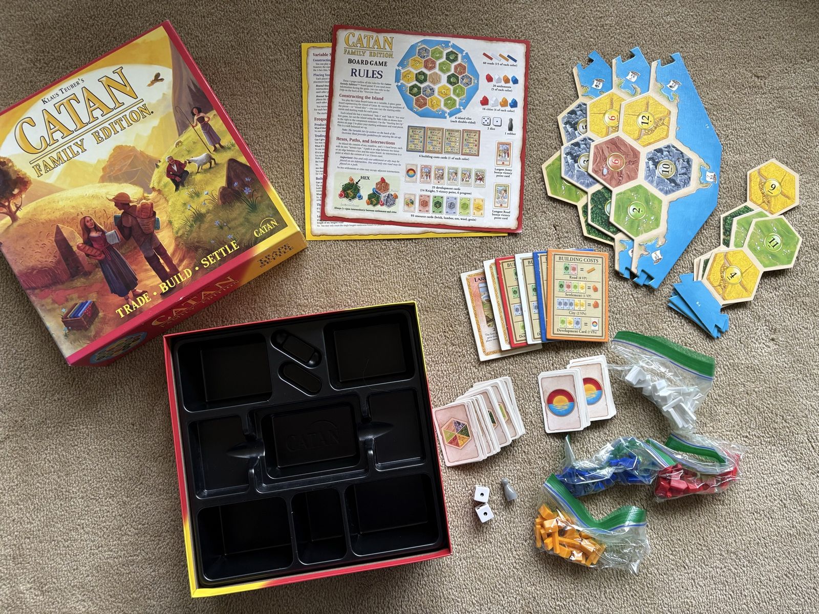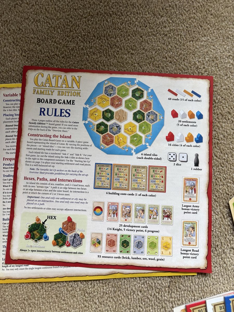 COMPLETE Settlers of Catan: Family Edition Game. Trade, Build, Settle. Family-friendly version of the classic game. Not compatible with other Catan games and expansions. By Klaus Teuber, Mayfair Games, 2018. Ages 10+, 3-4 players. Complete, no missing pieces. Excellent condition. Text only. Cash or Venmo. Discount on multiple items.