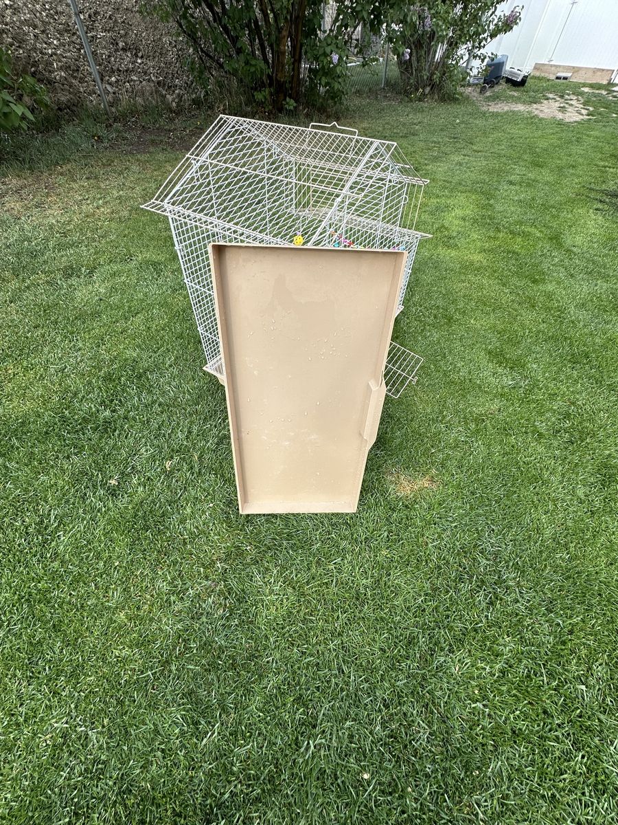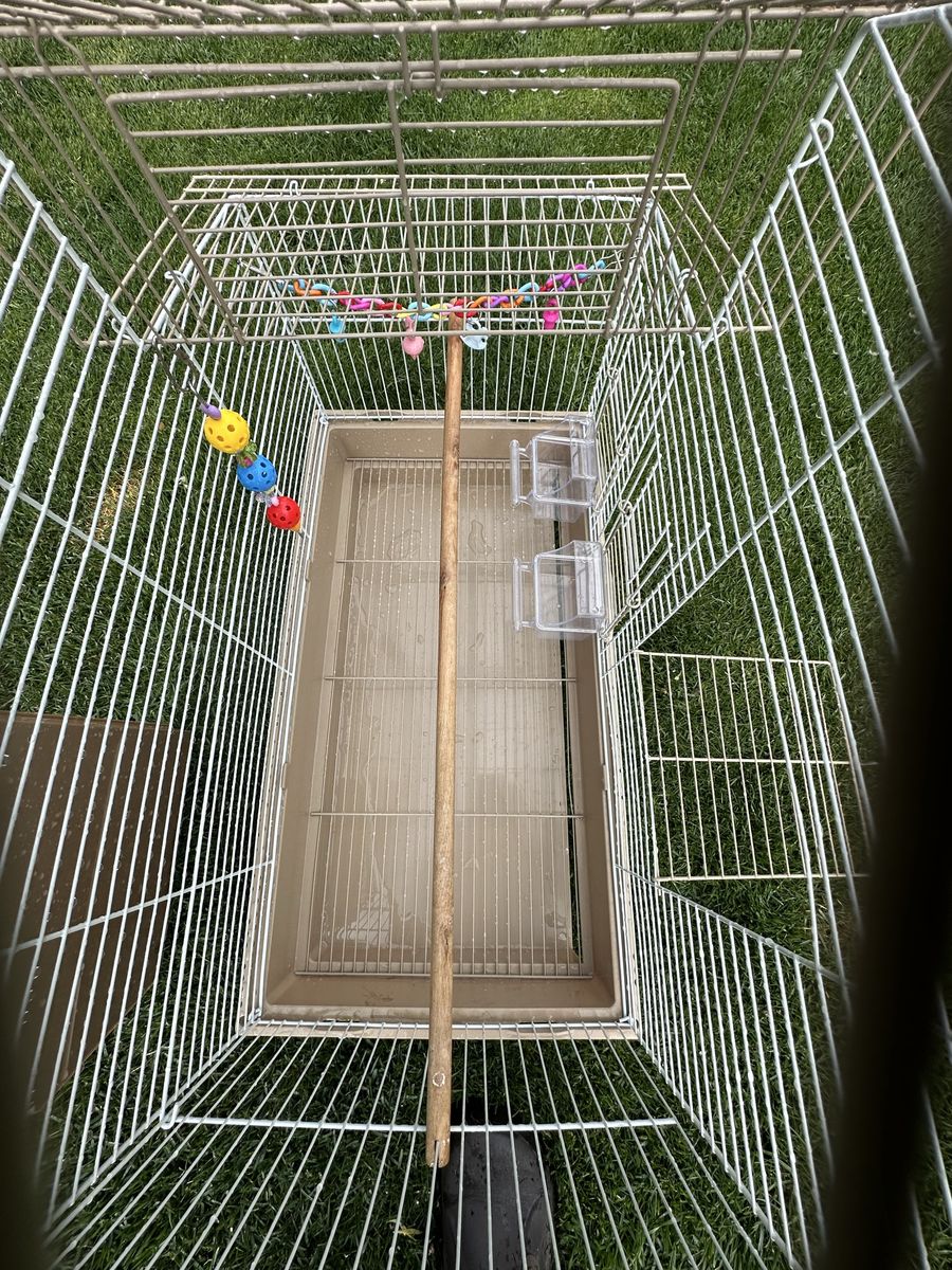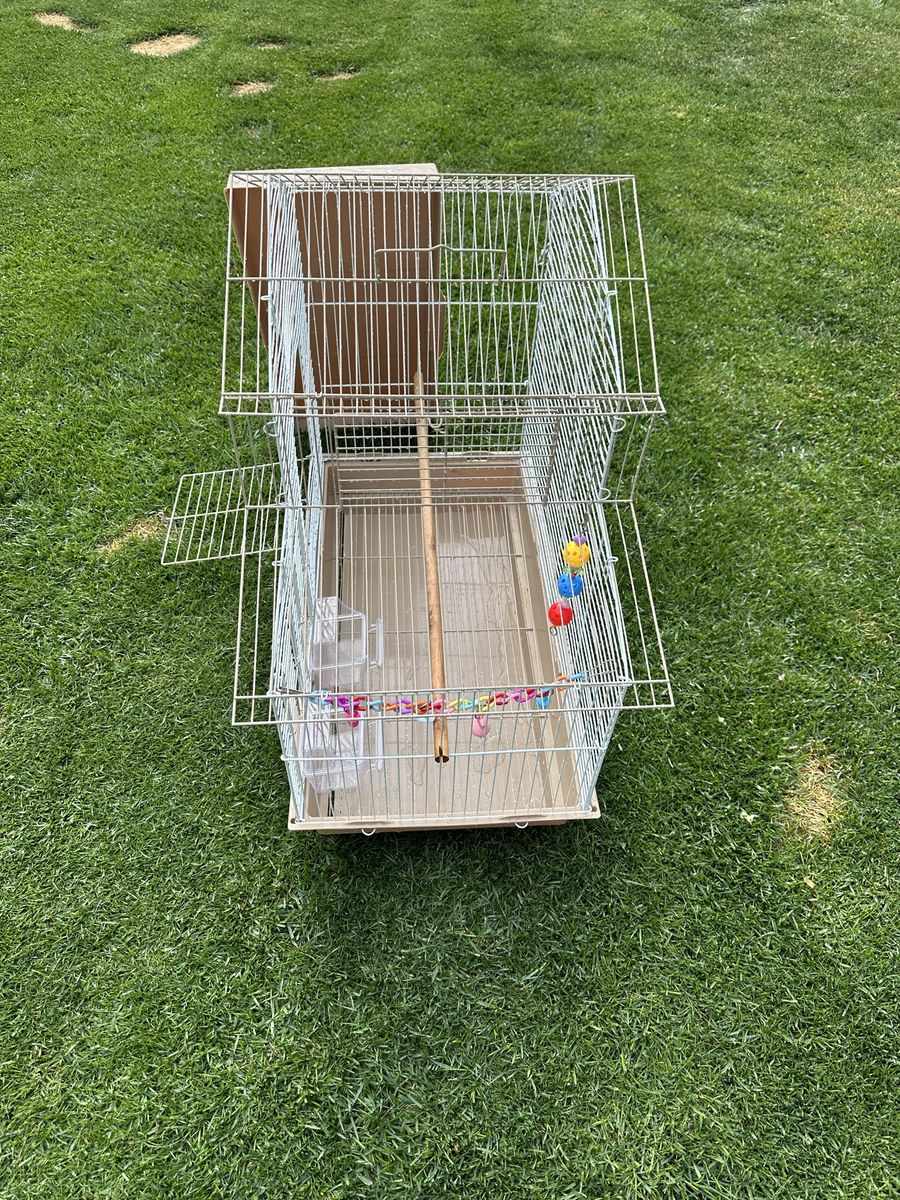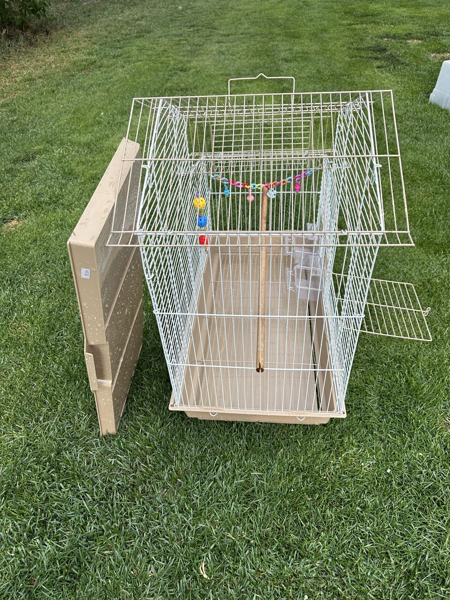 This cage would be great for a budgie or two. Or canaries or finches. Comes with two bowls with covers. One wood dowel perch. Handle on top for carrying. Metal cover over plastic tray.