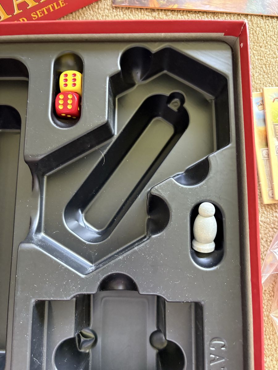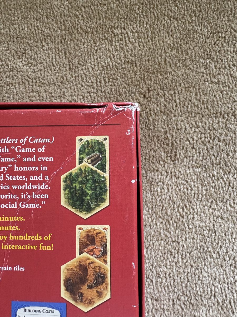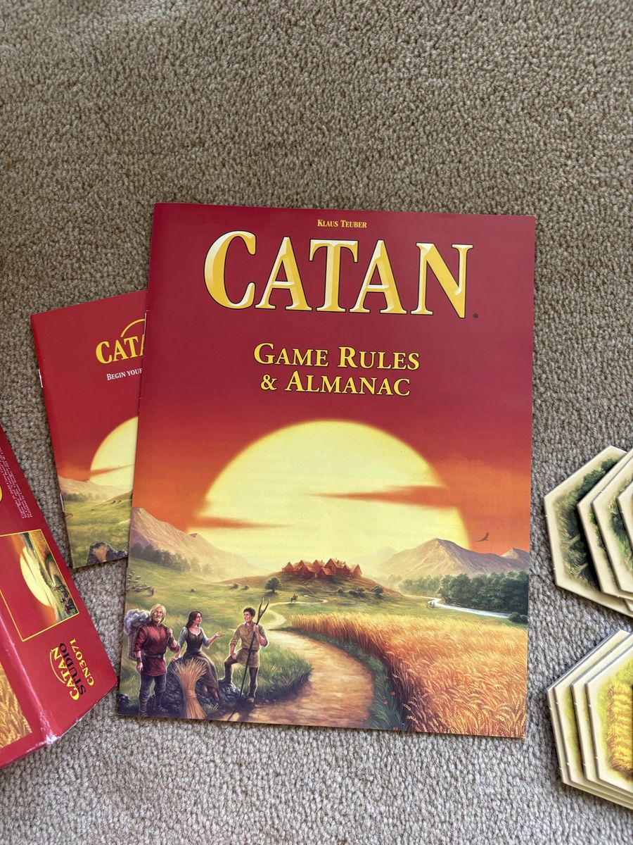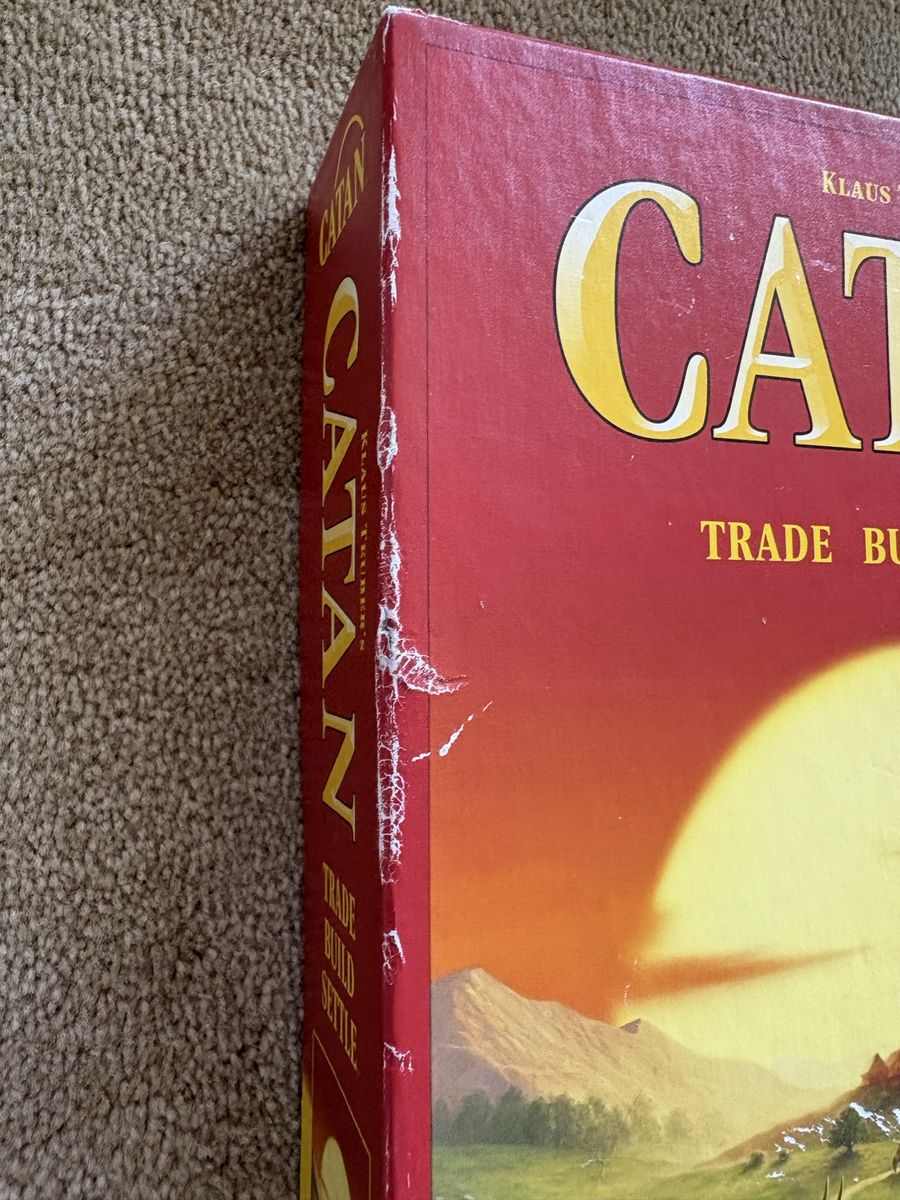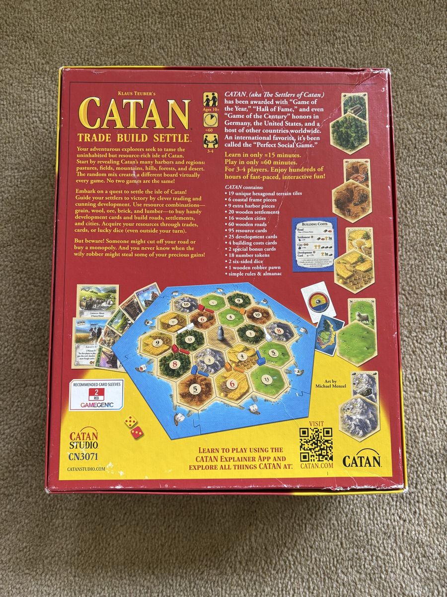 COMPLETE Settlers of Catan Game: Trade, Build, Settle. Klaus Teuber, Mayfair Games, 2021. Ages 10+, 3-4 players. Complete, no missing pieces. Components in excellent condition (box edge damaged—see photos). Text only. Cash or Venmo. Discount on multiple items.