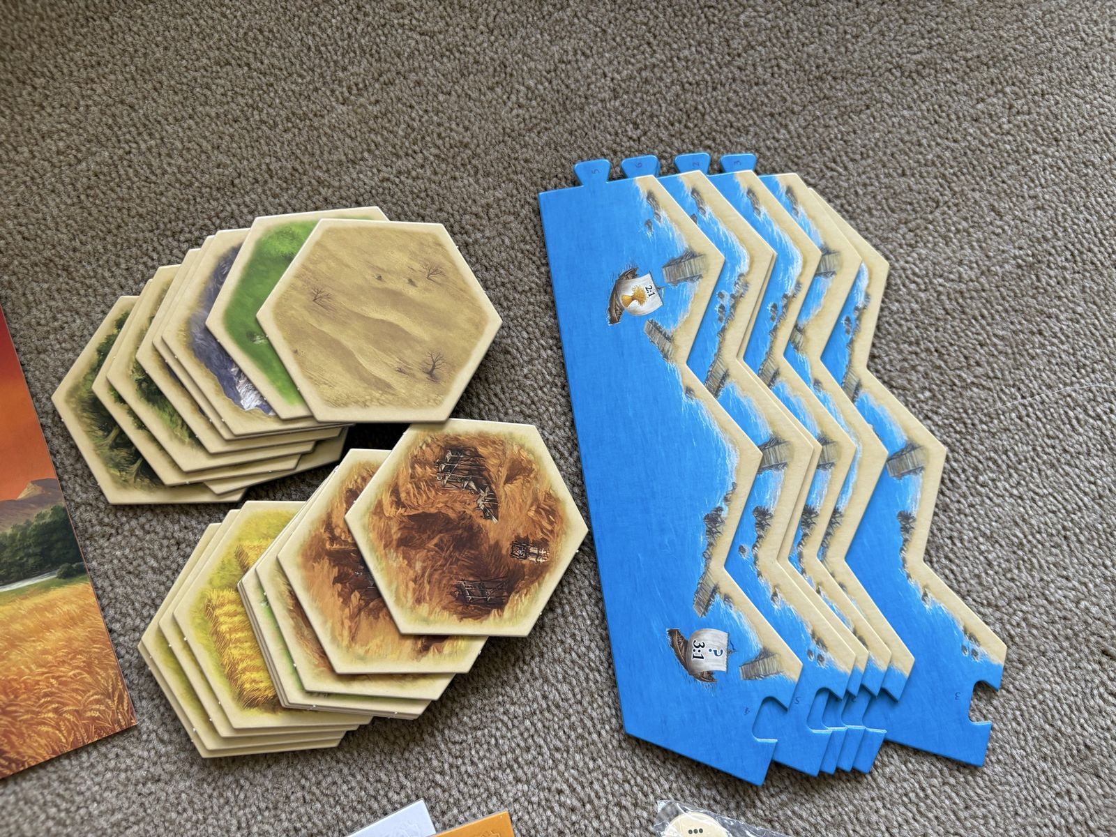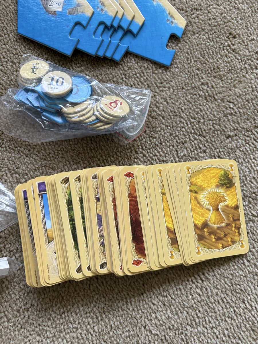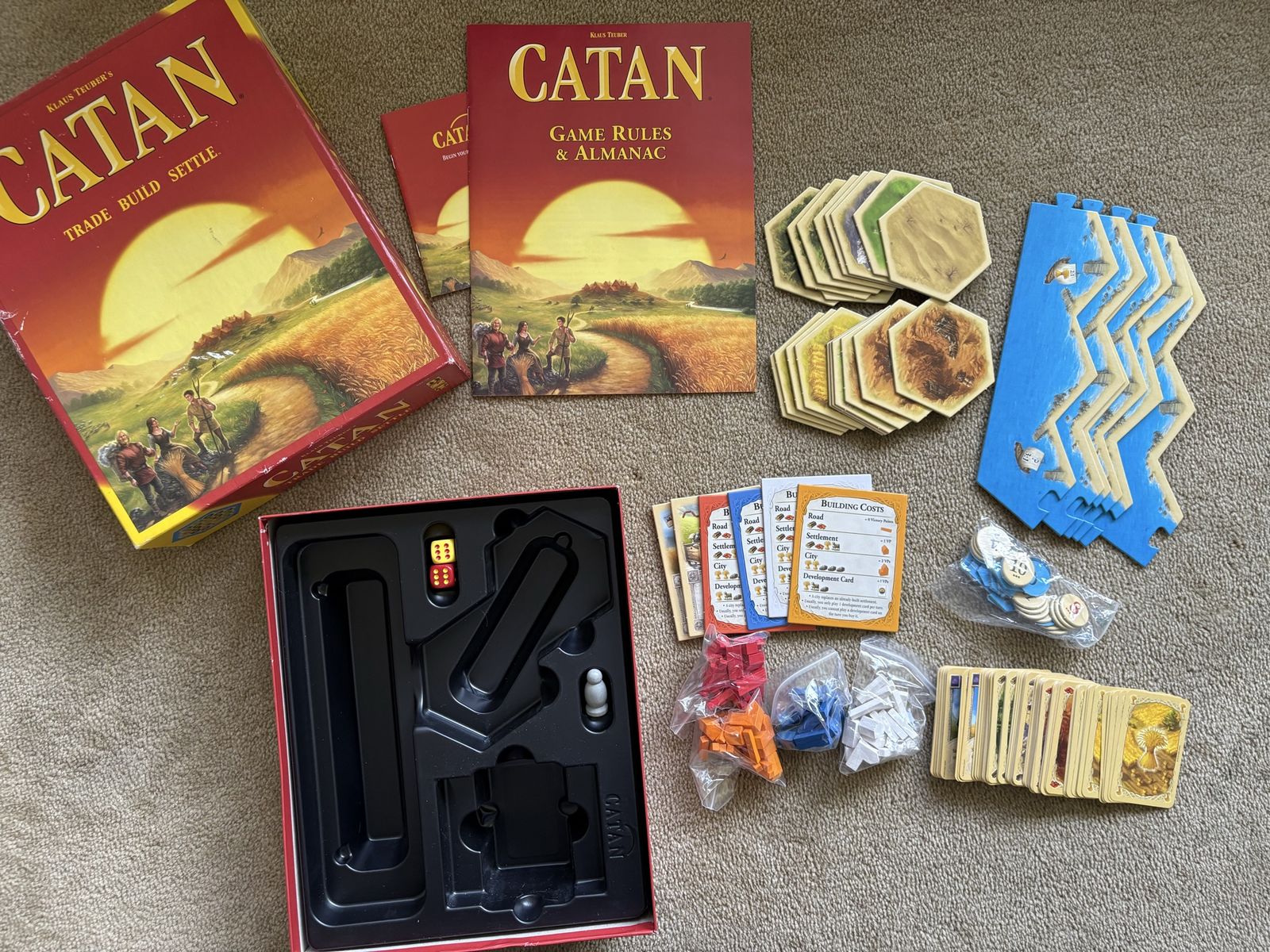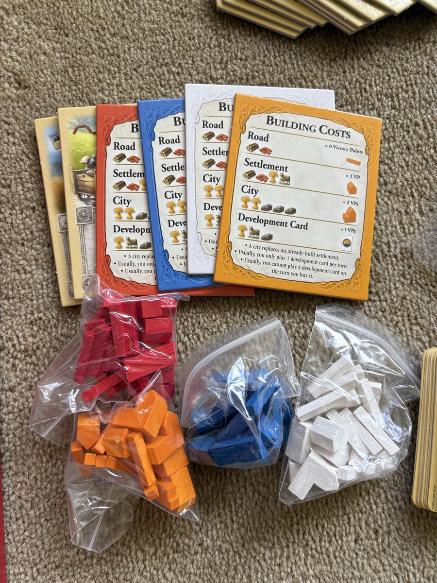 COMPLETE Settlers of Catan Game: Trade, Build, Settle. Klaus Teuber, Mayfair Games, 2021. Ages 10+, 3-4 players. Complete, no missing pieces. Components in excellent condition (box edge damaged—see photos). Text only. Cash or Venmo. Discount on multiple items.