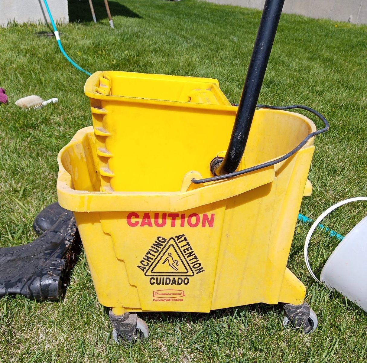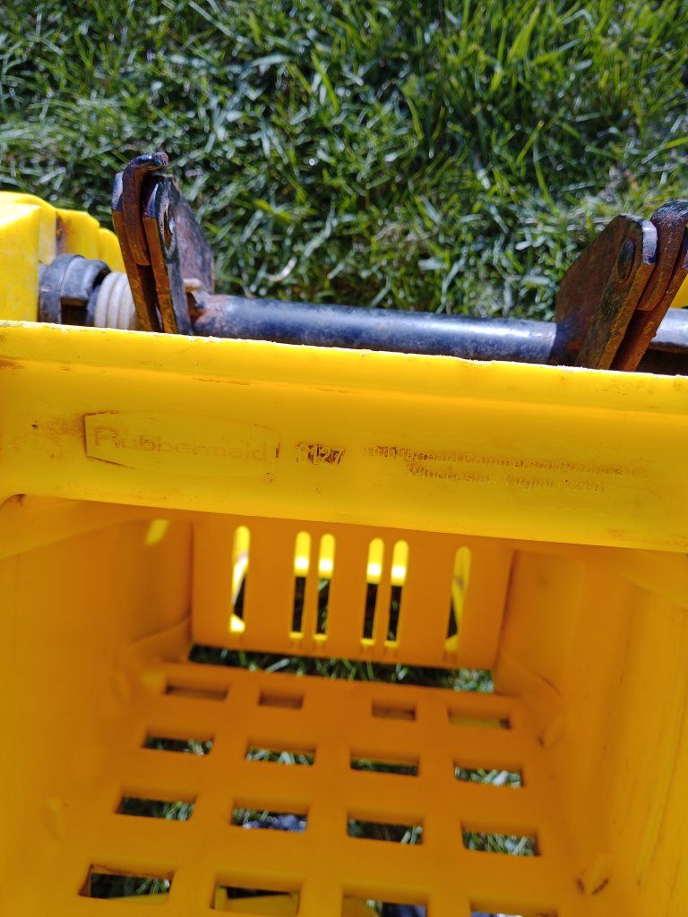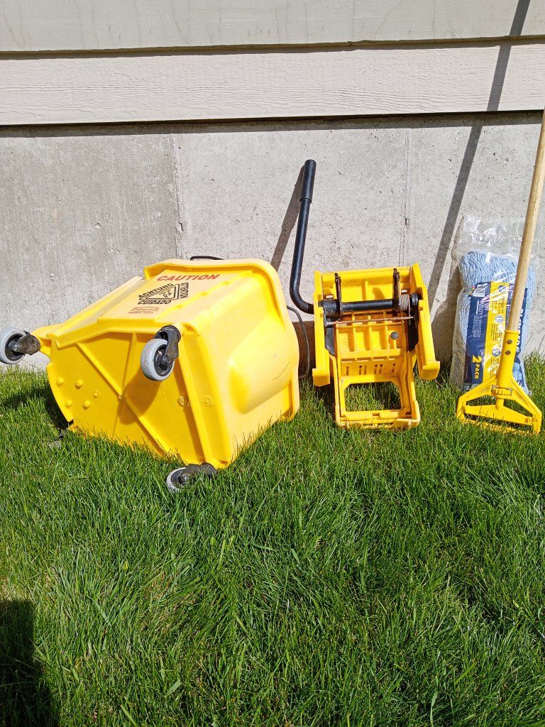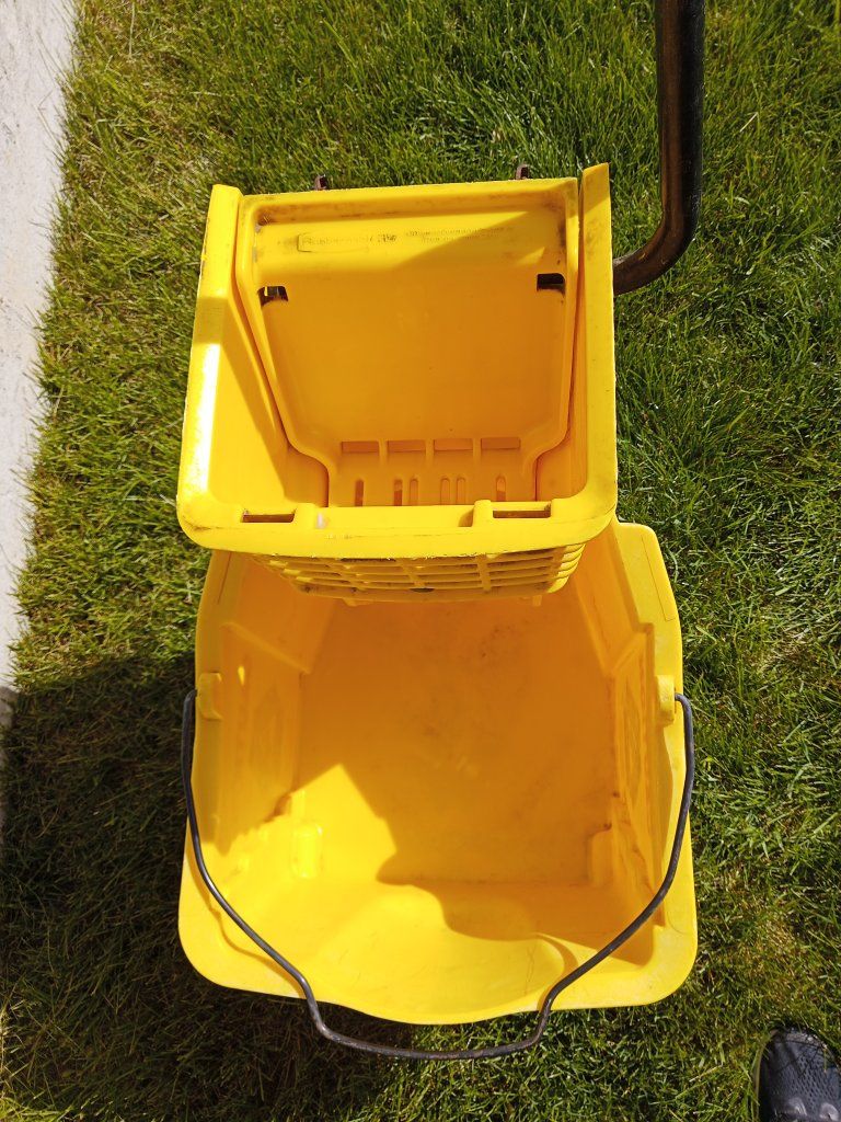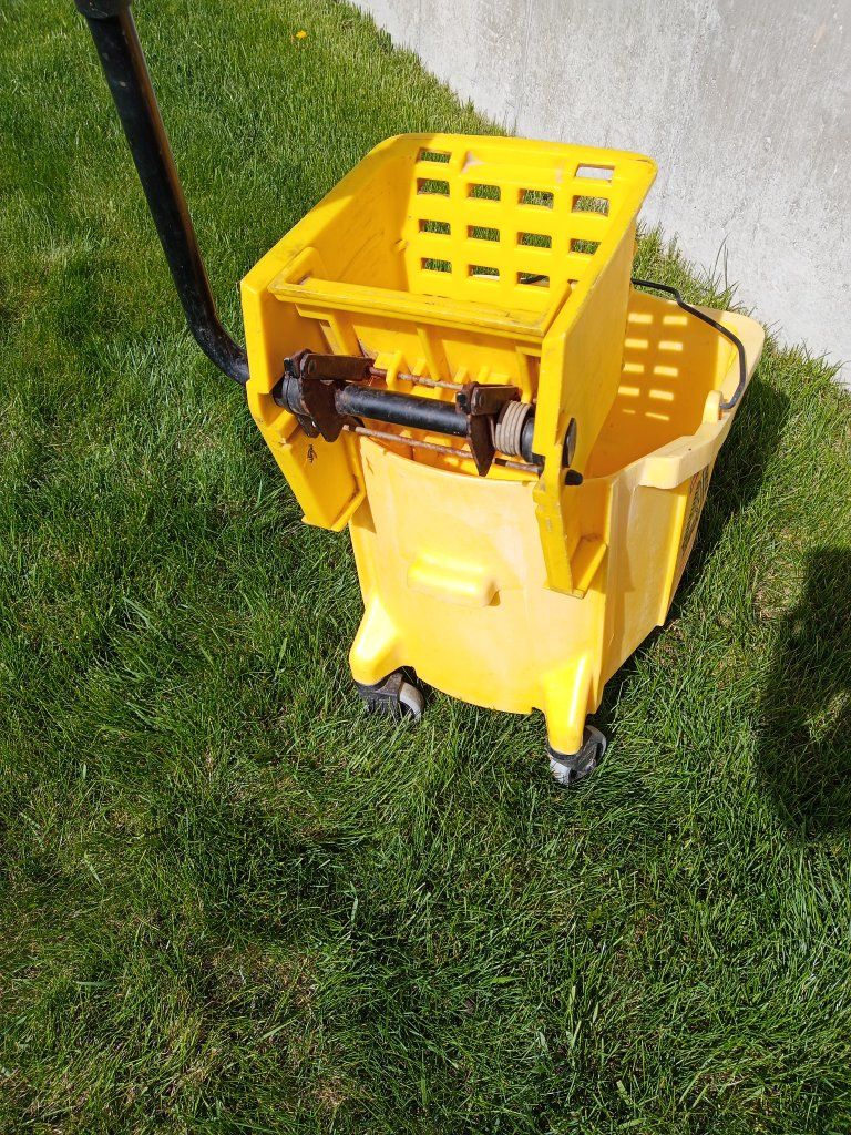 Rubbermaid commercial bucket and wringer combo on wheels for cleaning and mopping. Includes mop handle and new package of 2 string mops.
