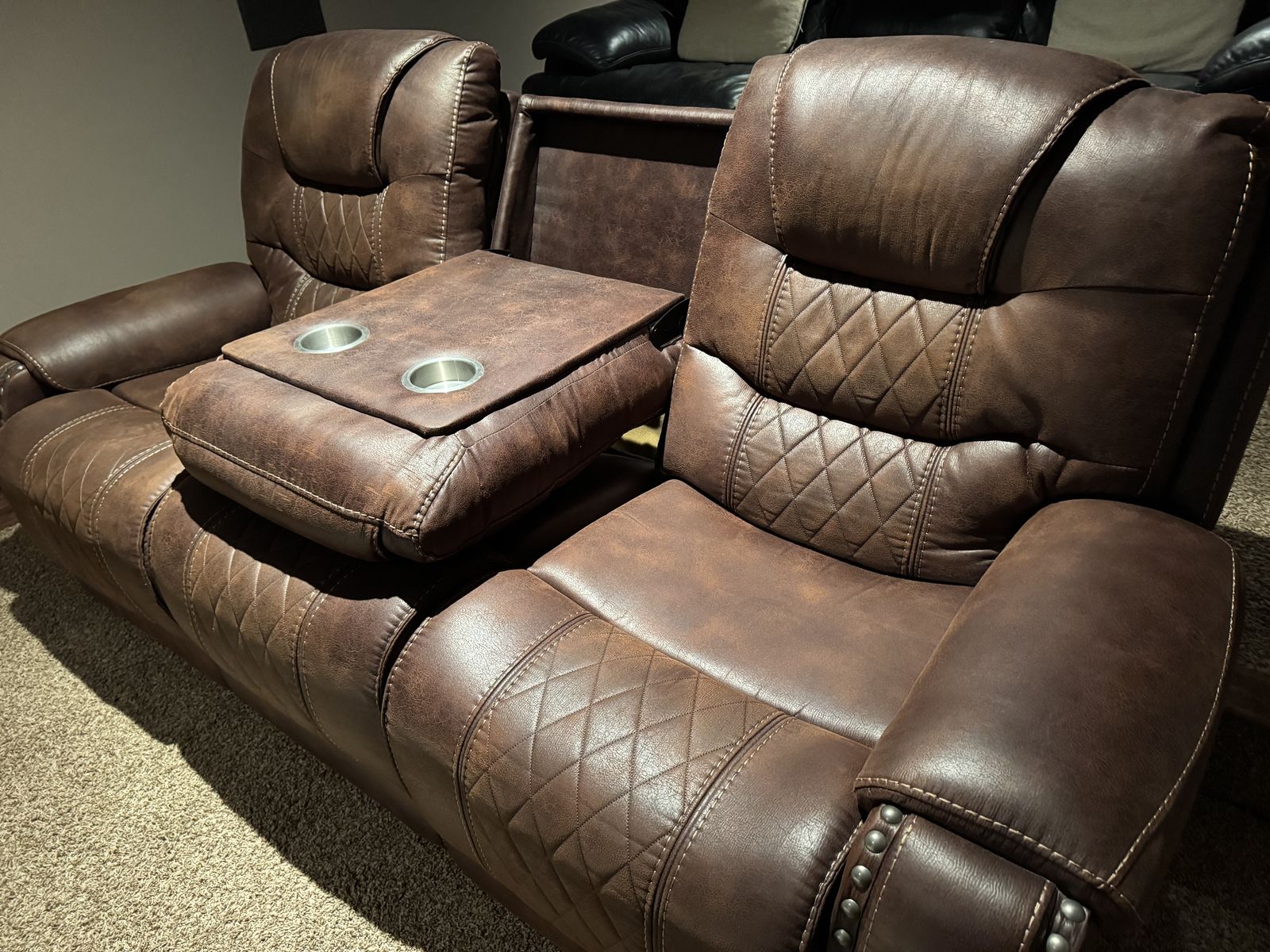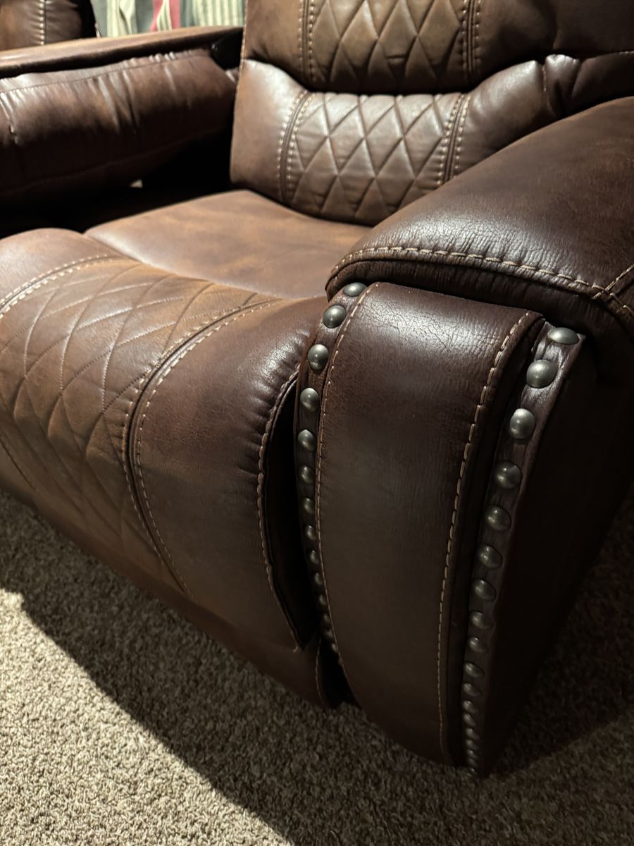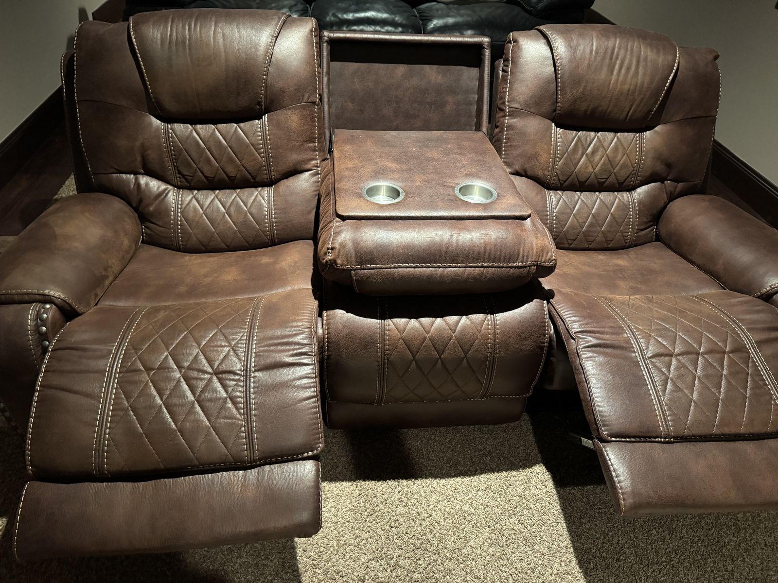This is a double recliner, with one non reclining seat in the center. The headrest has a separate control in addition to both sides having their own control. It is "Leather like". and only about 2 years old. It is approximately 7' wide by about 3' deep...(deeper by two feet when it is full recline. Not worn out, in fact still quite comfortable.