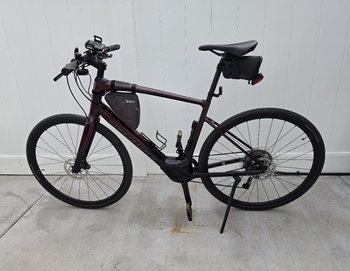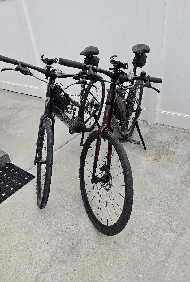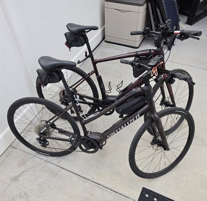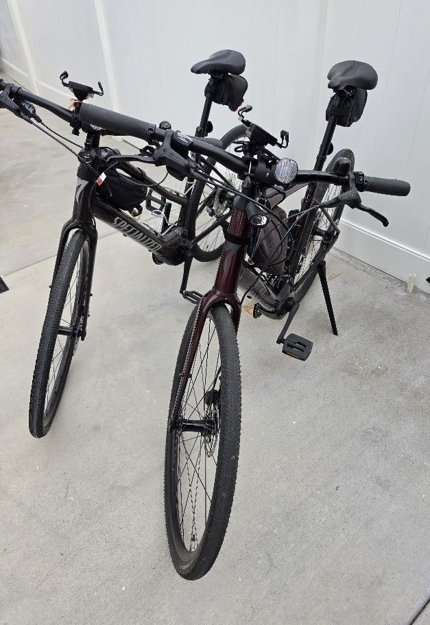 The first e-bike is a 2021 Specialized Turbo Vado SL 4.0 in Crimson Red color. There is no other e-bike out there with ride quality, range, and power like this one, at a weight that is easy enough to carry (34lbs). This e-bike is a large frame (5'9" to 6'1"). It has an integrated extra-bright, built-in lights in front and back to be seen. Vado is its Turbo SL technology, the advanced and integrated electric bike system that delivers and unequaled combination of light-weight, natural feel, anti-theft functions, training tips, a full-function bike computer, ride anywhere range, and many more features that can be given to you. It works with your mobile phone for a detailed and monitored ride. There are 551 miles on this bike. Several additional accessories are included. This bike is priced at $1600.