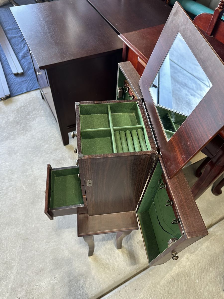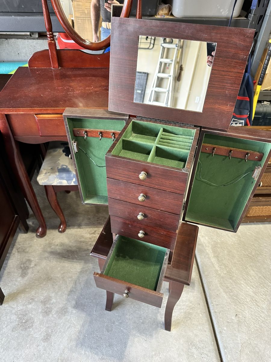 VenmoSelling a self-standing jewelry box. Four draws plus the top tray provide ample storage for rings, earrings, bracelets, and watches. The two side doors open for necklace storage.