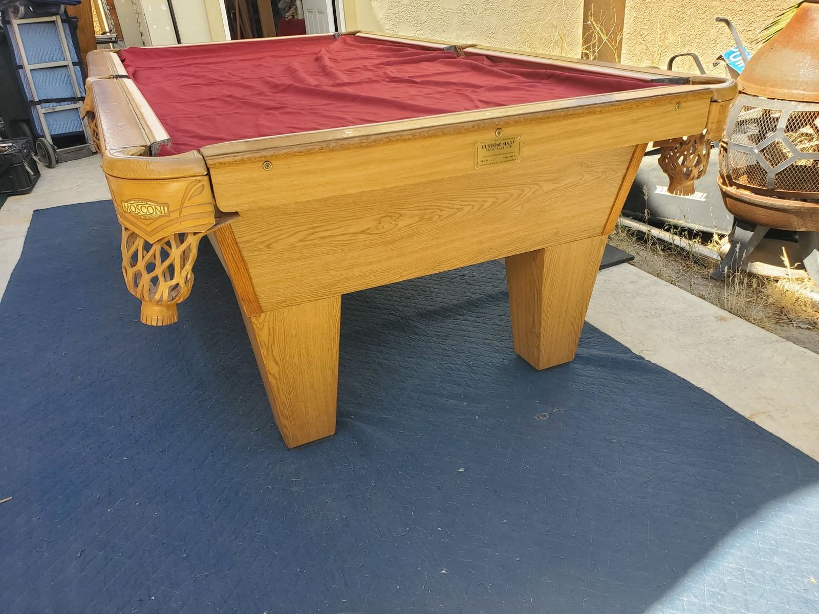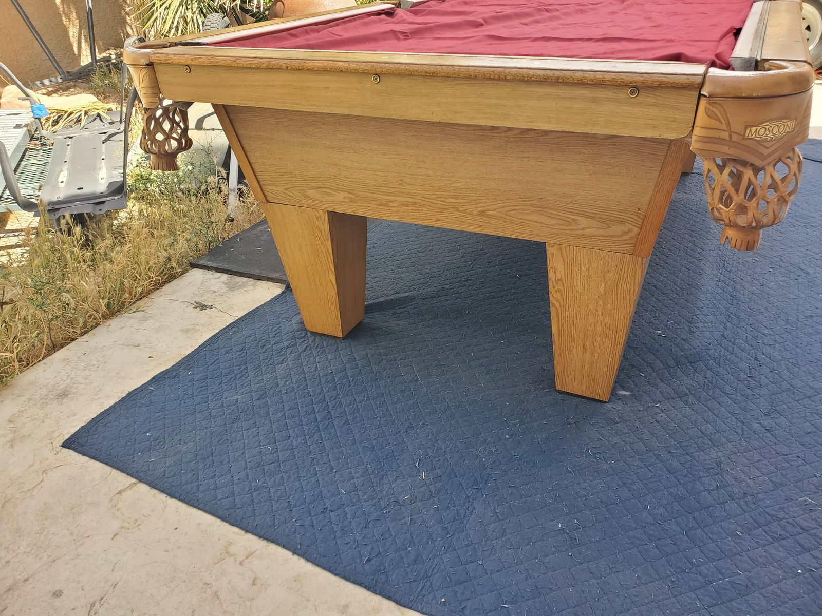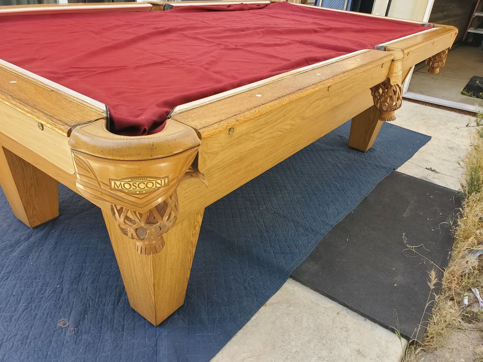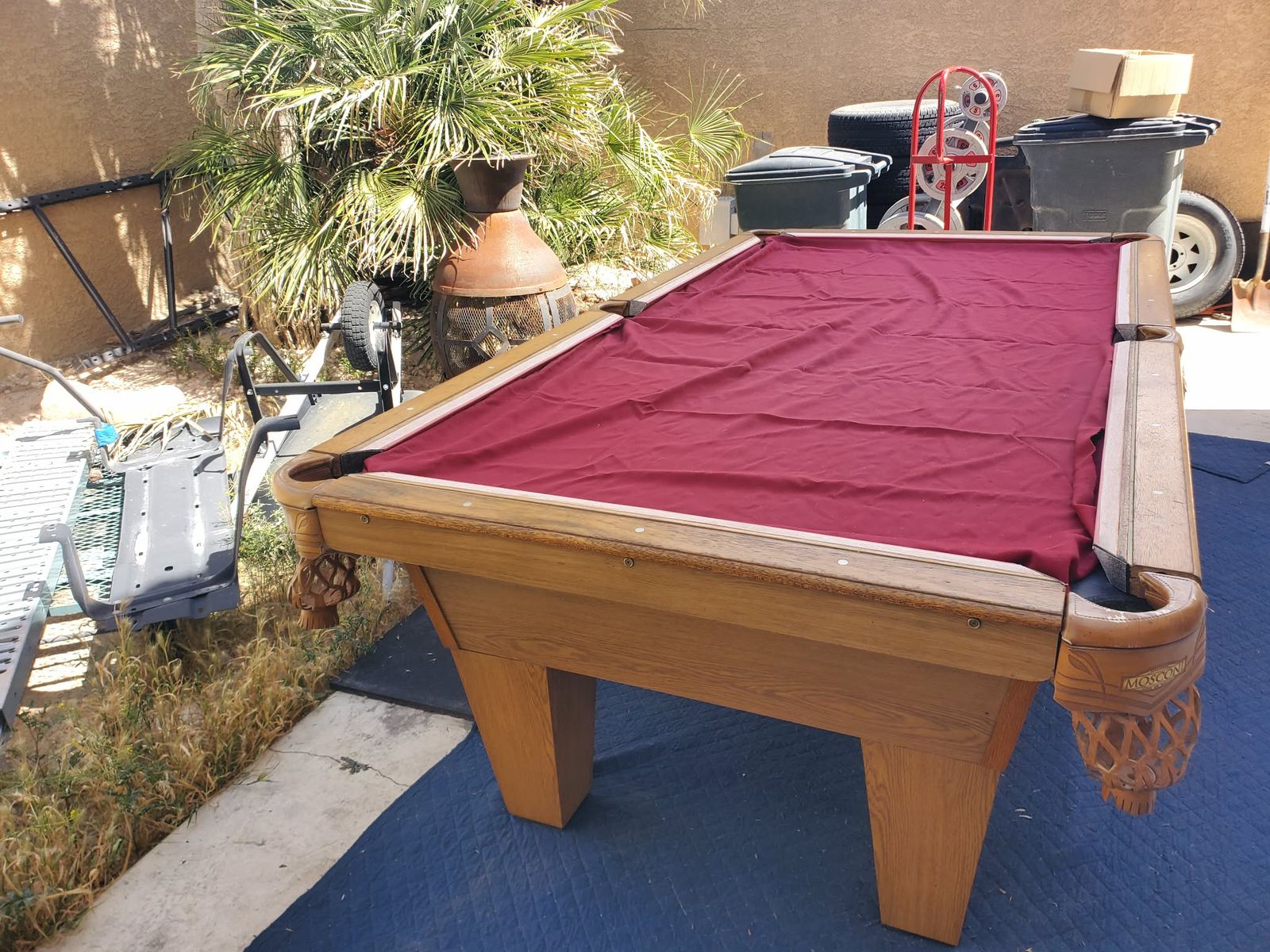8ft empire pool table in a golden oak stain. Comes with accessories and delivery and installation including whatever color cloth you like. Table has brand new cushions as well. Table was only set up outside for pictures and then was put back in storage.