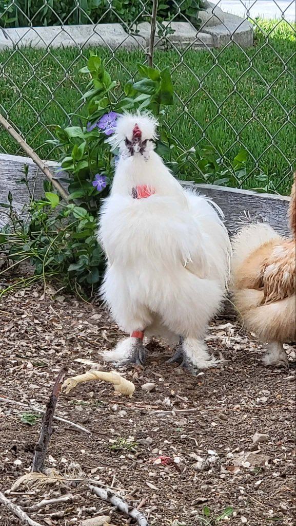 Zombie Rooster: is a white Silky chicken bread with an Ayam Cemani. The more black the skin and feet and comb the more valuable they are, adding even more value is the pure white feathers and if you have the traditional Silky look like feathers on their legs and feet that is very desirable. One that has all of these traits like mine is usually sold for $100+, but I'm really hoping these go to a good home that alows these little guys to crow to thier harts content.