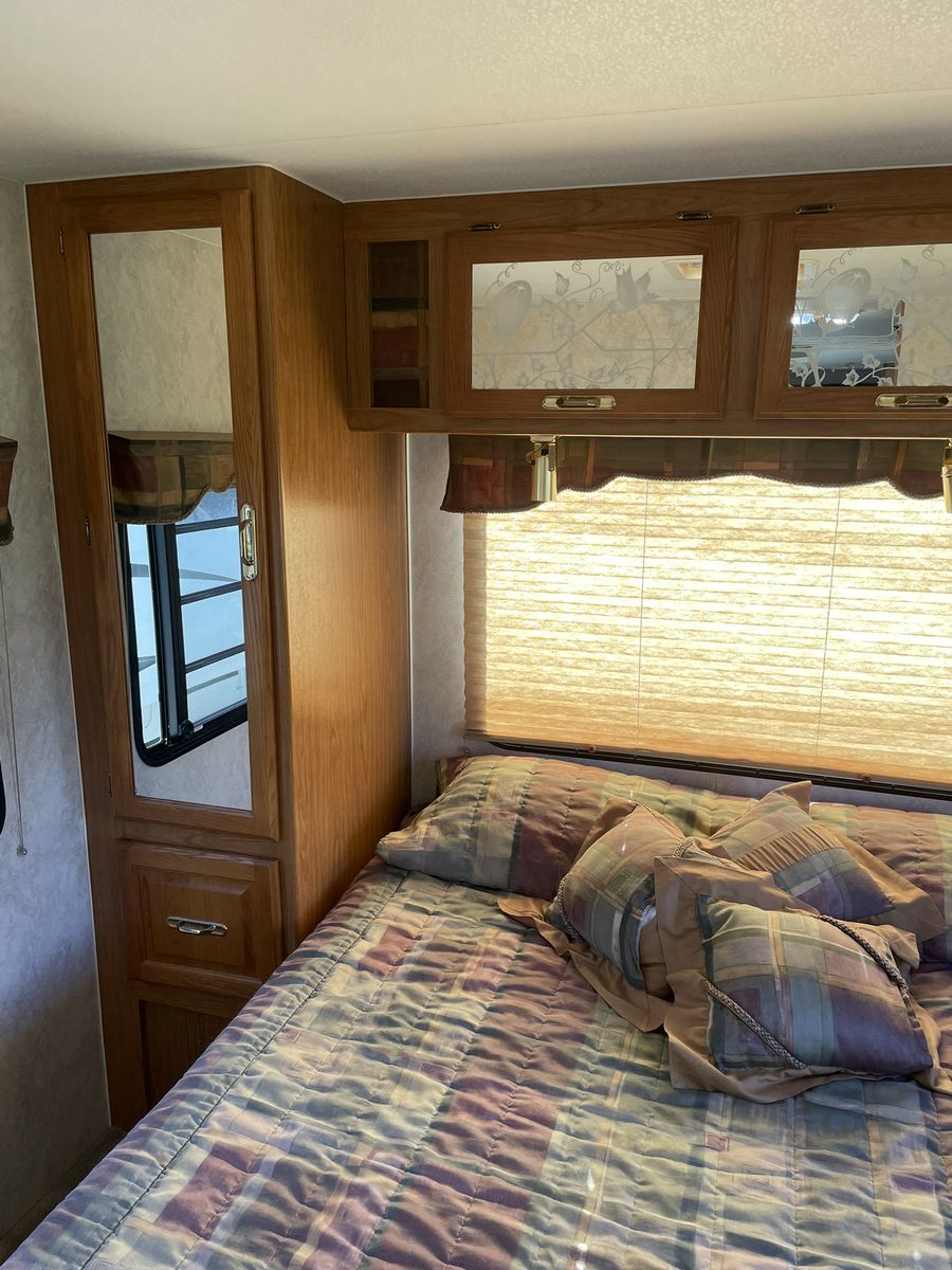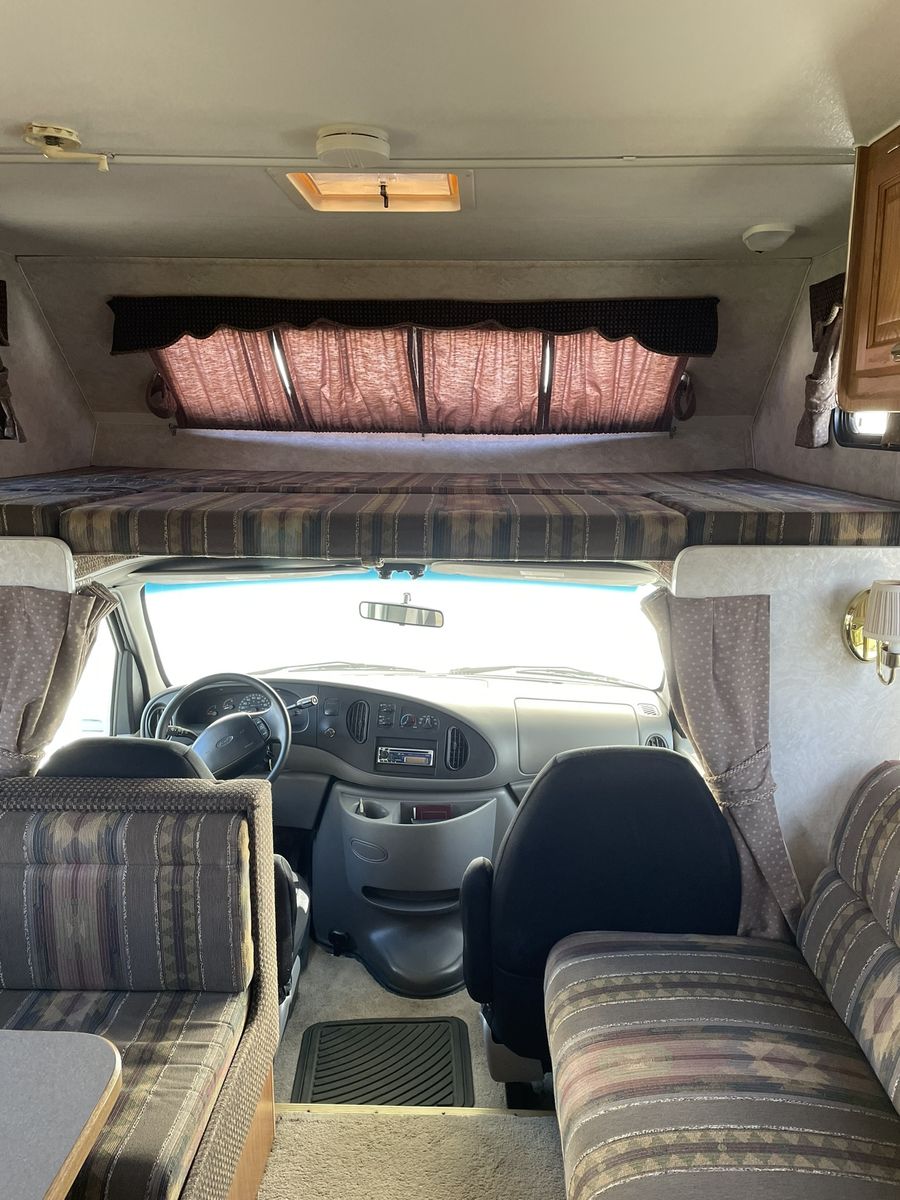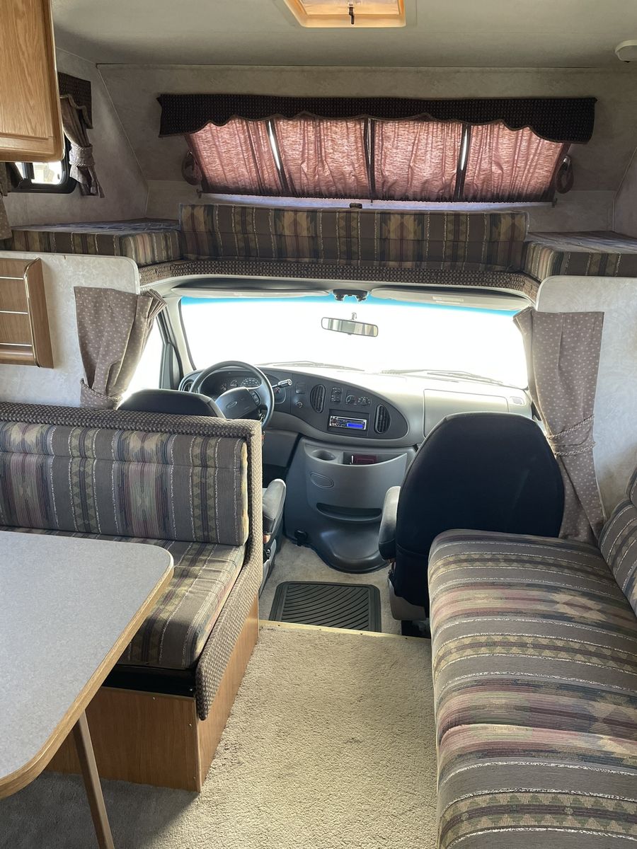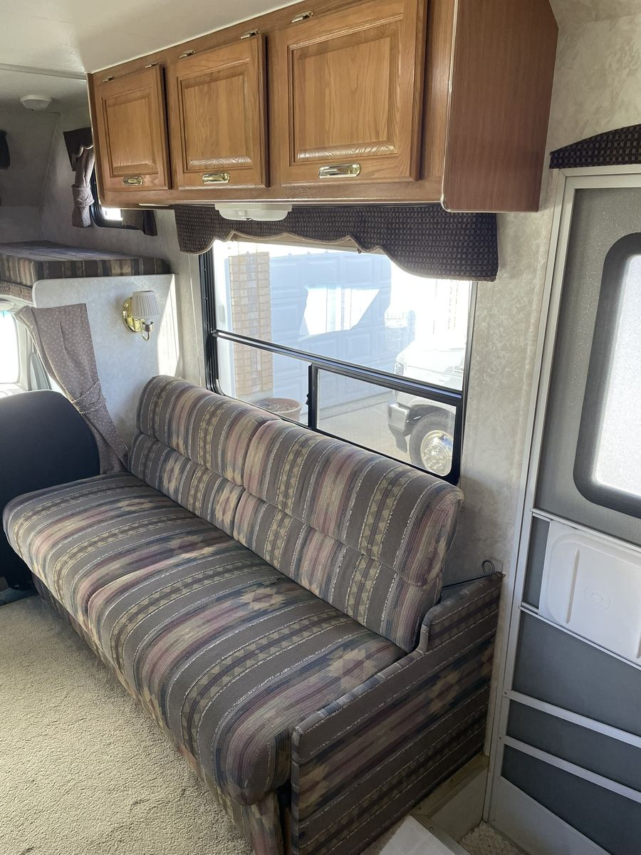 Must See! 28 ft. Class C motorhome built on a Ford E350 chassis with a V10 engine. Sleeps up to 8 people with a walk around queen size master bed, upper bunk, sofa sleeper and convertible dinette. Separate bathroom and shower areas. Plenty of storage with two closets, cupboards above the sofa and dinette as well as in the kitchen area. Outside storage includes a pass through compartment and several other compartments. Onboard generator, A/C, heater, 3 way refrigerator/freezer - all in good working condition. Very well taken care of and always stored indoors.