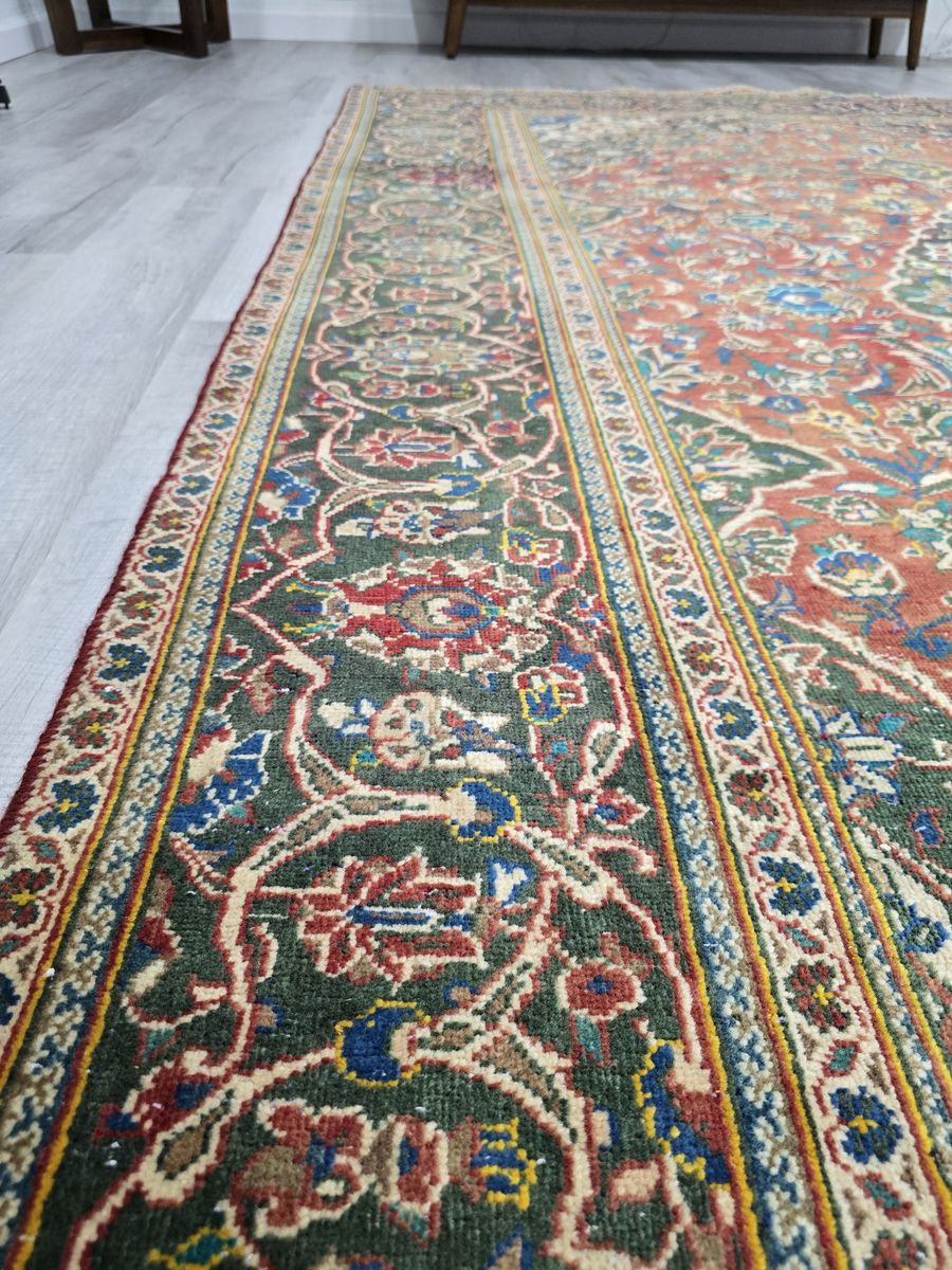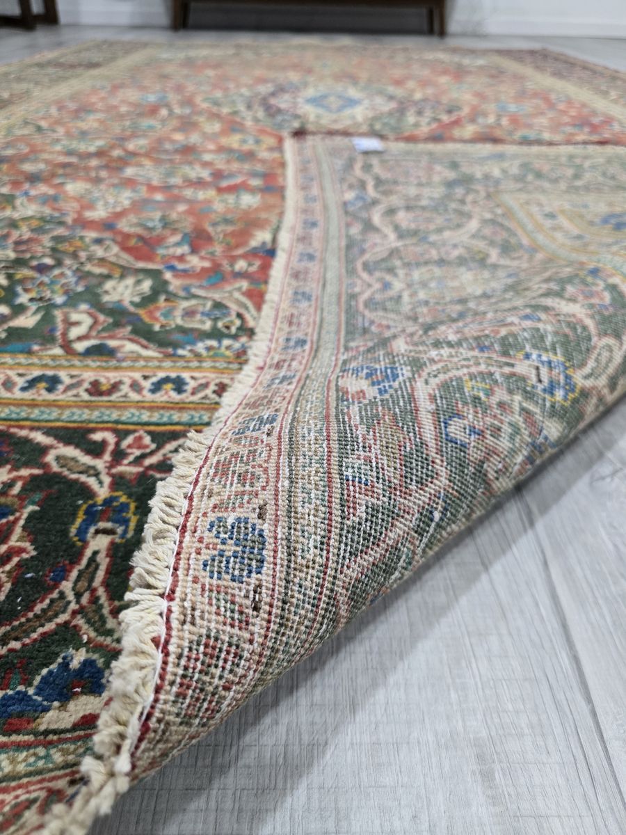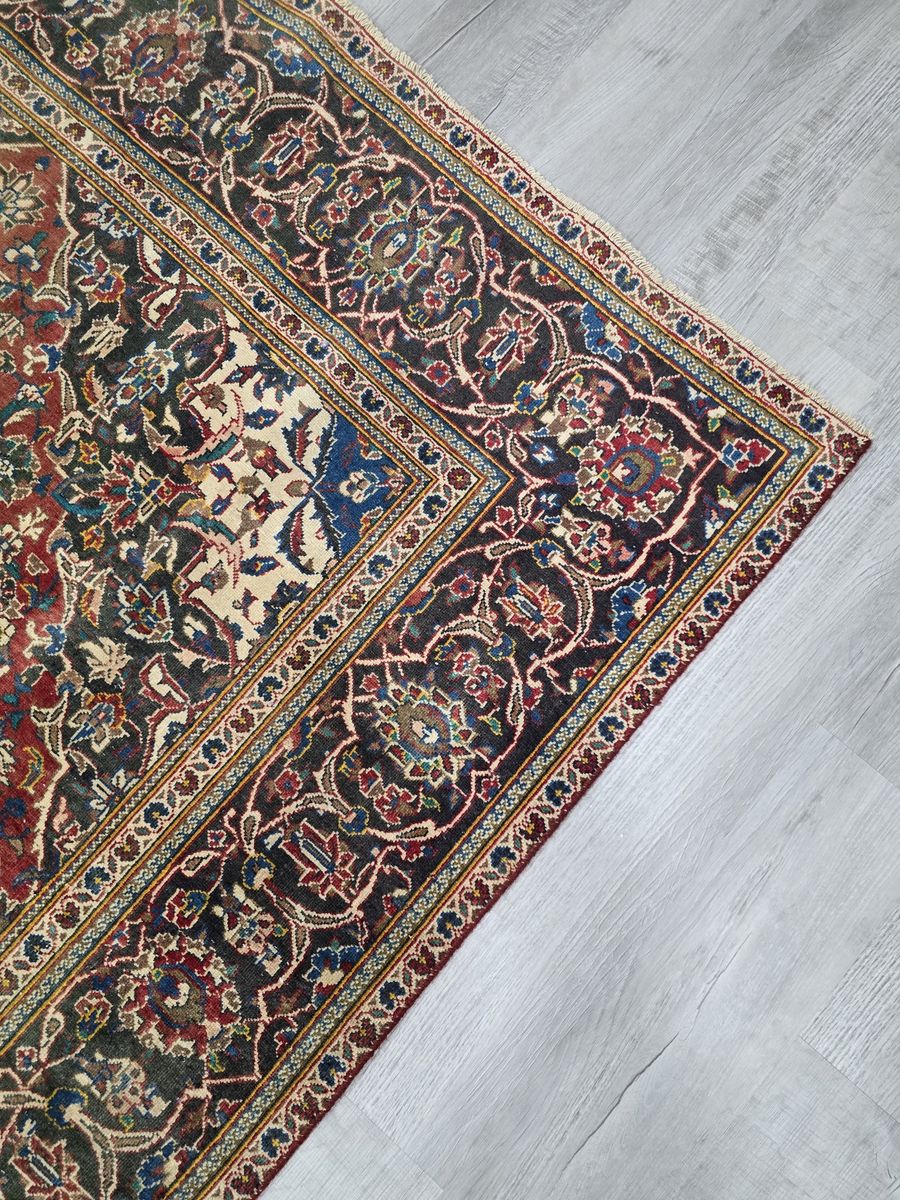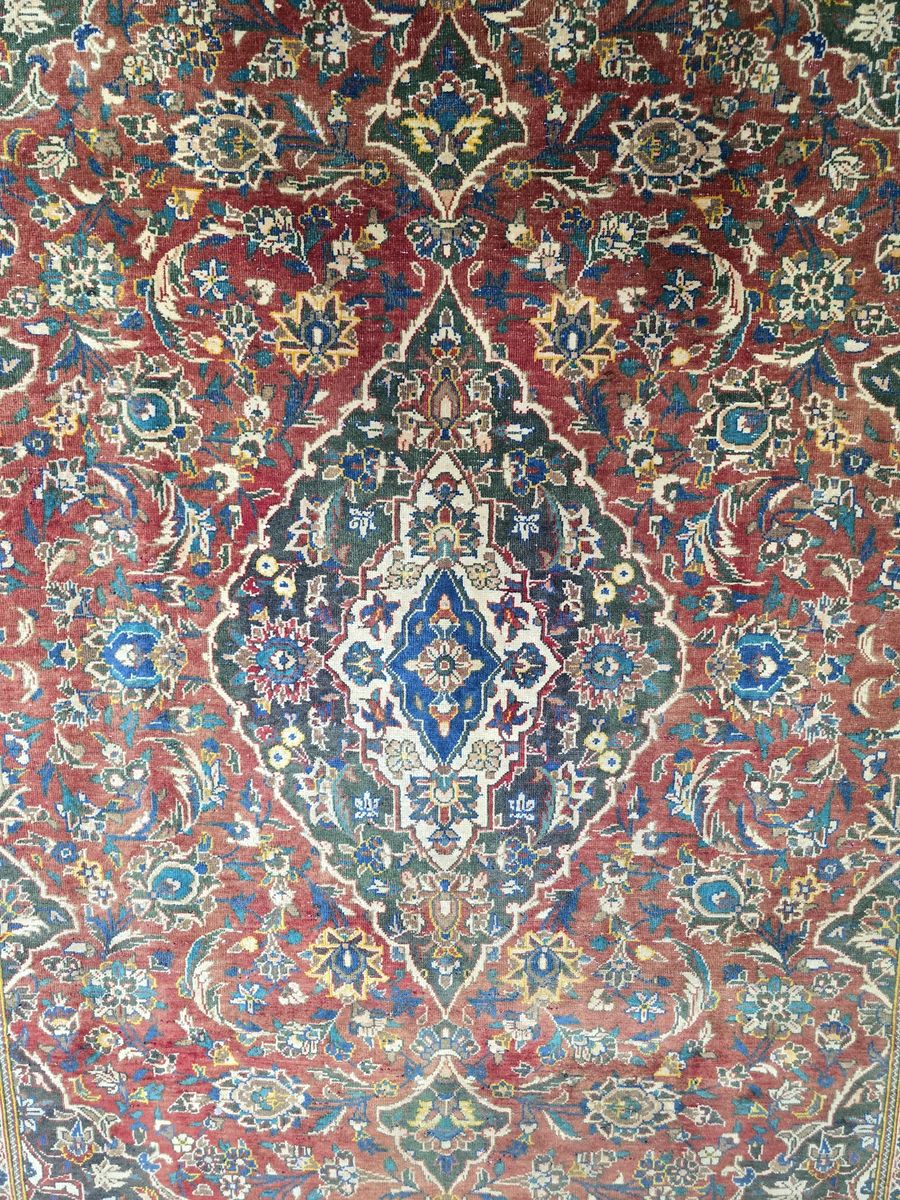 VenmoThis beautifully preserved Persian Kashan features a classic medallion-and-corner design framed by an elegant border. Its rich brick/rustic-red field is densely decorated with floral motifs in shades of teal, sapphire blue, ivory, and touches of gold. The central medallion in ivory, blue, and emerald anchors the composition. Subtle abrash enhances this rug's character and authenticity giving it a warm, time-softened glow. With its detailing, harmonious palette, and great craftsmanship, this Kashan brings sophistication into any space.