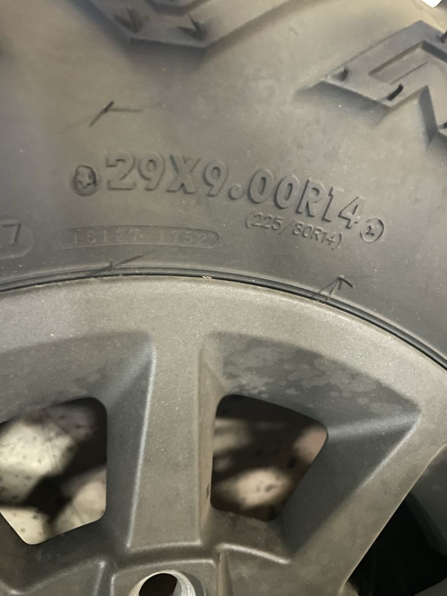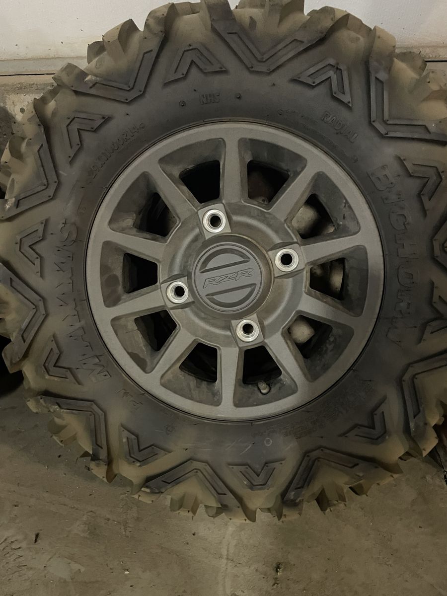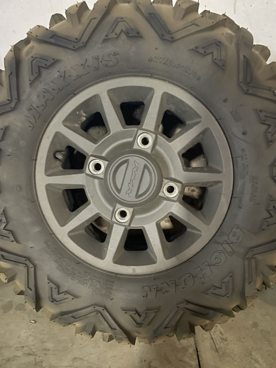 29-9-14 fronts and 29-11-14 rears off Razer 1000 Turbo! Stock Maxxis Bighorn’s with maybe 10 miles! Excellent tires and wheels! $600.00