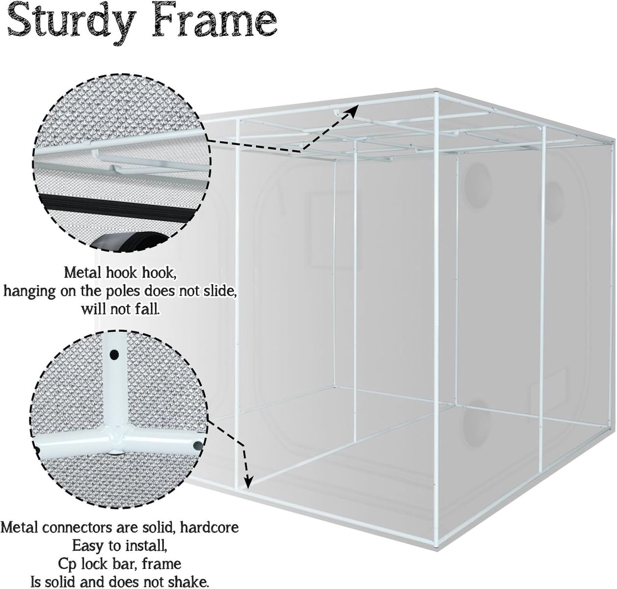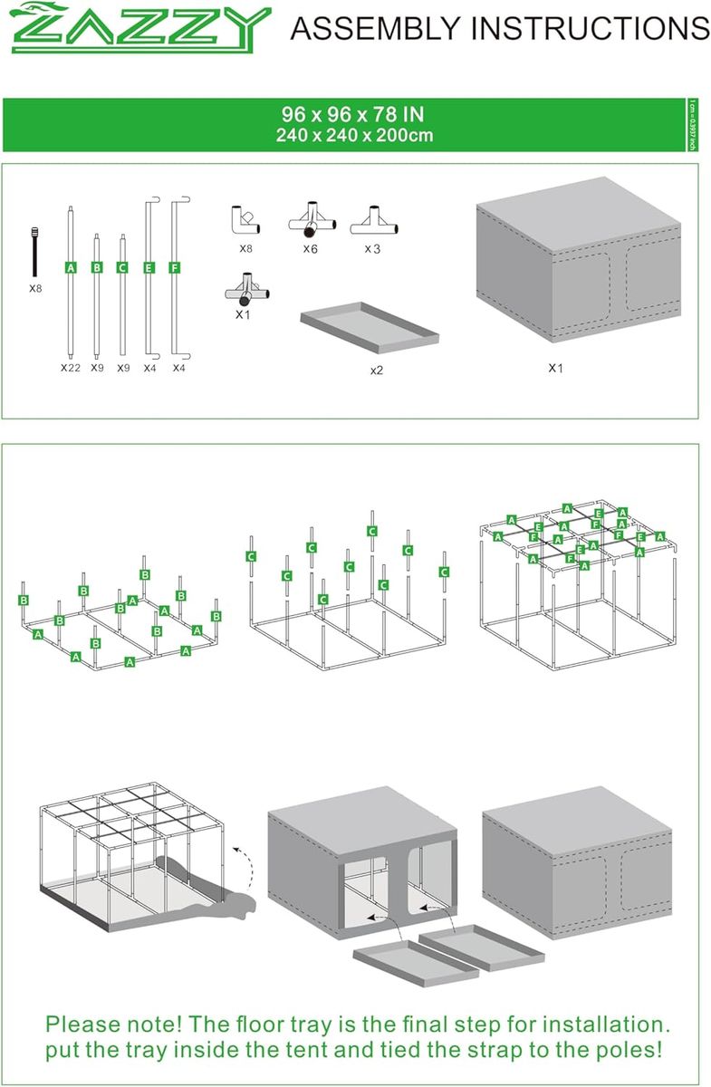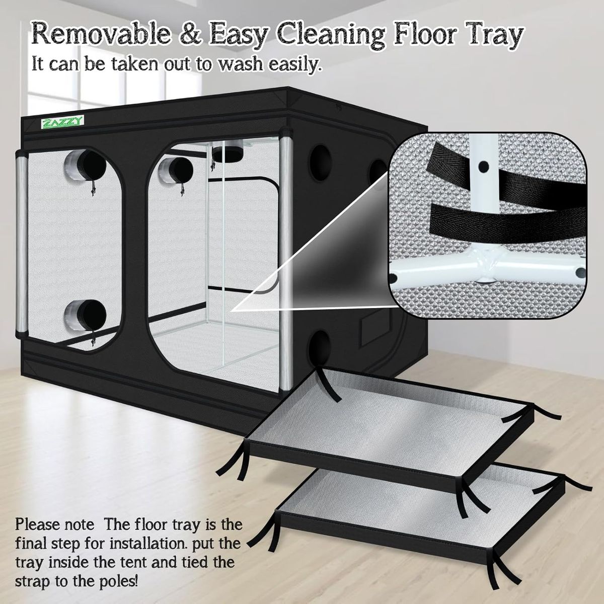 Features include a high-reflective mylar interior, heavy-duty frame, ventilation ports, observation window, and removable floor tray—great for indoor growing setups.
