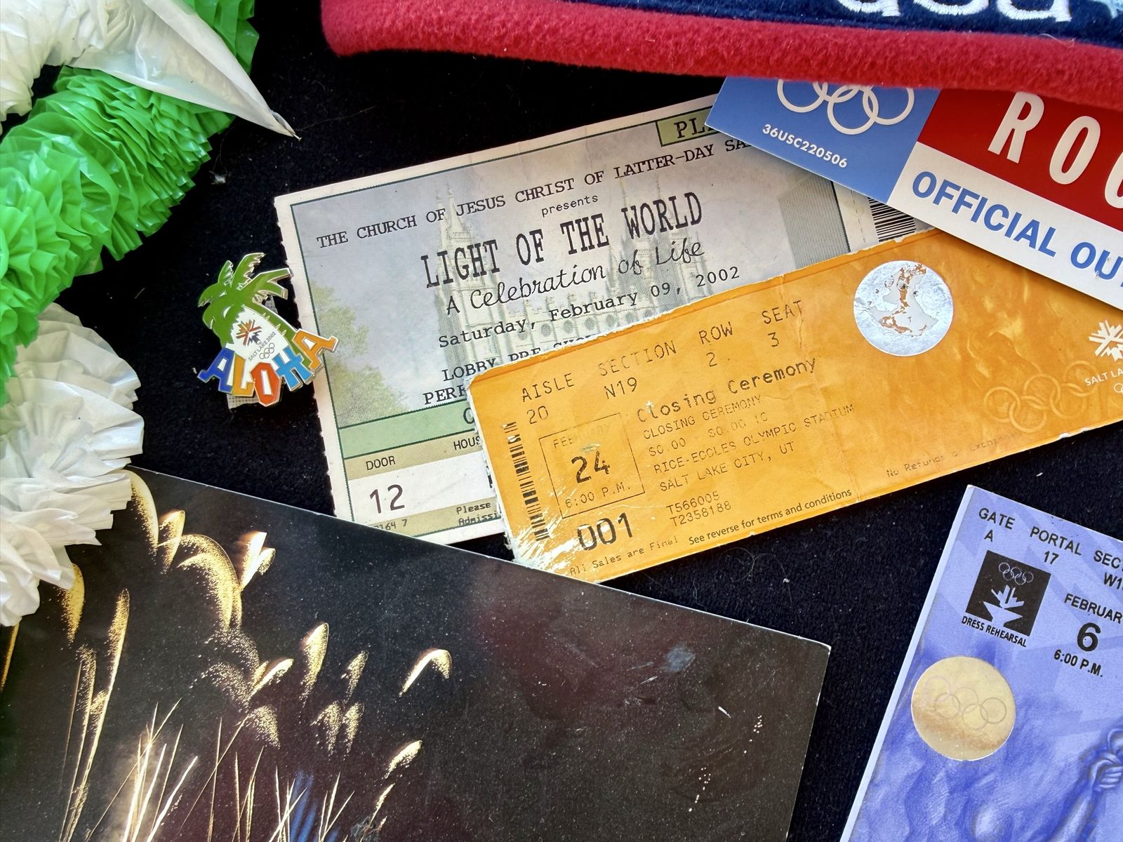 ApplePayAwesome collection of Salt Lake 2002 Olympic Winter Games stuff! Has a Roots USA*2002 hat with some cool pins like the 'Thank You' one and the ski jumpers. Also includes the official diploma, tickets for the Closing Ceremony, Opening Ceremony Dress Rehearsal, and the Light of the World event. Plus, there's an Aloha Salt Lake 2002 pin, a fireworks photo, and a handwritten note from Mitt Romney. Super cool for any collector!