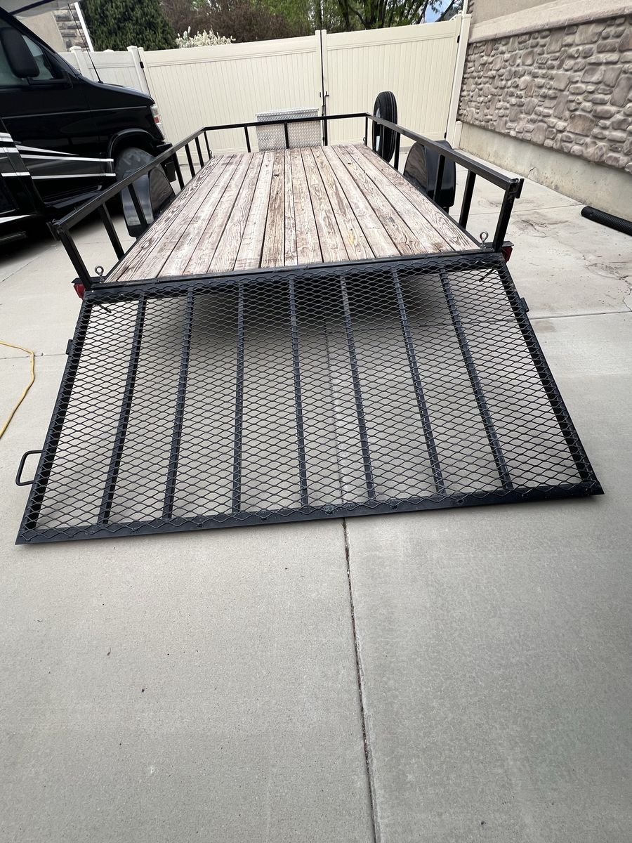 Total length with tongue: 17’6” Total with including the fenders: 8’5” Drop gate: 50”