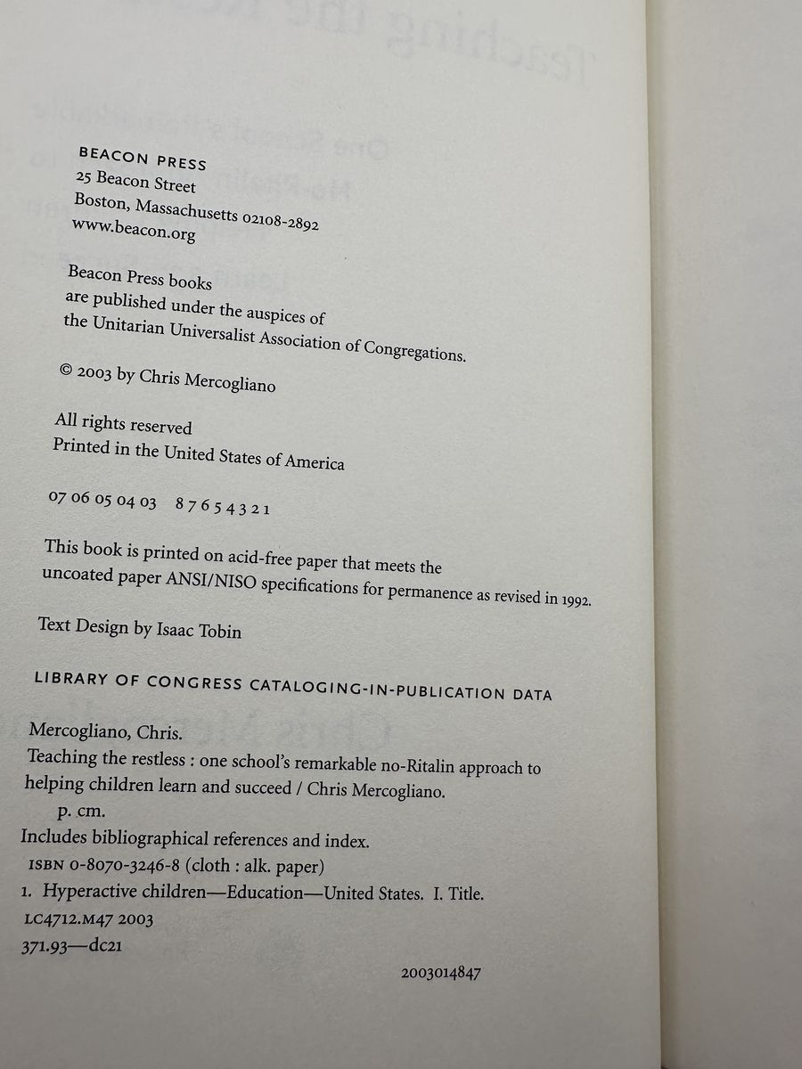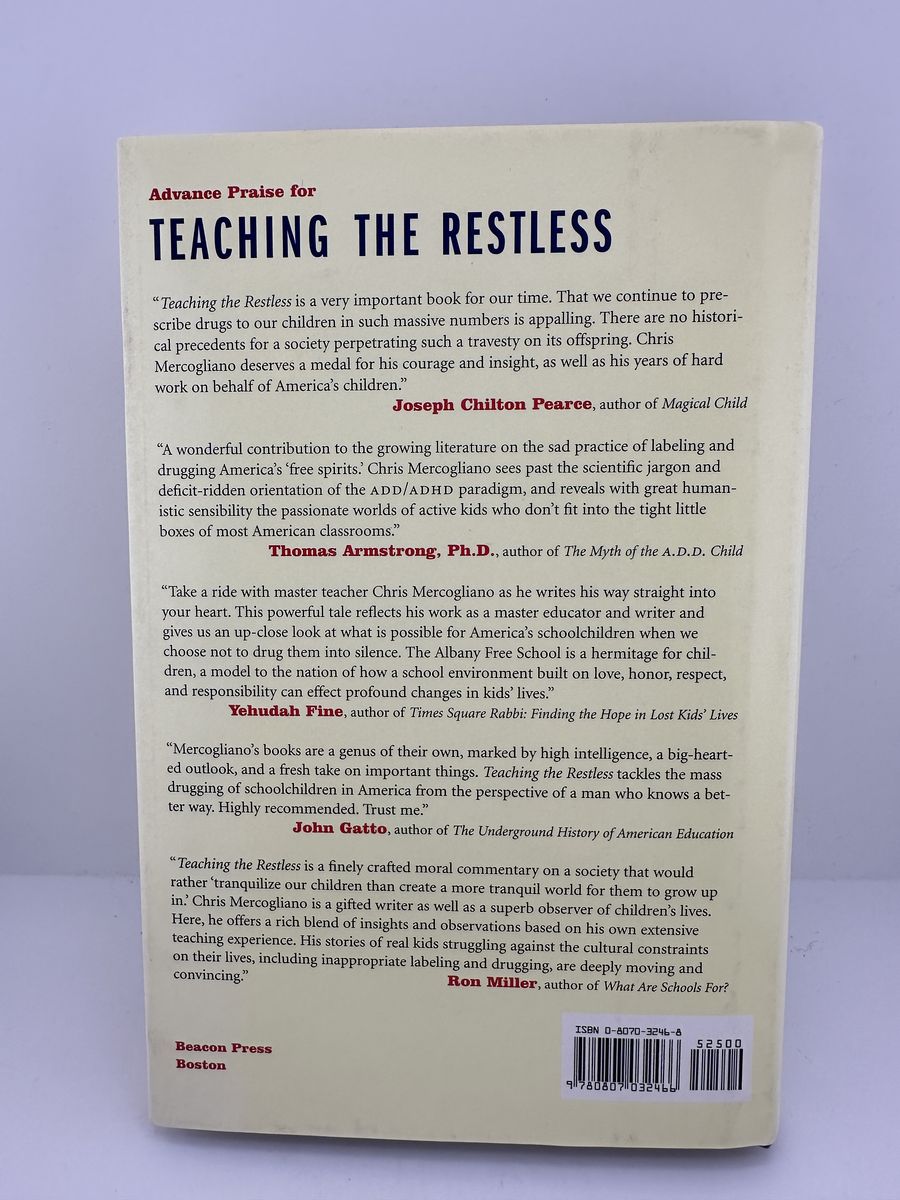 ApplePayTeaching the Restless by Chris Mercogliano (2003, Beacon Press). Hardcover with dust jacket in good condition. Explores alternative education approaches without medication for ADHD. Clean pages, solid binding, with some jacket wear—great reading copy.
