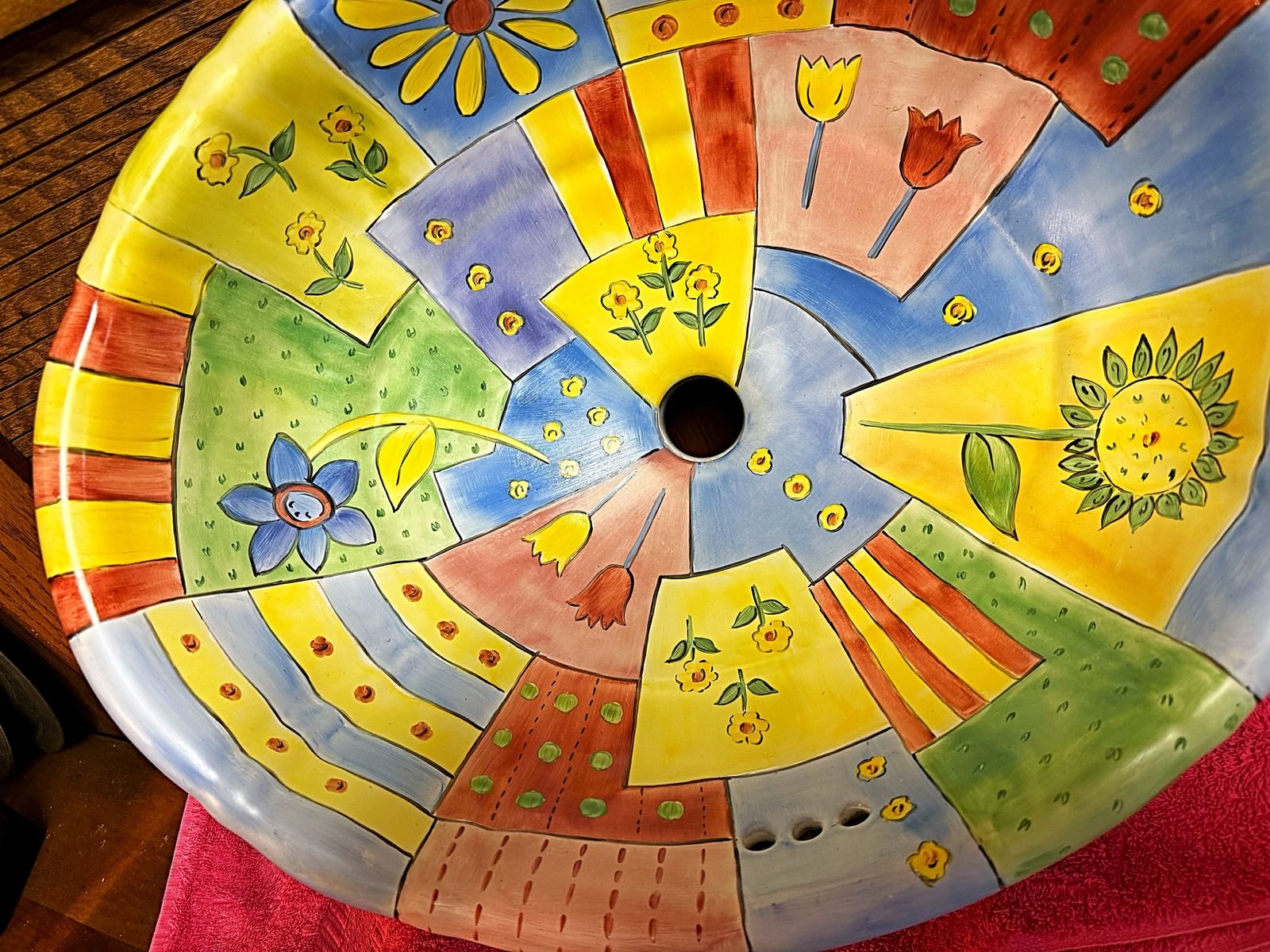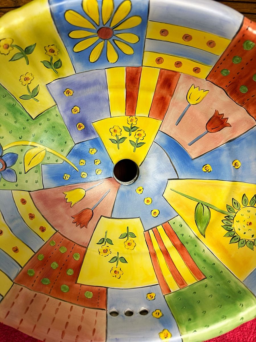 CashAppFound in the garage, this colorful hand painted ceramic sink would make the great statement piece for the right decor. Very thick. Does have a hairline crack which is exactly that, the depth of a hair which absolutely does not go thru the thick ceramic. Measures from the outside: 9 1/2" tall x 19" long x 16" across. No clue from whence it came, however it's bound to catch your guests attention & bring a smile to your face.