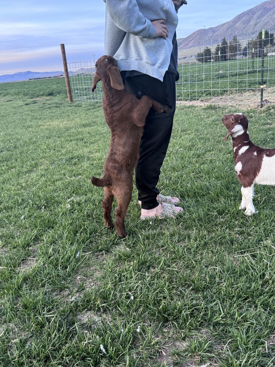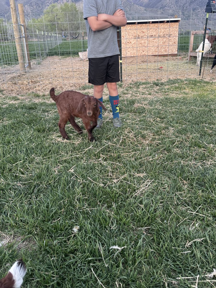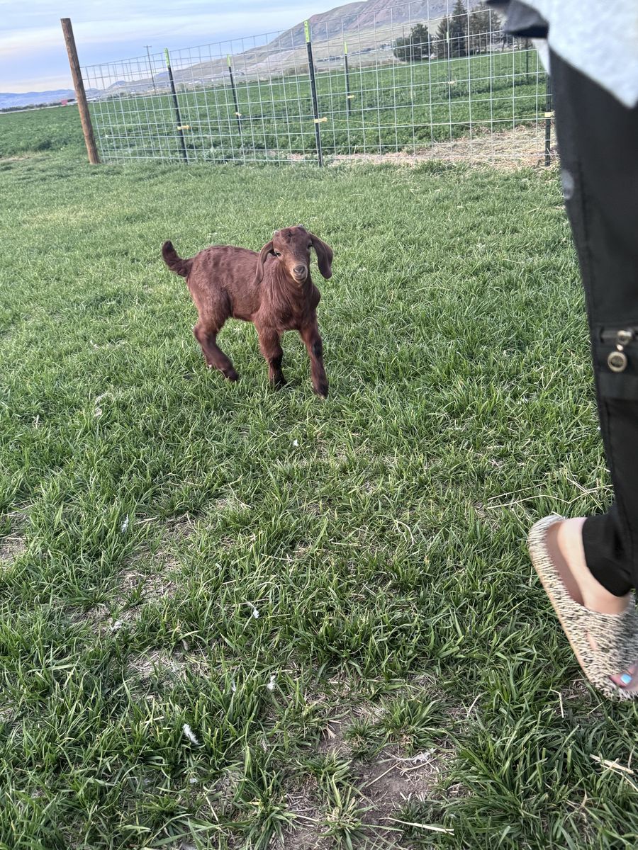 He was born March 15th he is still on a bottle his dad is a moon spotted Boer so he could throw some cool colors, we can also band him if you want, check other adds to see his moon spotted sister