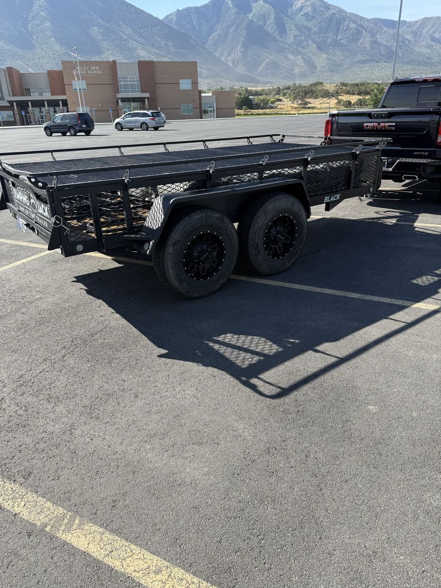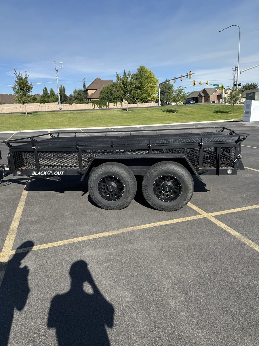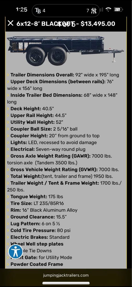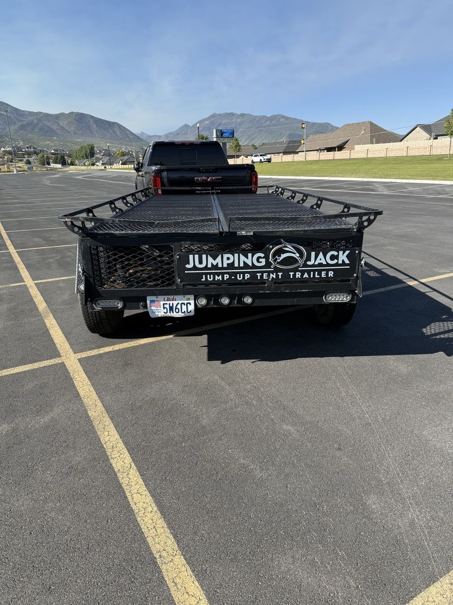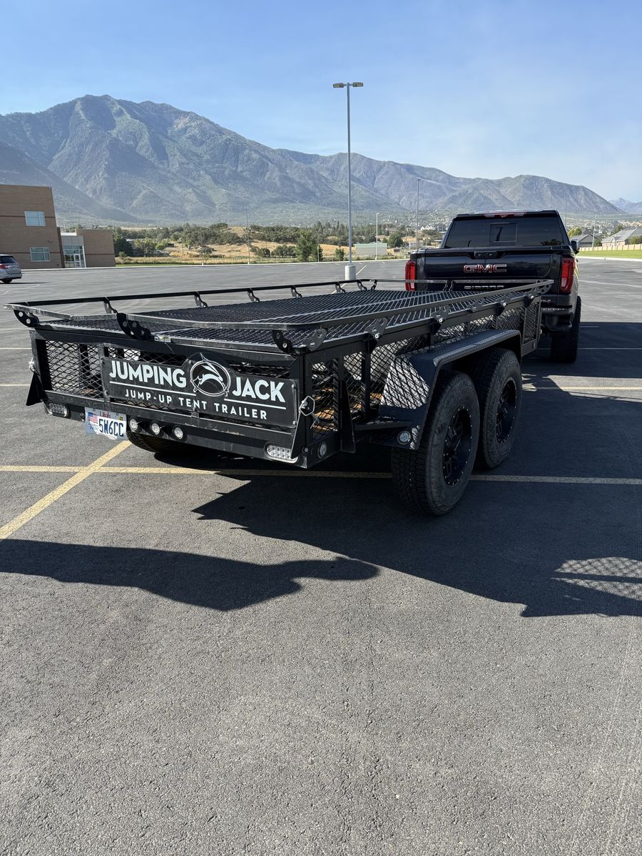 Jumping jack BLACK OUT Trailer Dimensions Overall: 92" wide x 195" long Upper Deck Dimensions (between rails): 76" wide x 156" long Inside Trailer Bed Dimensions: 68" wide x 148" long Deck Height: 40.5" Upper Rail Height: 44.5" Utility Wall Height: 52" Coupler Ball Size: 2 5/16" ball Coupler Height: 20" from ground to top Lights: LED, recessed to avoid damage Electrical: Seven-way round plug\