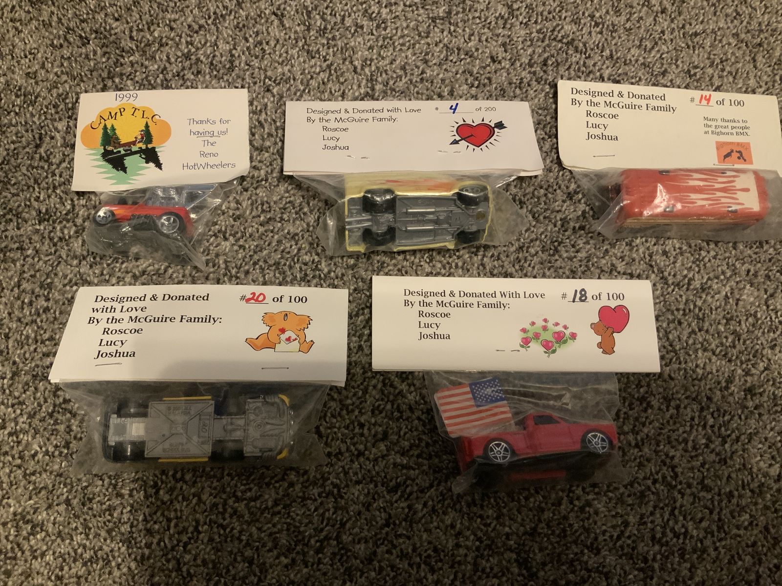 These cars are from 1991 to 2002. Most are mail in cars. The Camp TLC cars are customs made for a camp for Terminally Ill Children at Lake Tahoe. I am asking ten dollars each or all thirteen for one hundred dollars. I live in Nephi and accept texts and cash. Please see photos; all are like new.