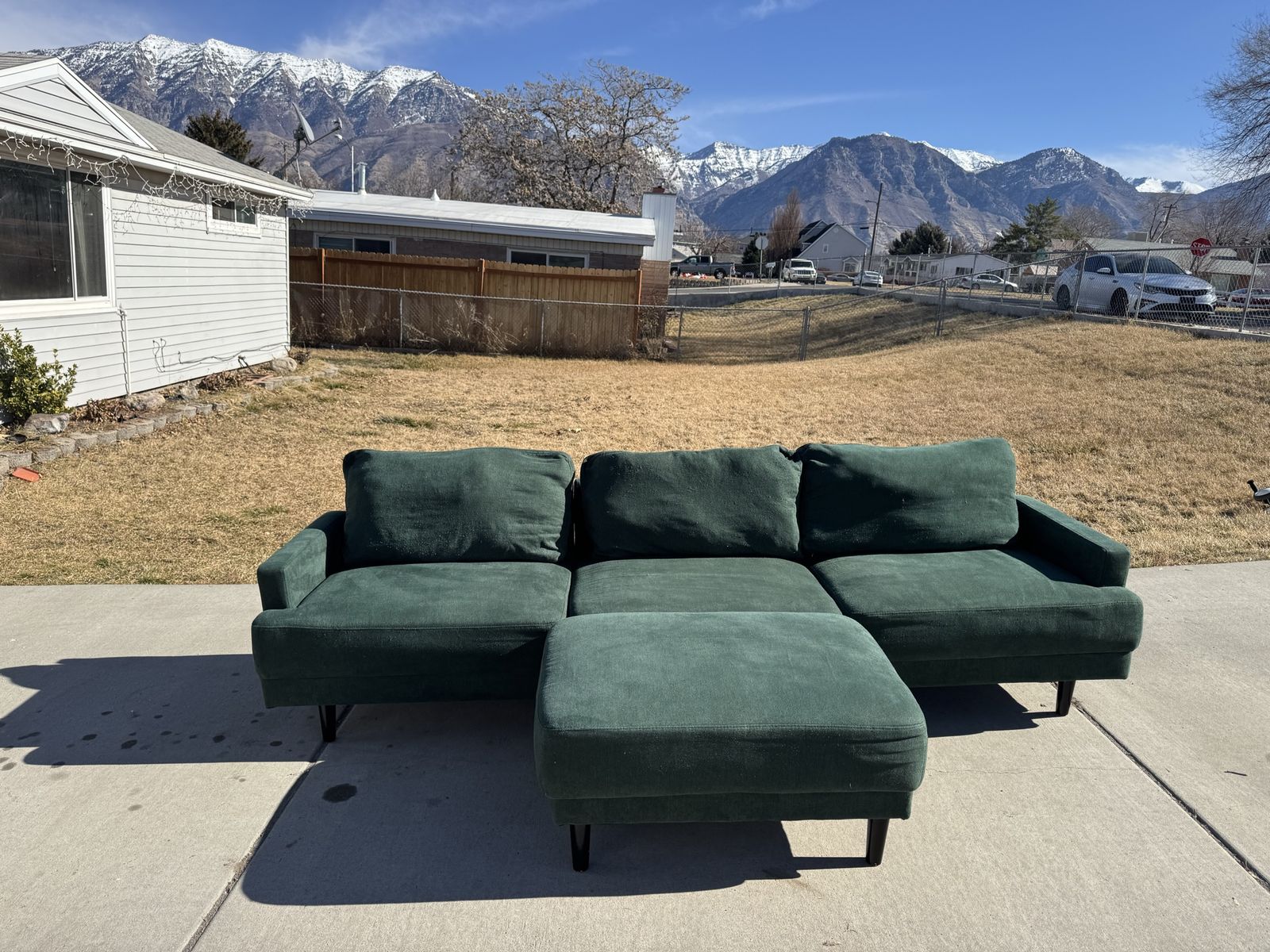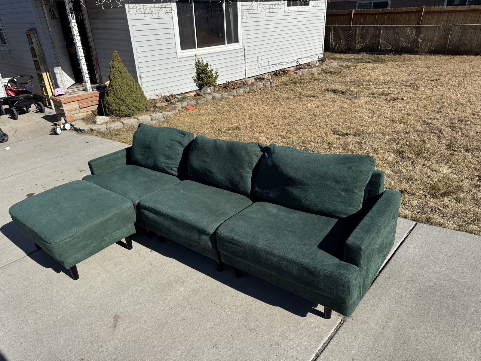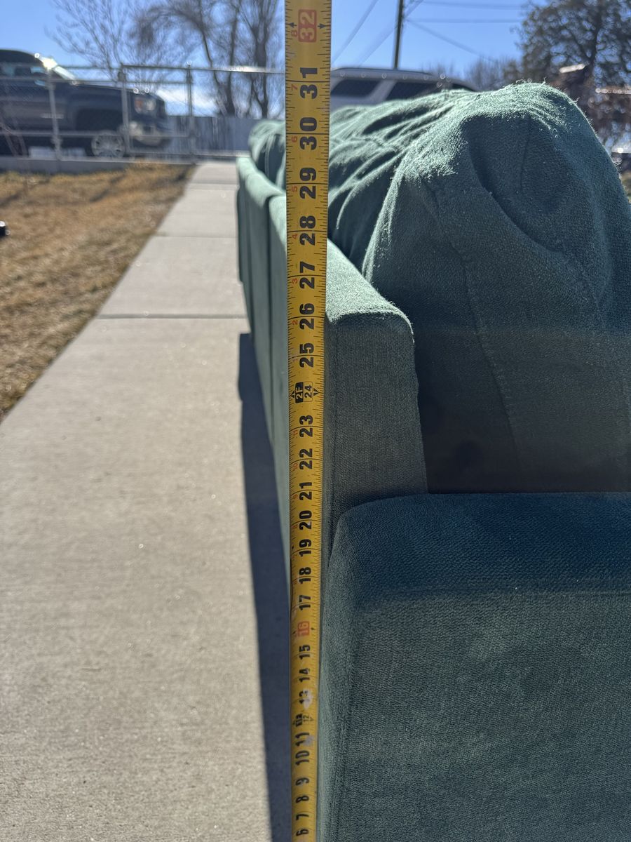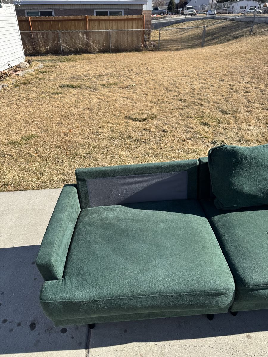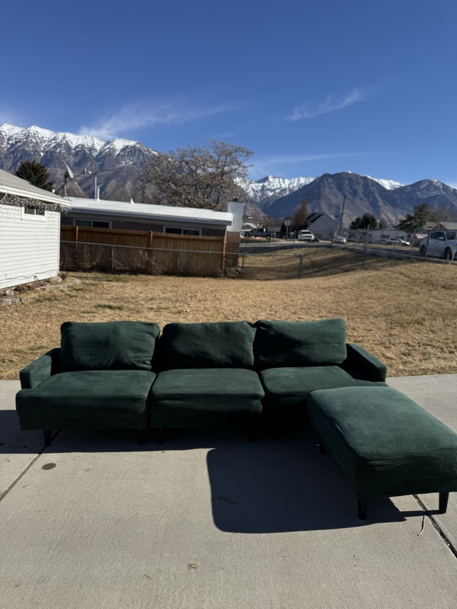 PayPalThe perfect green sectional couch! I love the color and style that this adds to the room. 3 pieces that lock together underneath and an ottoman that can move to any sections.