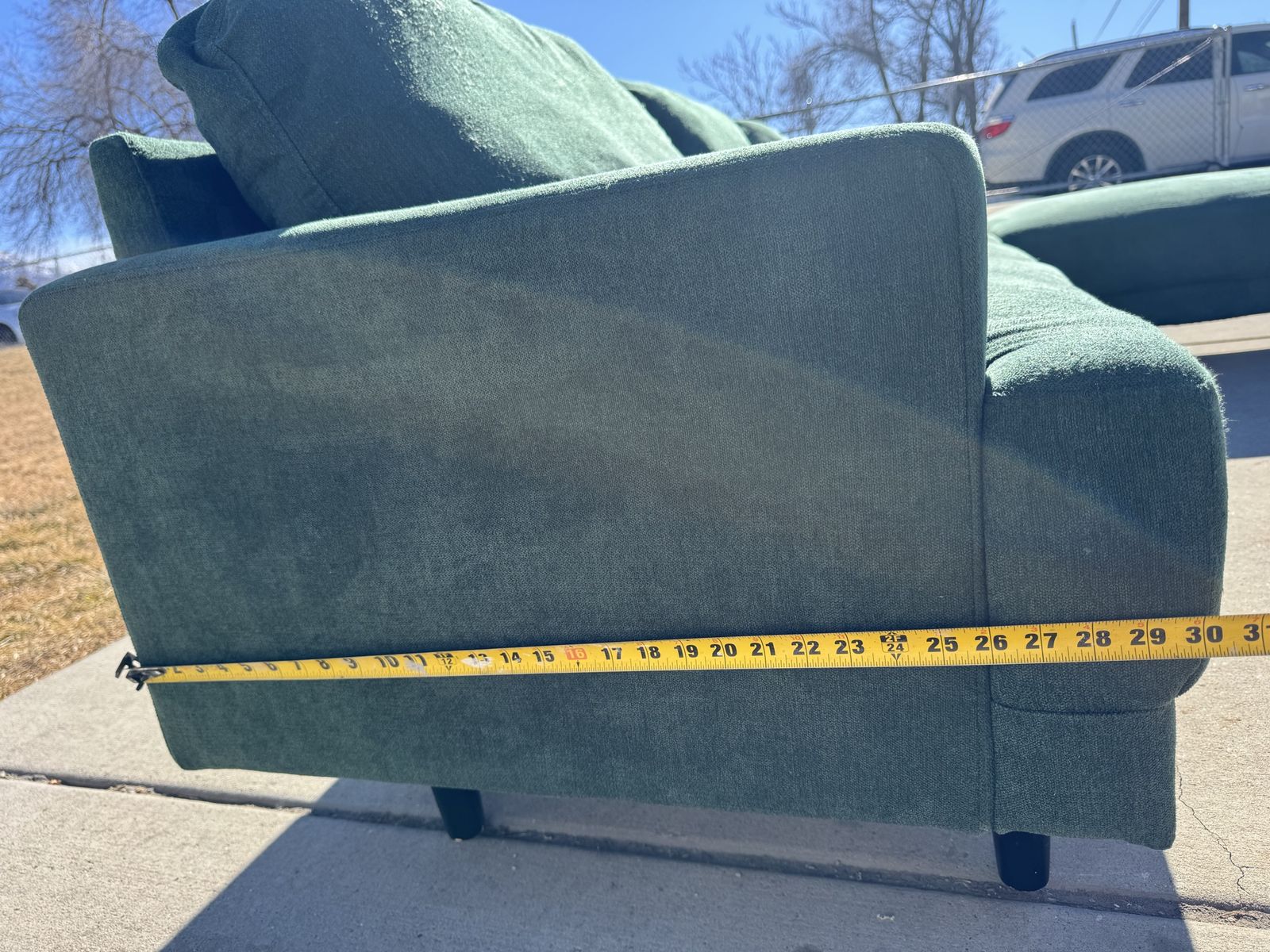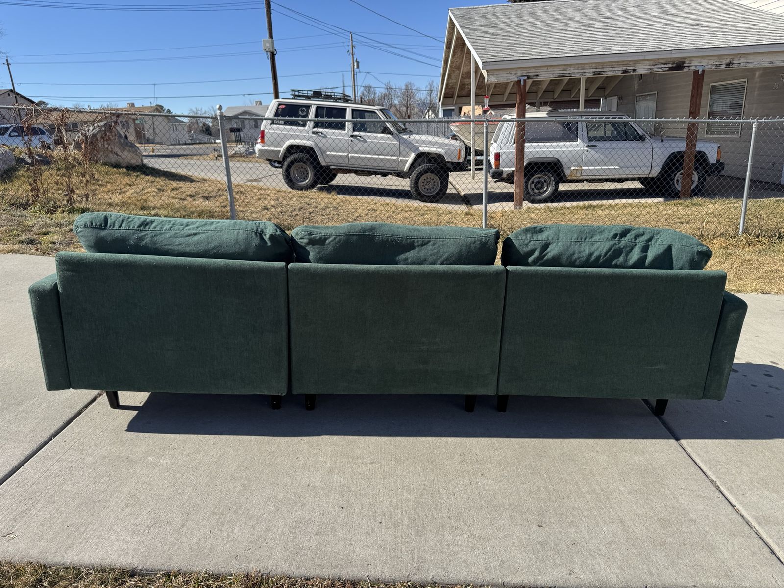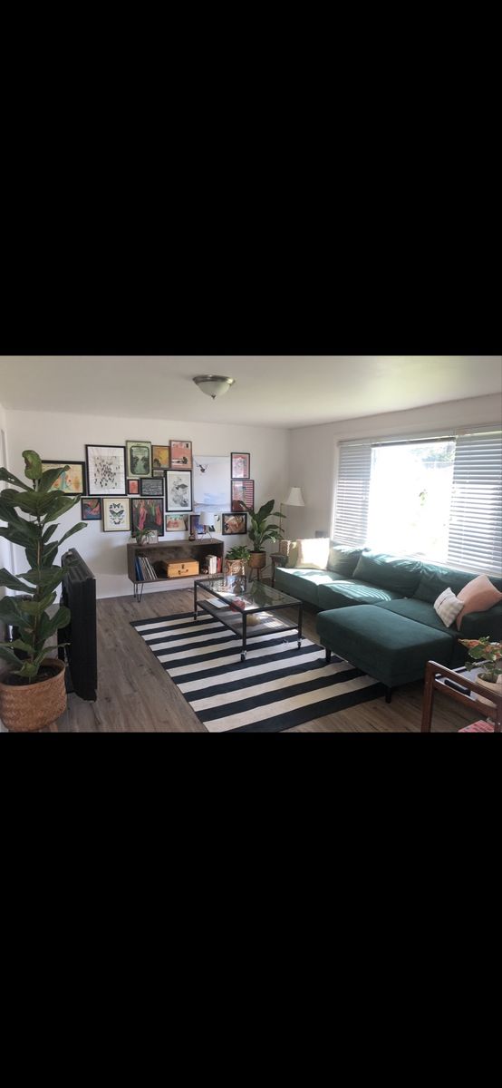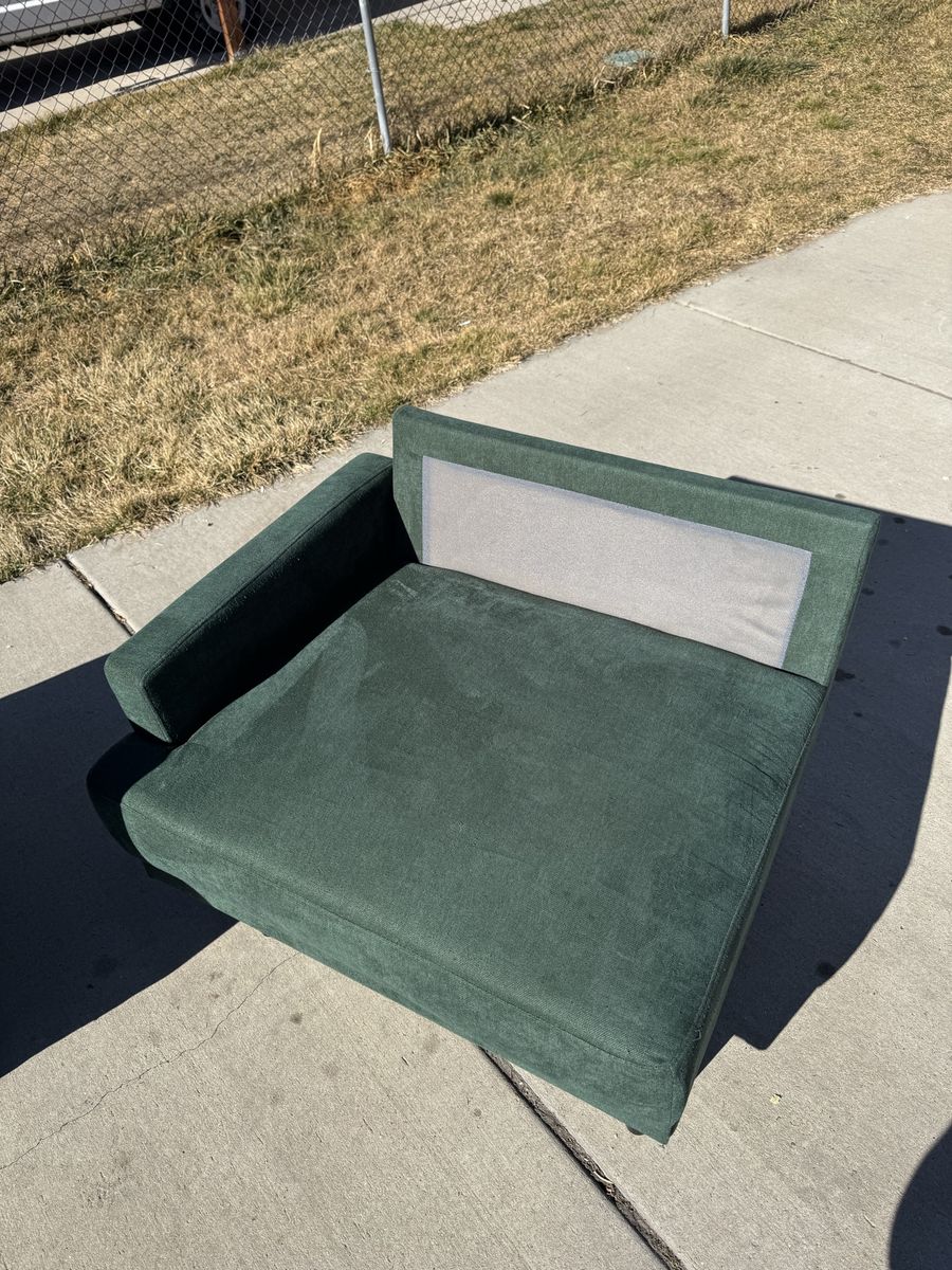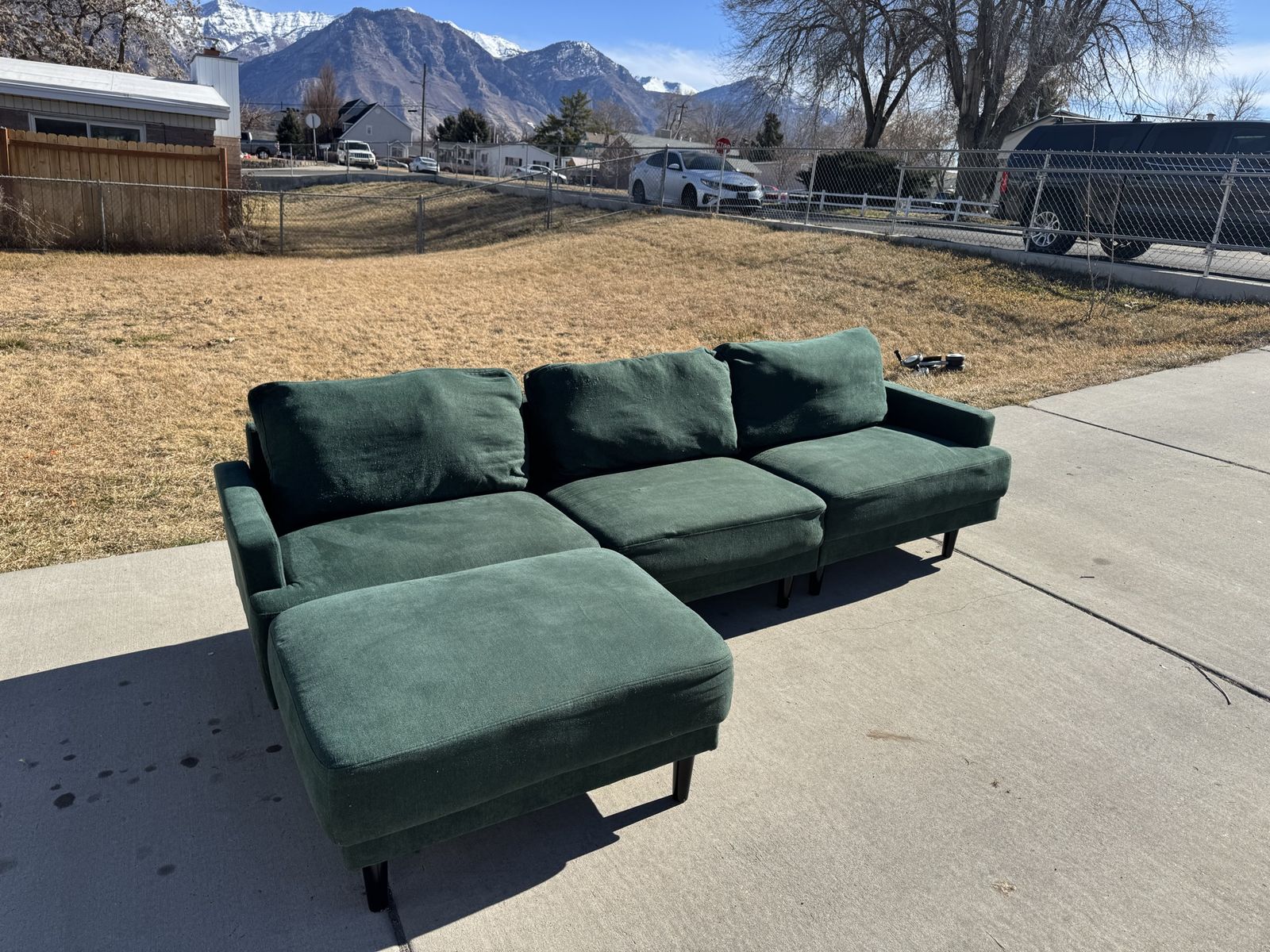 PayPalThe perfect green sectional couch! I love the color and style that this adds to the room. 3 pieces that lock together underneath and an ottoman that can move to any sections.