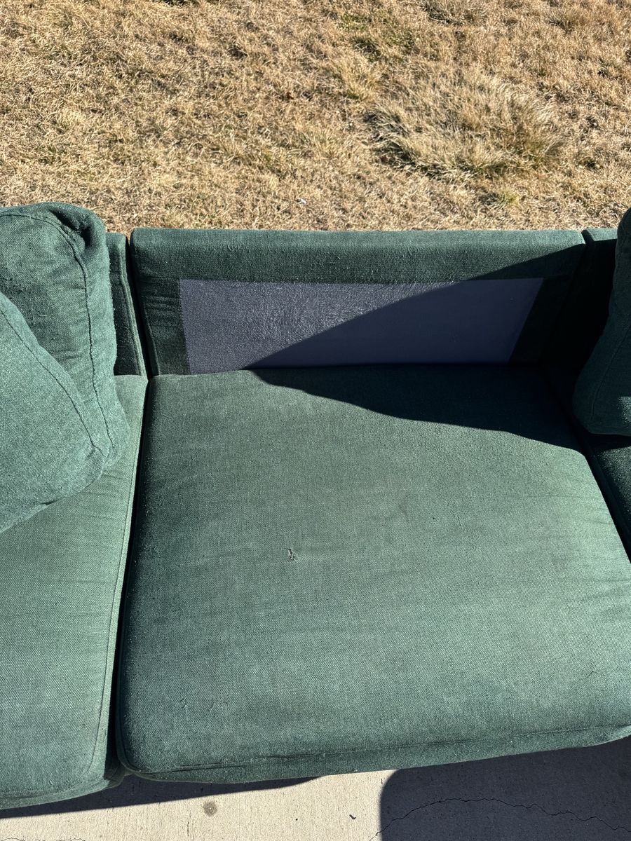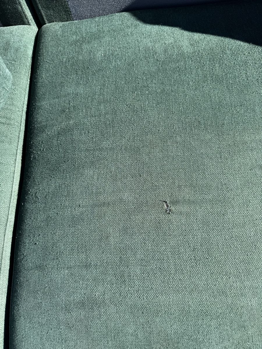 Has a small tear on middle cushion from a pocket knife as shown in picture. Some piling on the cushion covers but overall couch is in good condition.