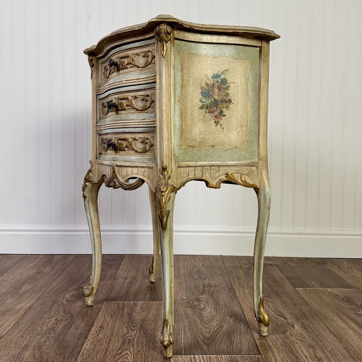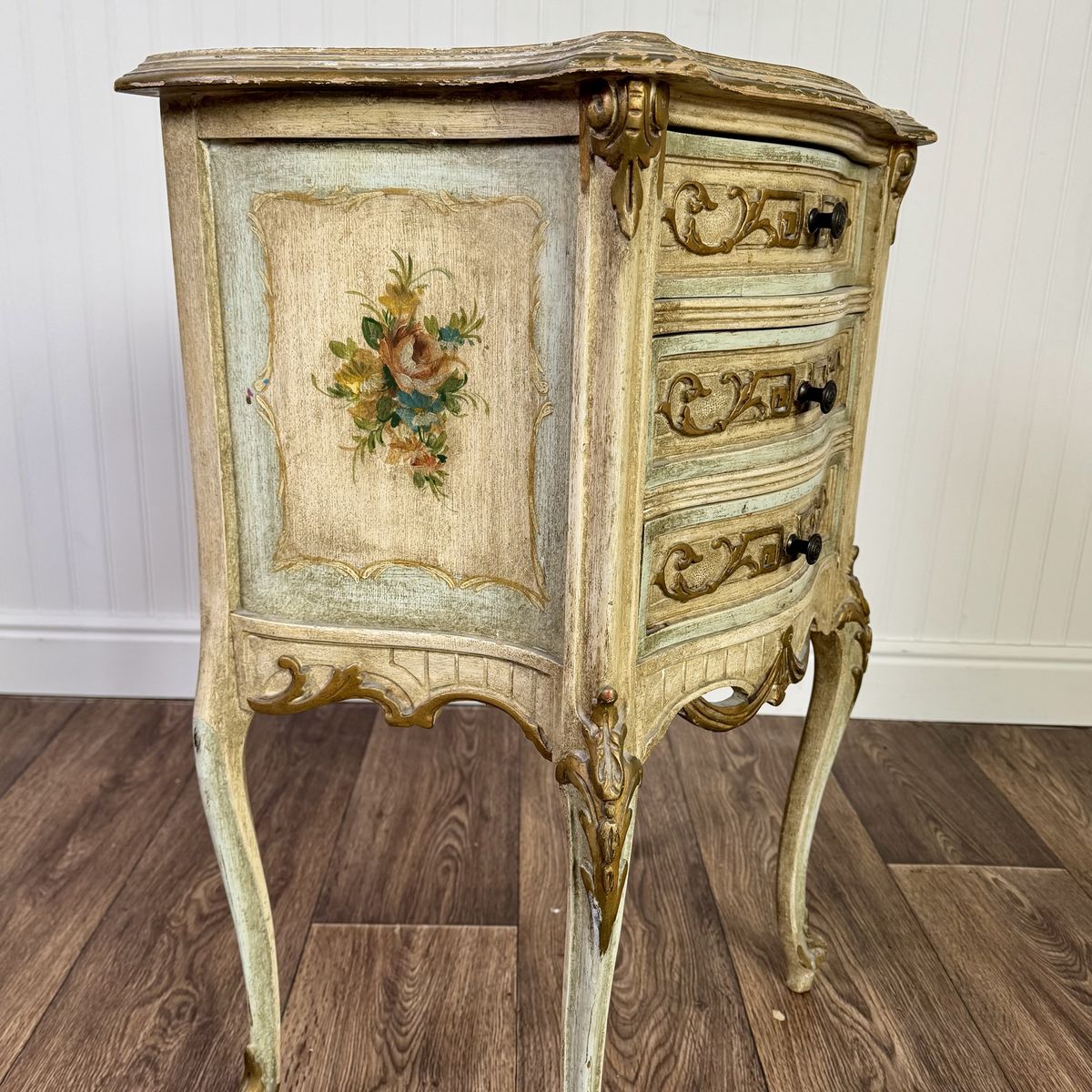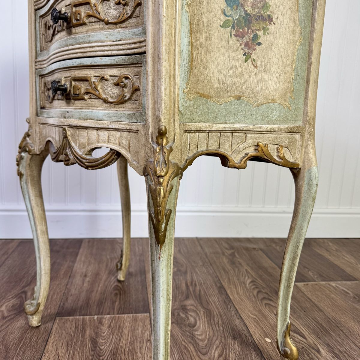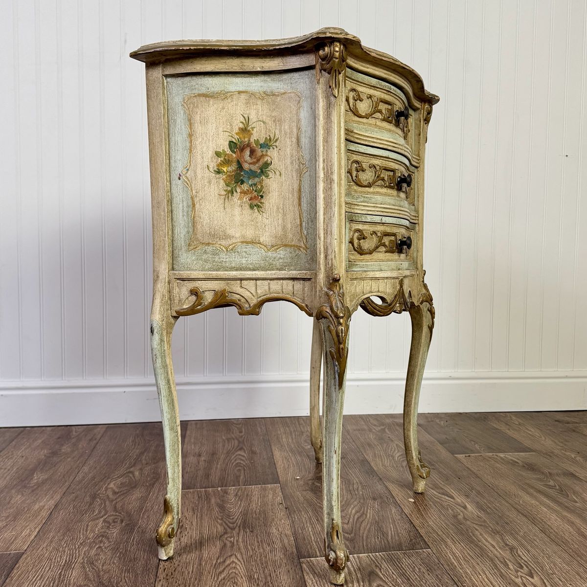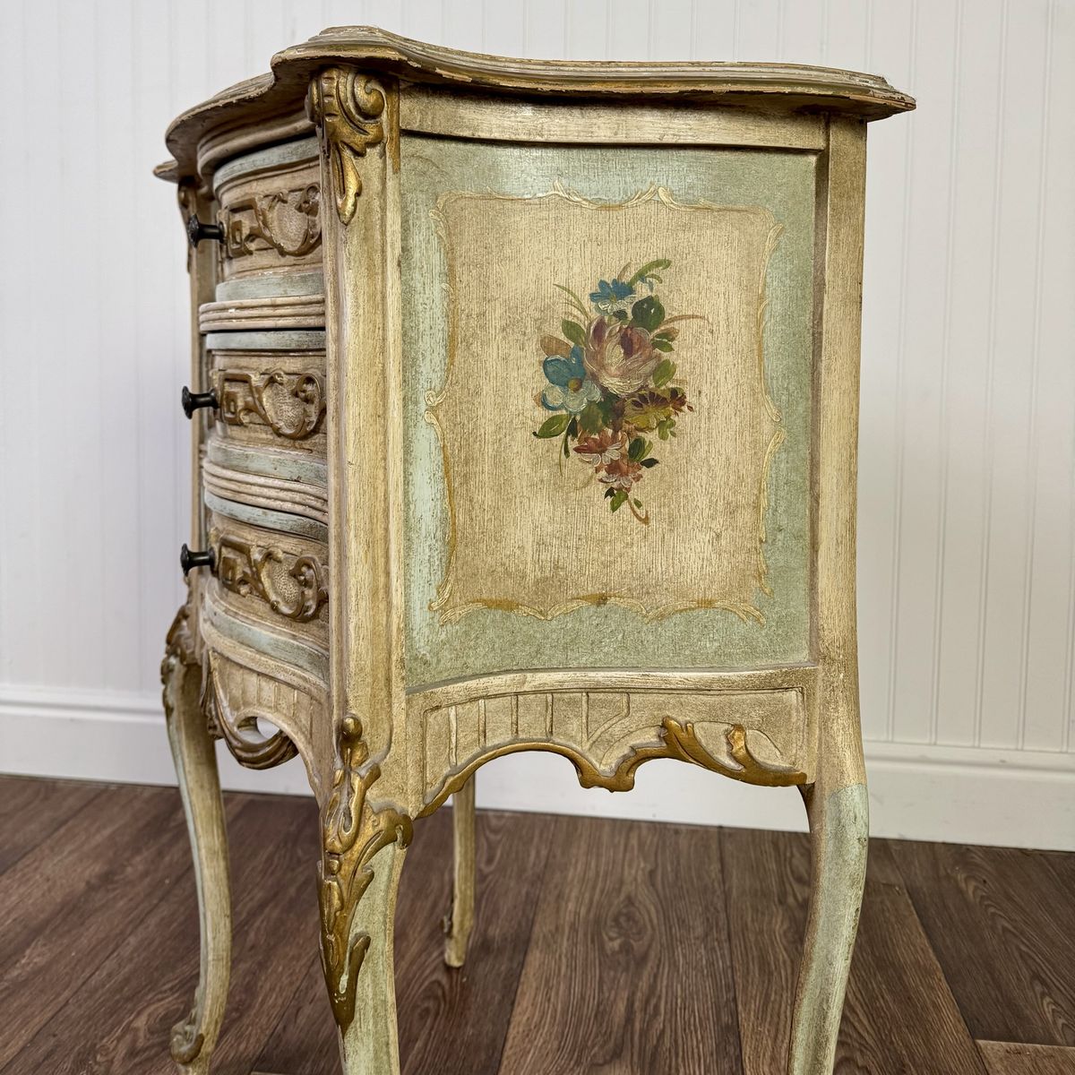VenmoCharming vintage Venetian-style petite chest featuring a romantic distressed finish in sage green and cream, accented with elegant gold leaf trim and hand-painted floral bouquets. This mid-century era piece has graceful cabriole legs and is adorned with ornate neoclassical carvings and original hardware.